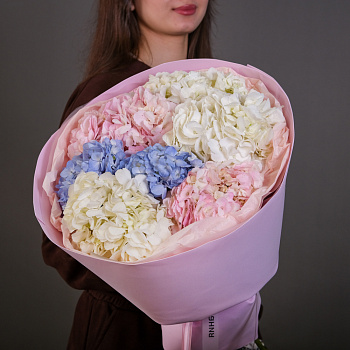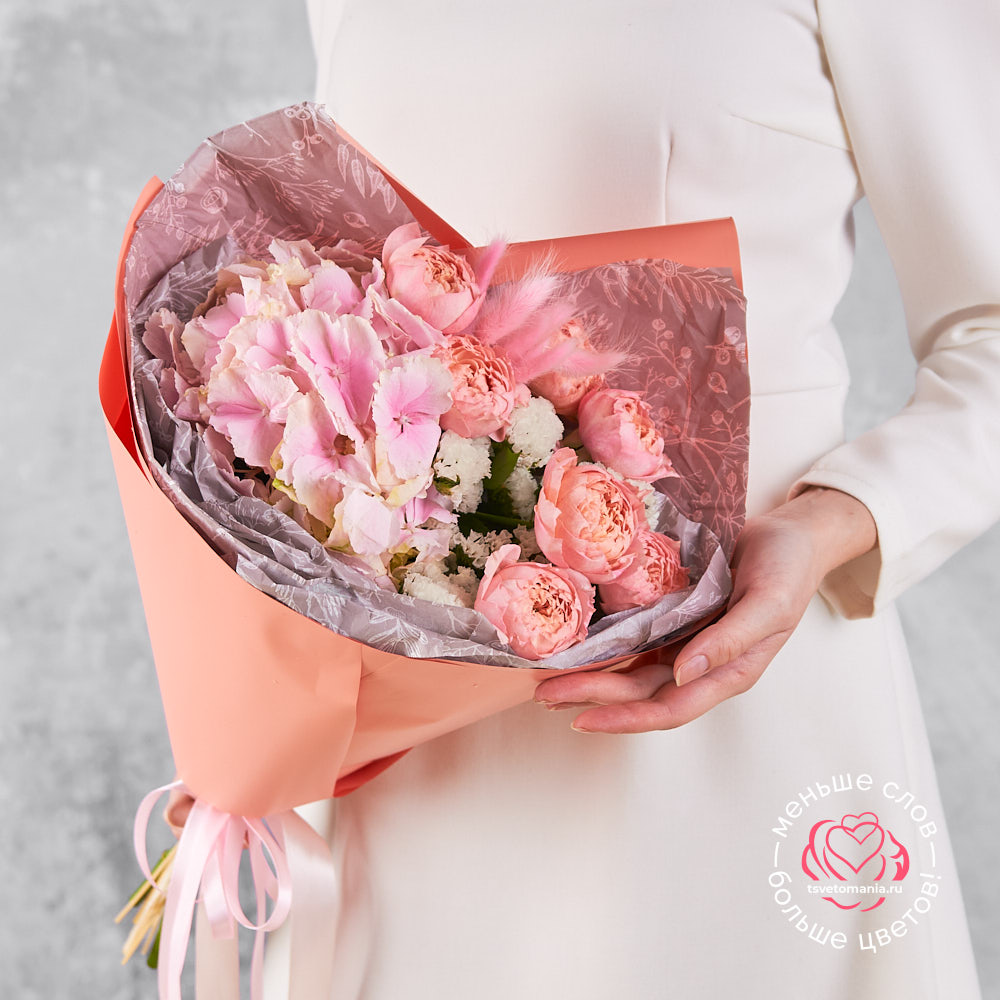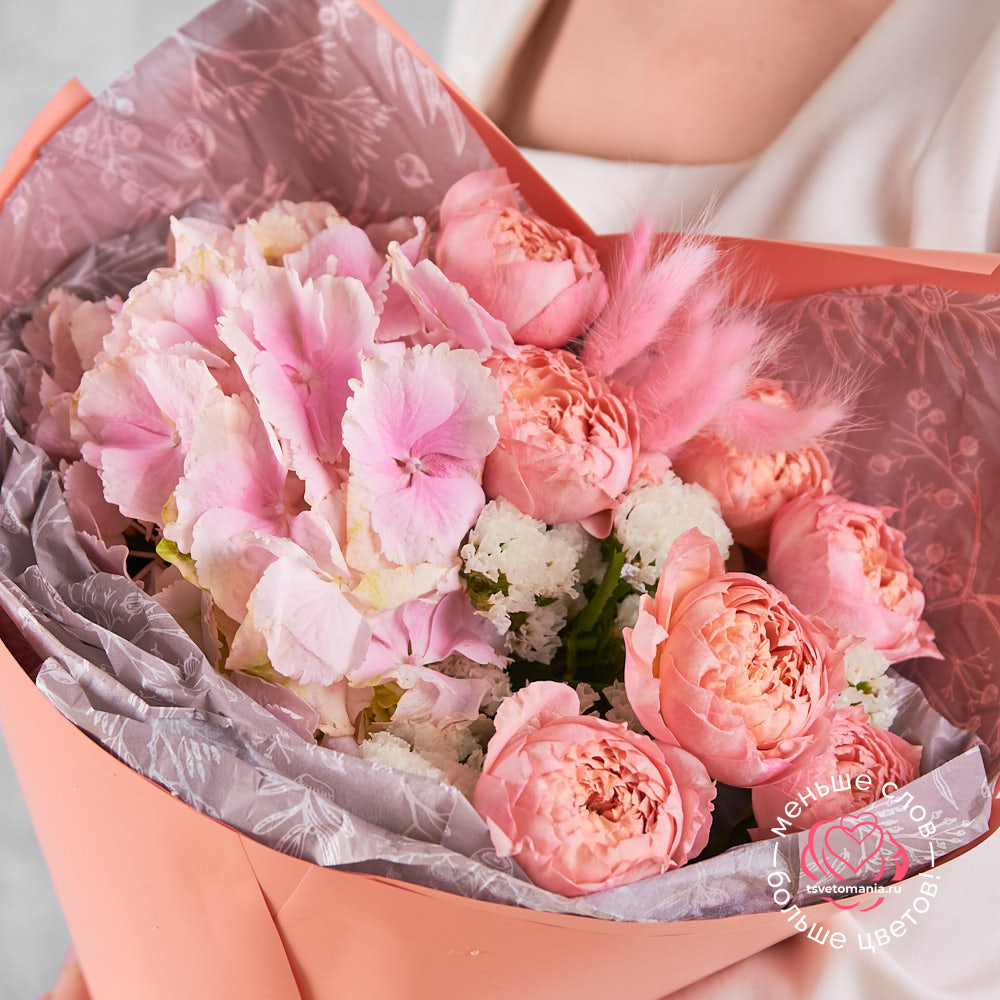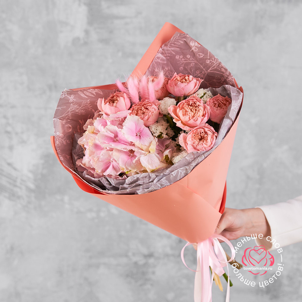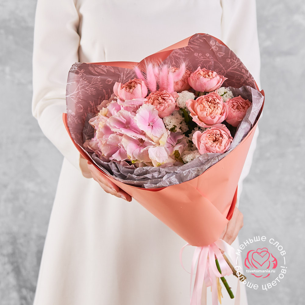 гортензия 1, роза кустовая джульетта 2, статица 2, лагурус 15, упаковка, лента