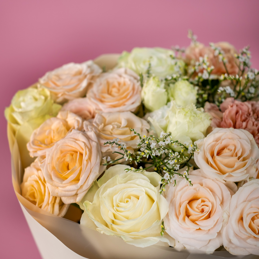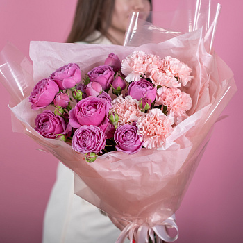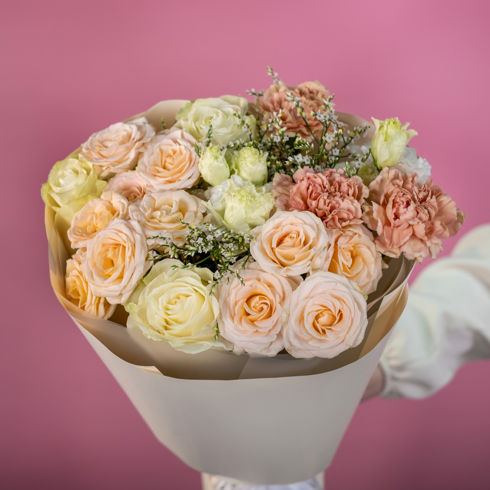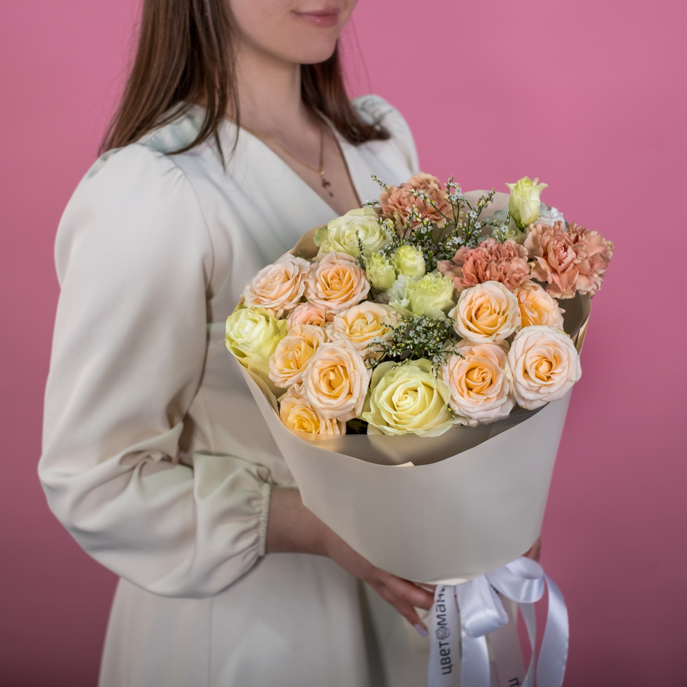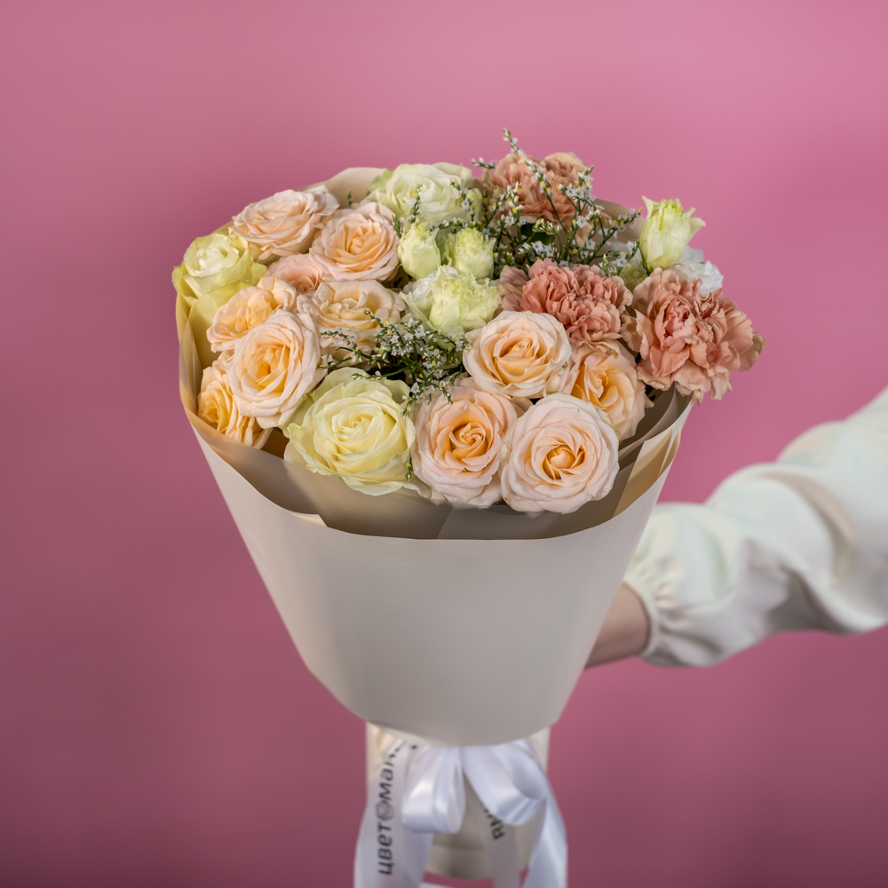 роза кустовая 3, роза эквадор 50 см 3, гвоздика 3, лимониум 2, пистач 3, эустома 2, упаковка, лента