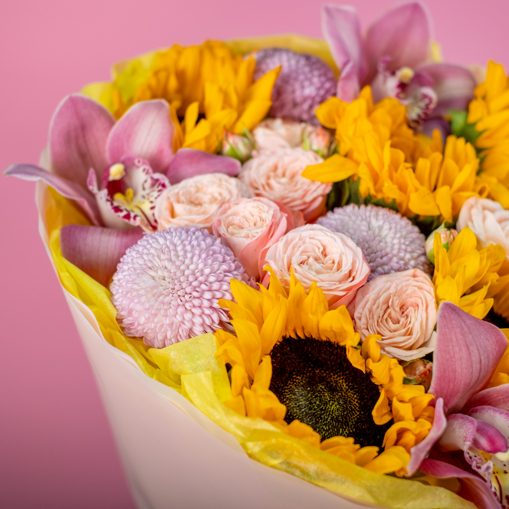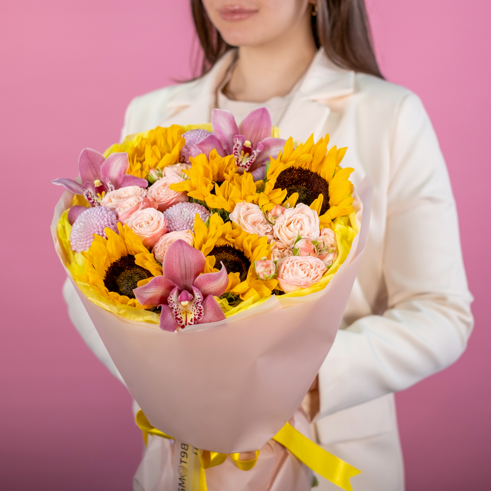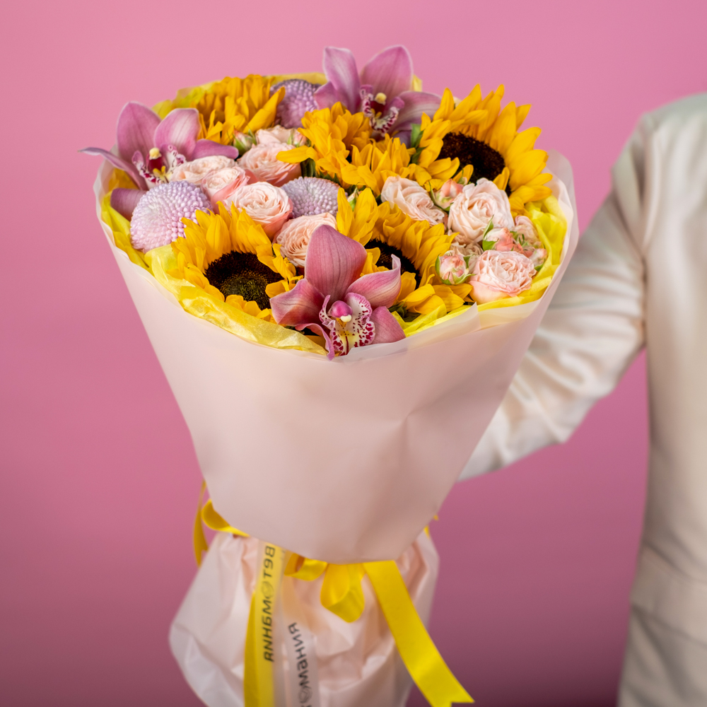 подсолнух 5, орхидея 3, хризантема одноголовая 3, мадам бомбастик 3, пистач 3, упаковка, лента