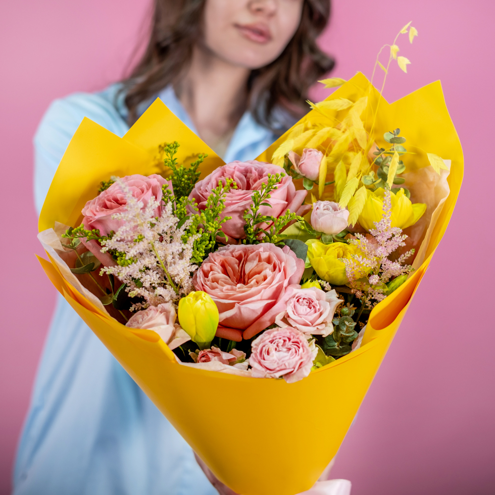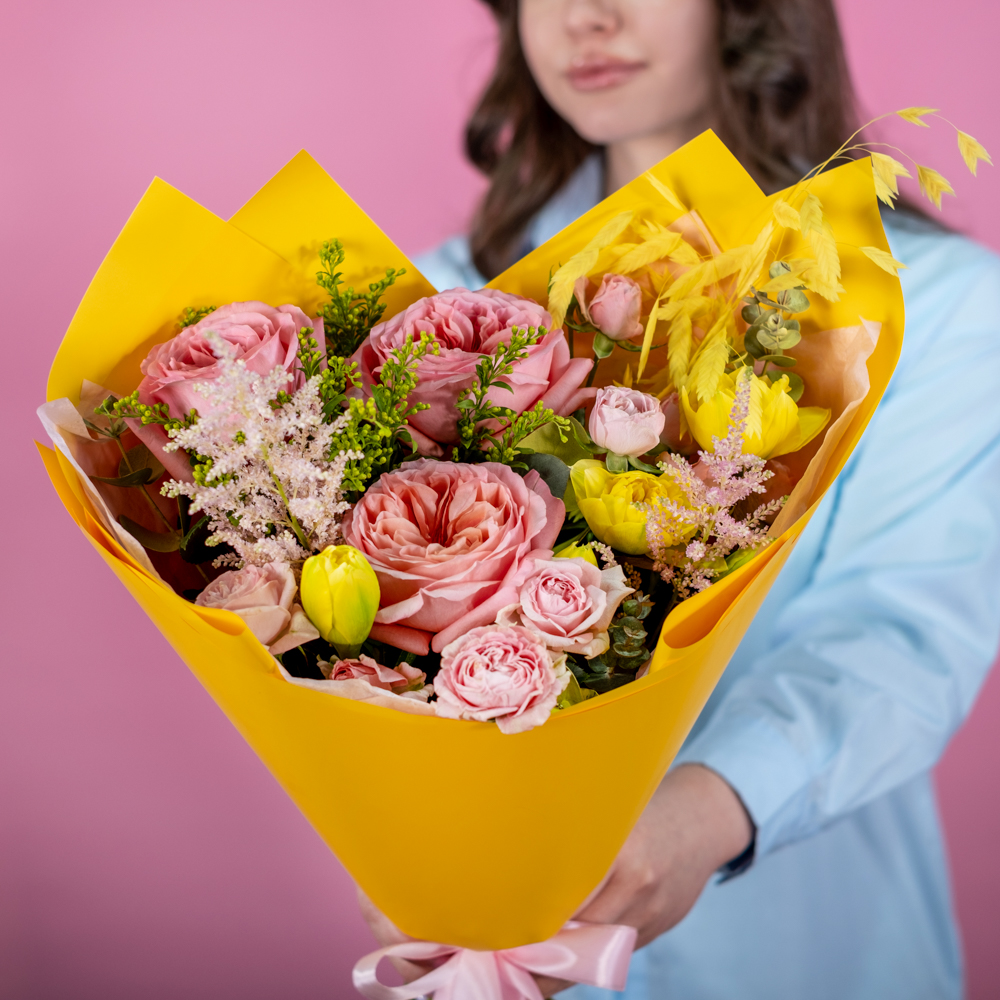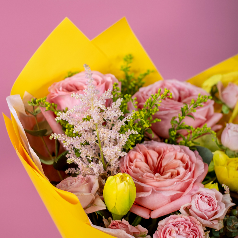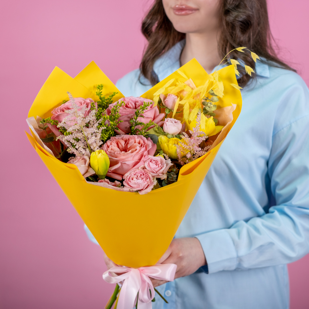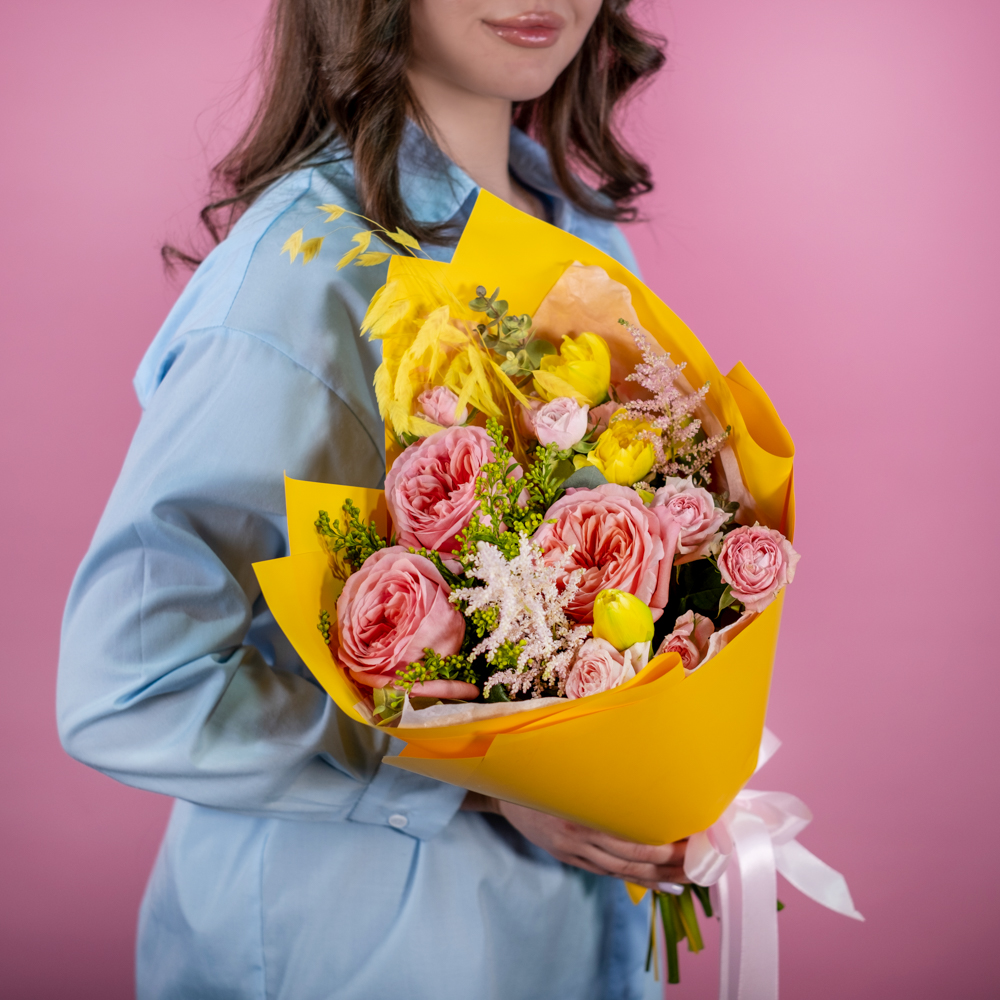 роза кустовая мадам бомбастик 2, нарцисс 5, солидаго 1, роза эквадор 50 см 3, эвкалипт 1, сухоцветы хасмантиум 3, астильба 2, упаковка, лента