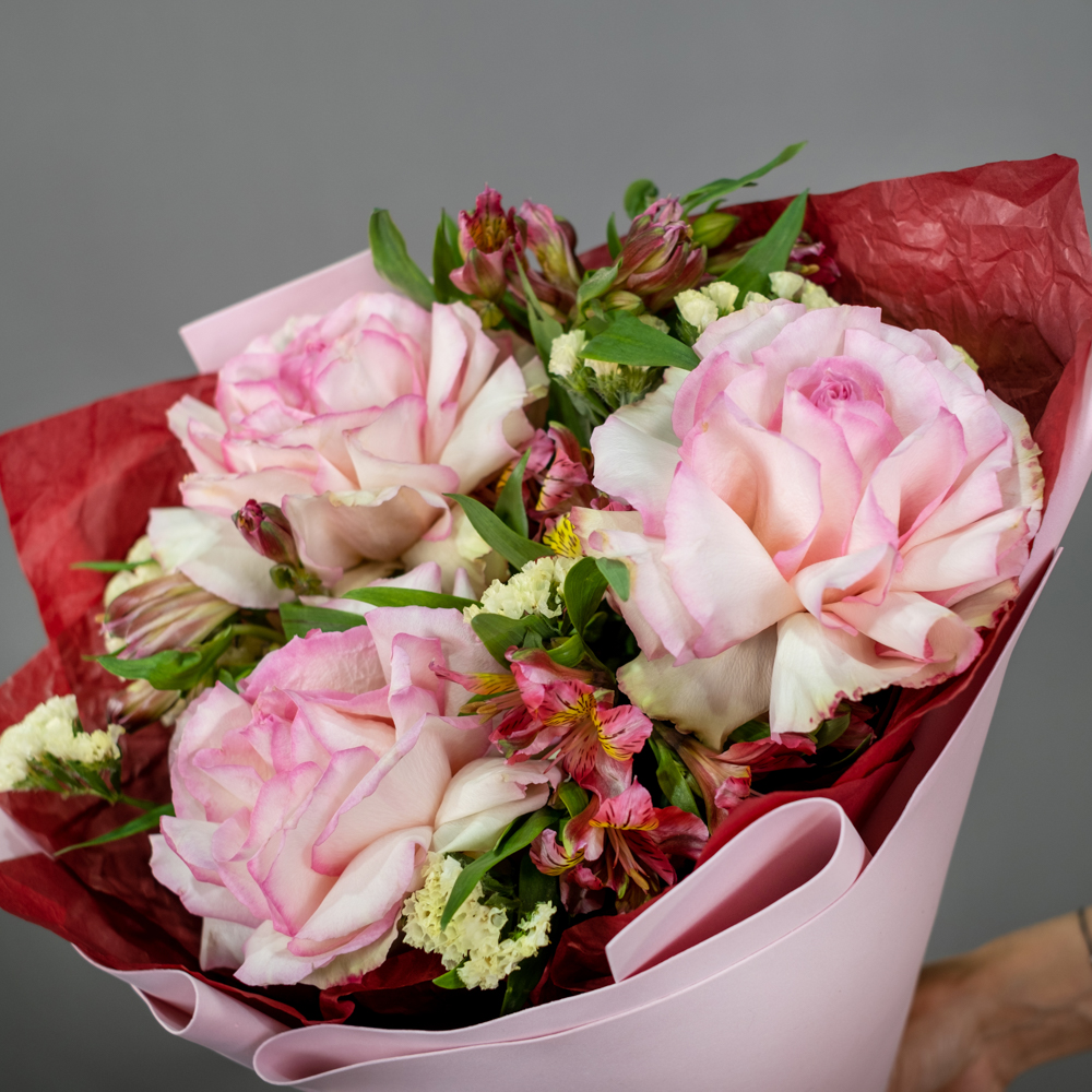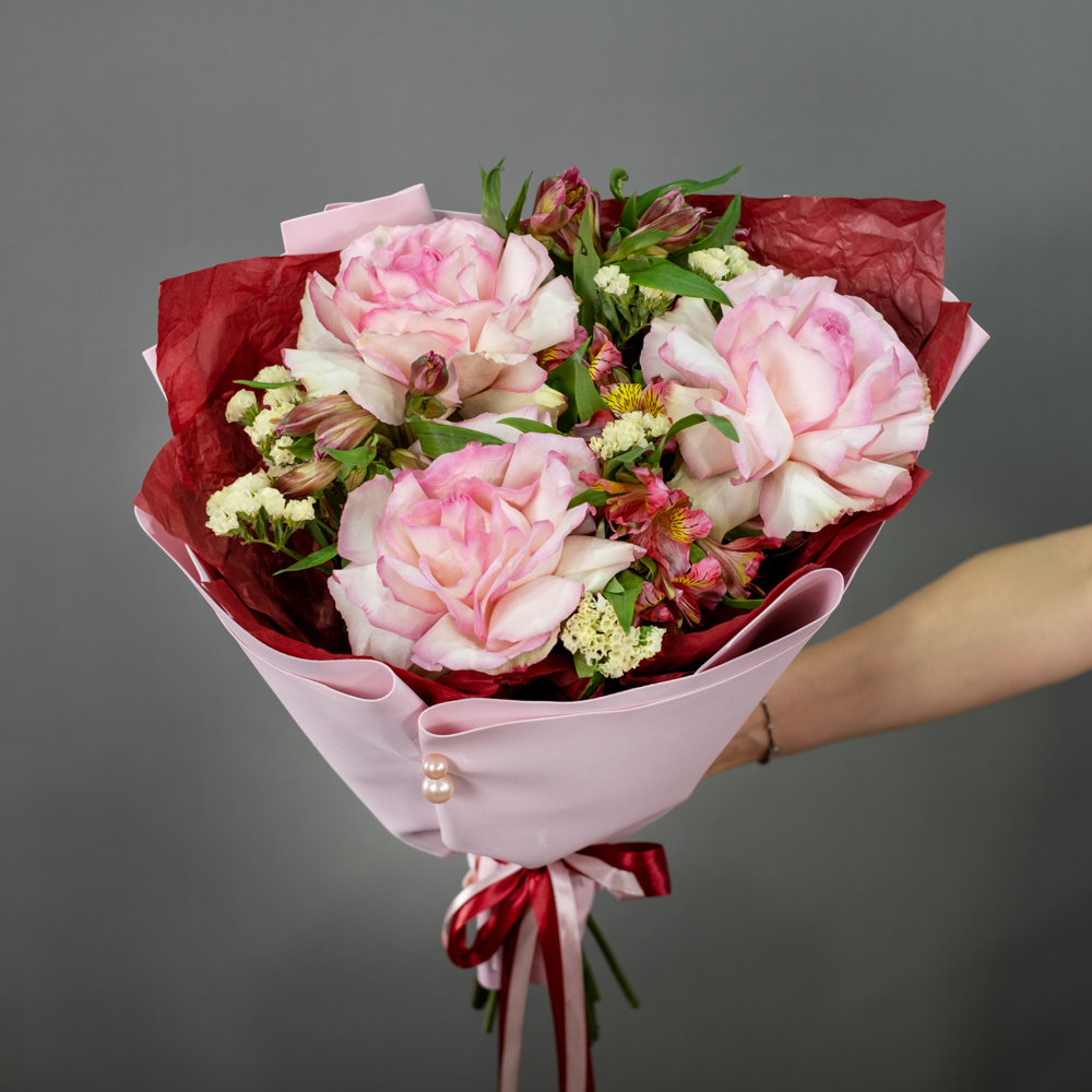 французская роза 3, статица 1, альстромерия 3, пистач 2, упаковка, лента, брошь