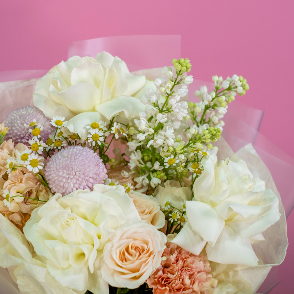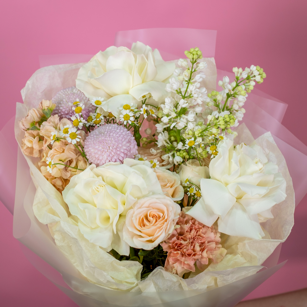 сирень 1, матрикария 2, хризантема стандарт 2, роза французская 3, роза кустовая 1, маттиола 1, гвоздика 1, пистач 3, упаковка, лента