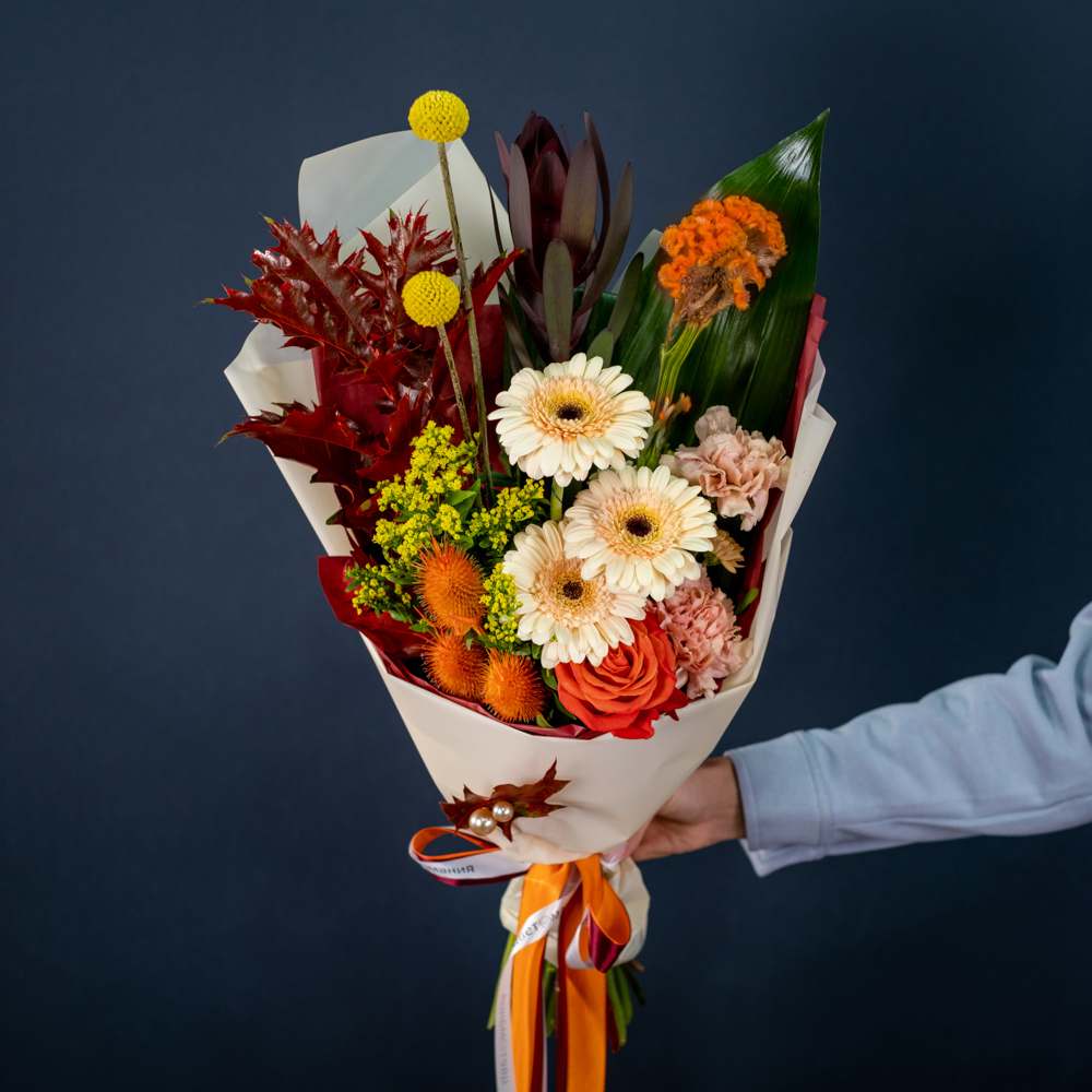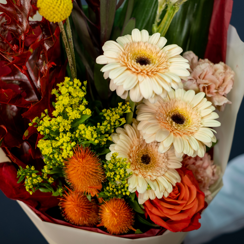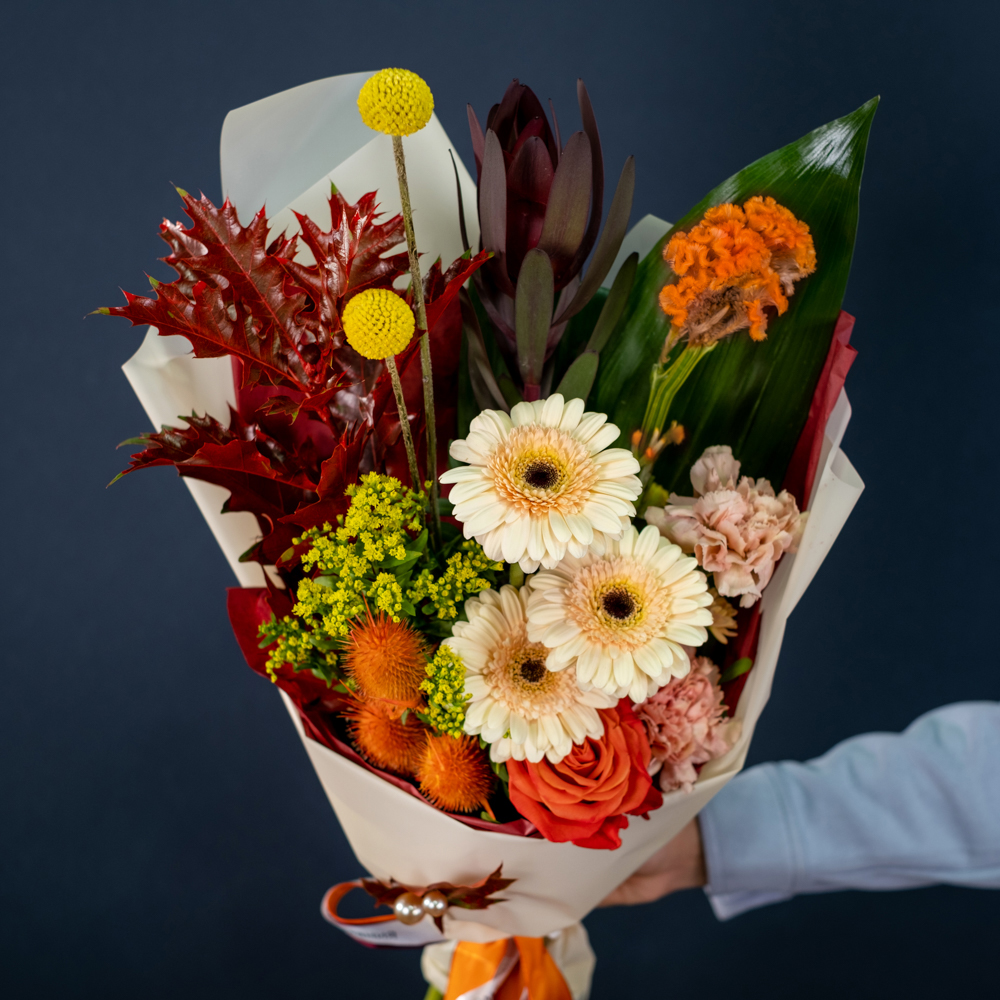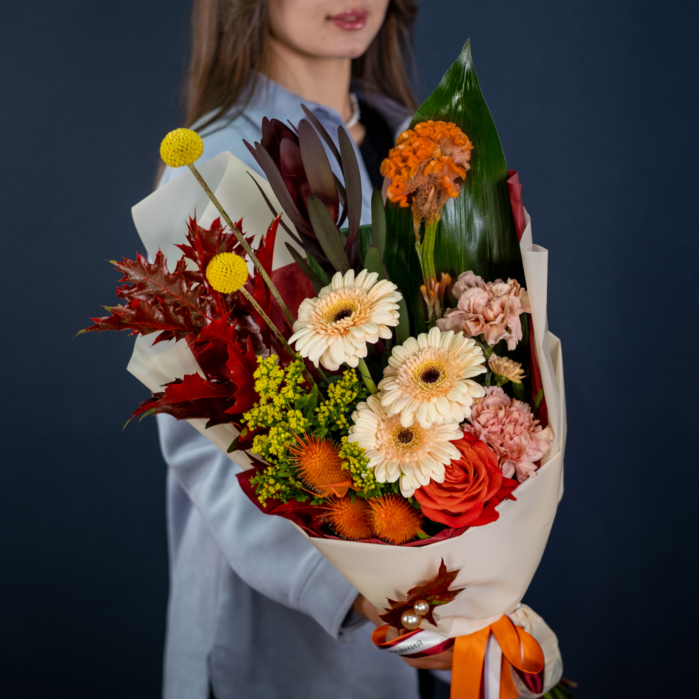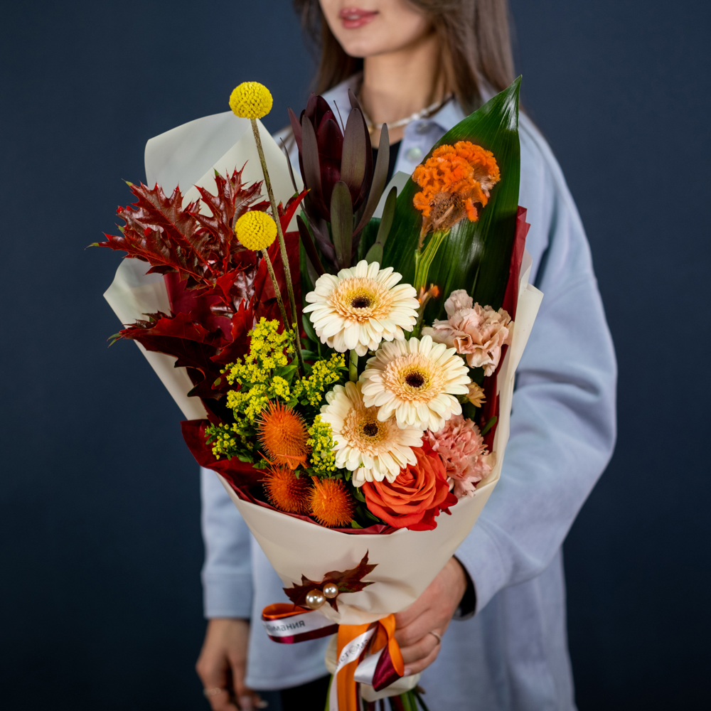 роза эквадор 50 см 1, гвоздика 2, сафари 1, краспедия 2, кверкус 1, целлозия 1, гербера мини 3, солидаго 1, аспидистра 2, пистач 1, ворсянка красная 2, брошь, упаковка, лента, аквабокс, сумочка
