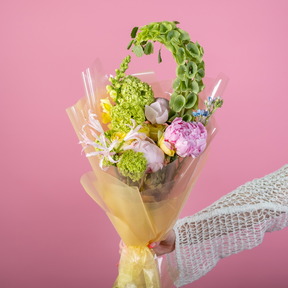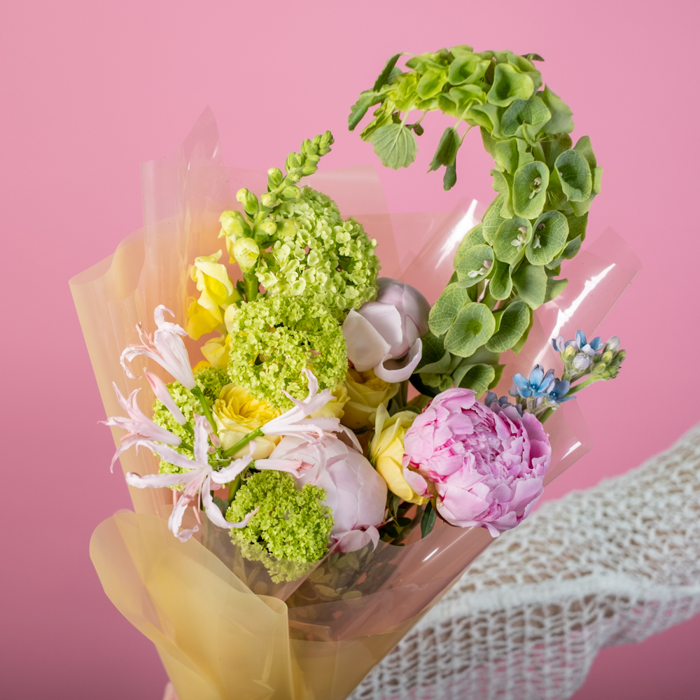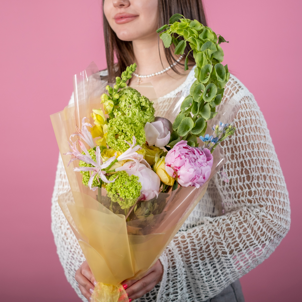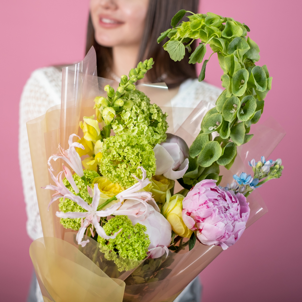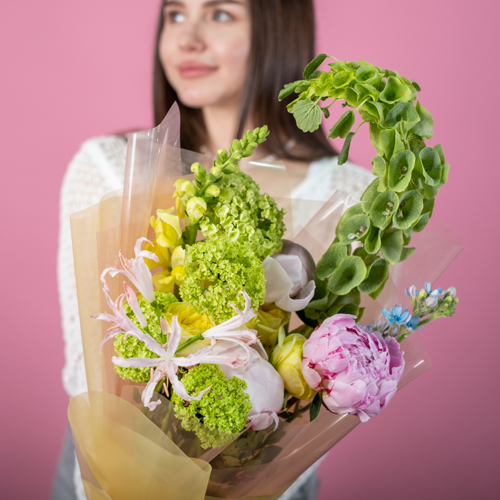 молюцела 1, пион 3, нерине 1, вибурнум 1, антирринум 1, оксипеталум 1, роза кустовая 1, фисташка 2, упаковка, лента