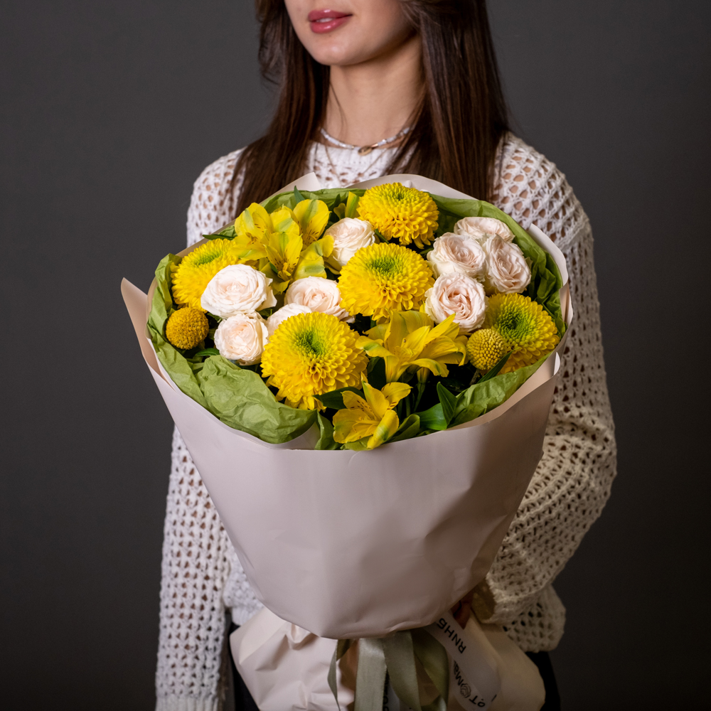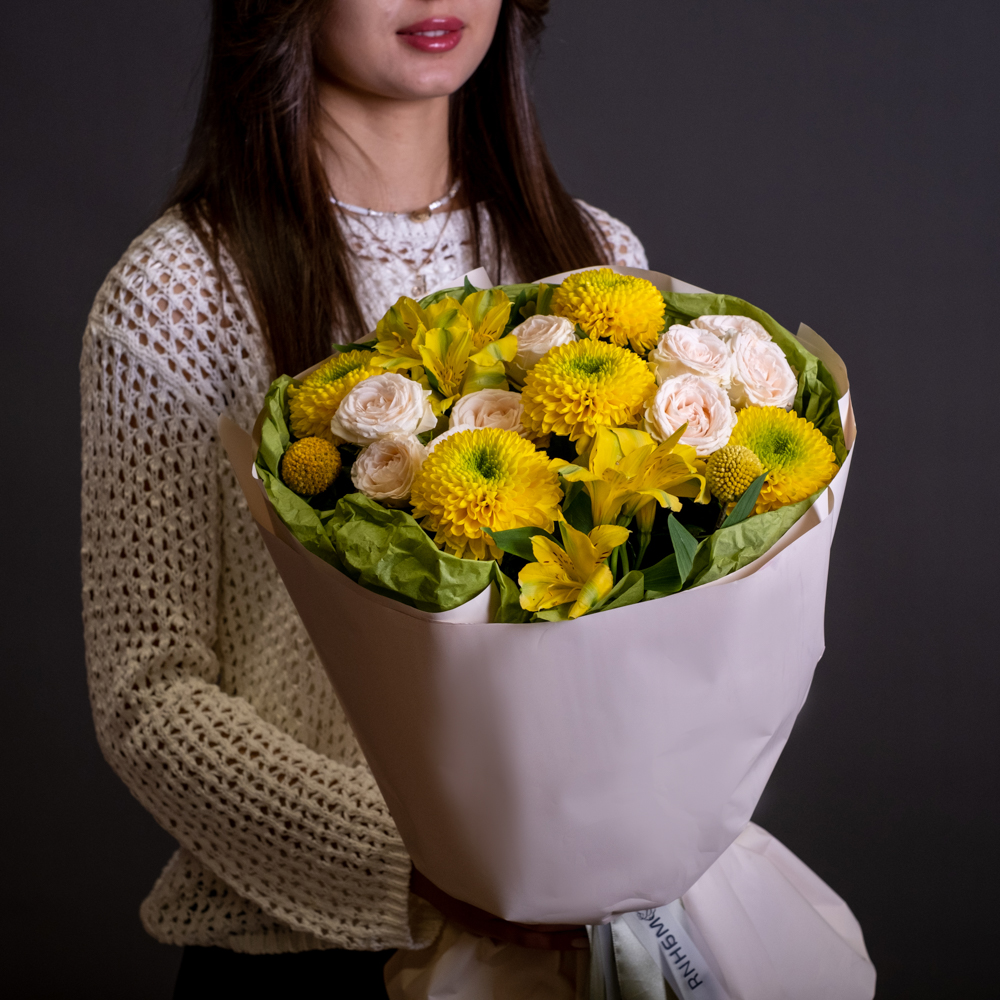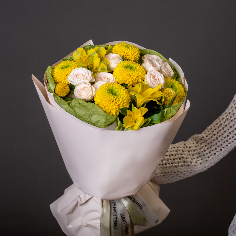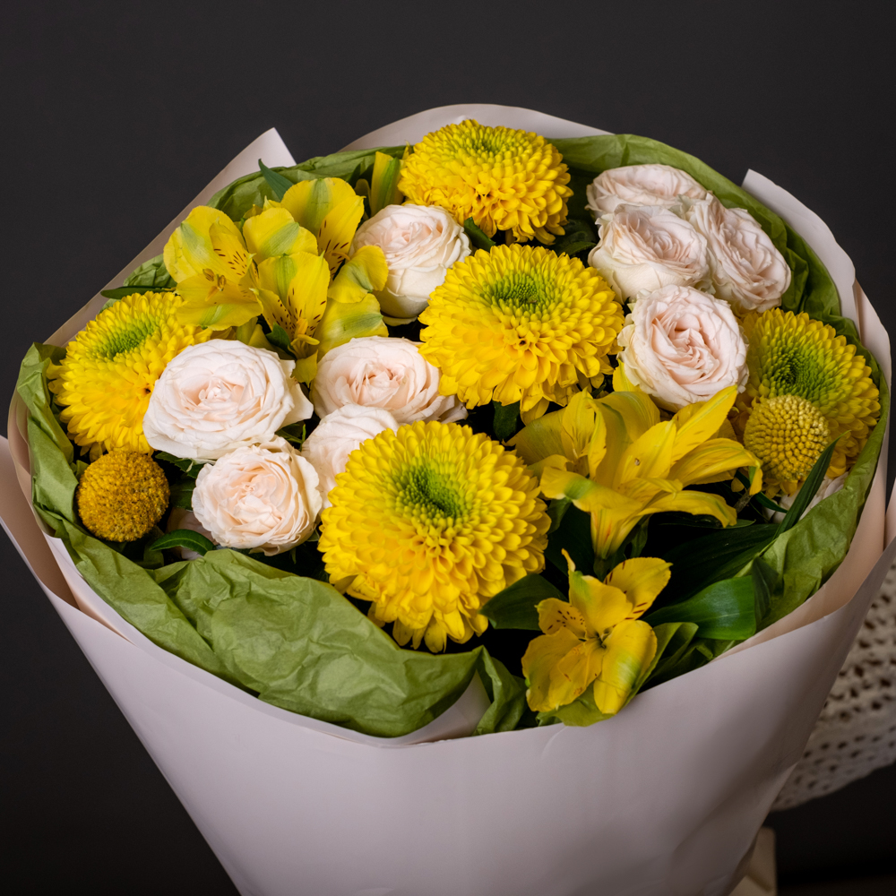 альстромерия 2, пистач 3, краспедия 2, хризантема стандартная 5, роза кустовая 2, упаковка, лента