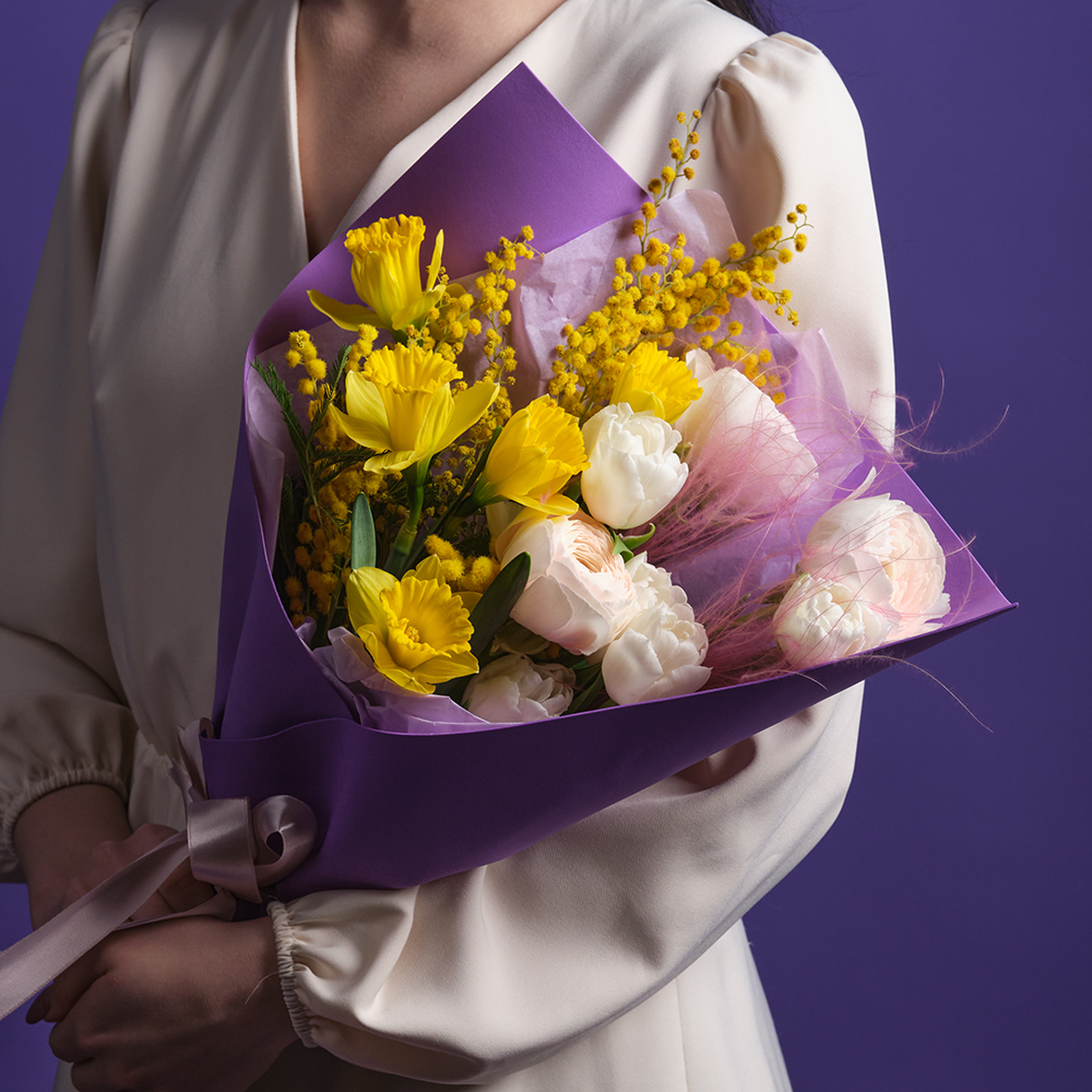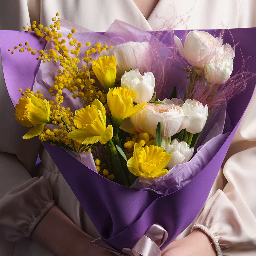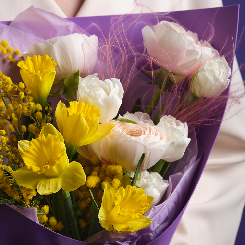 мимоза 1, ковыль 10, тюльпаны микс 5, нарцисс 5, ранункулюс 3, упаковка, лента