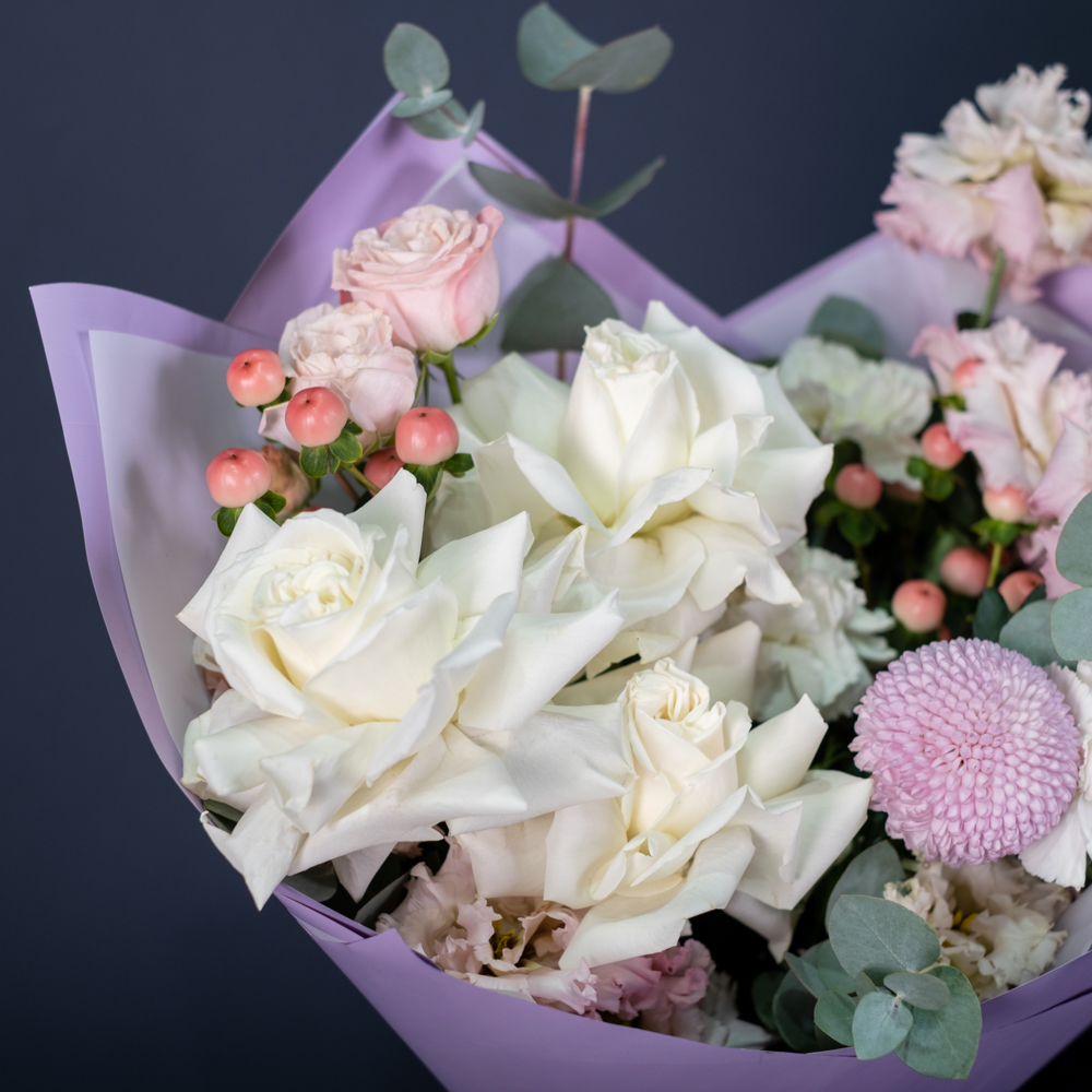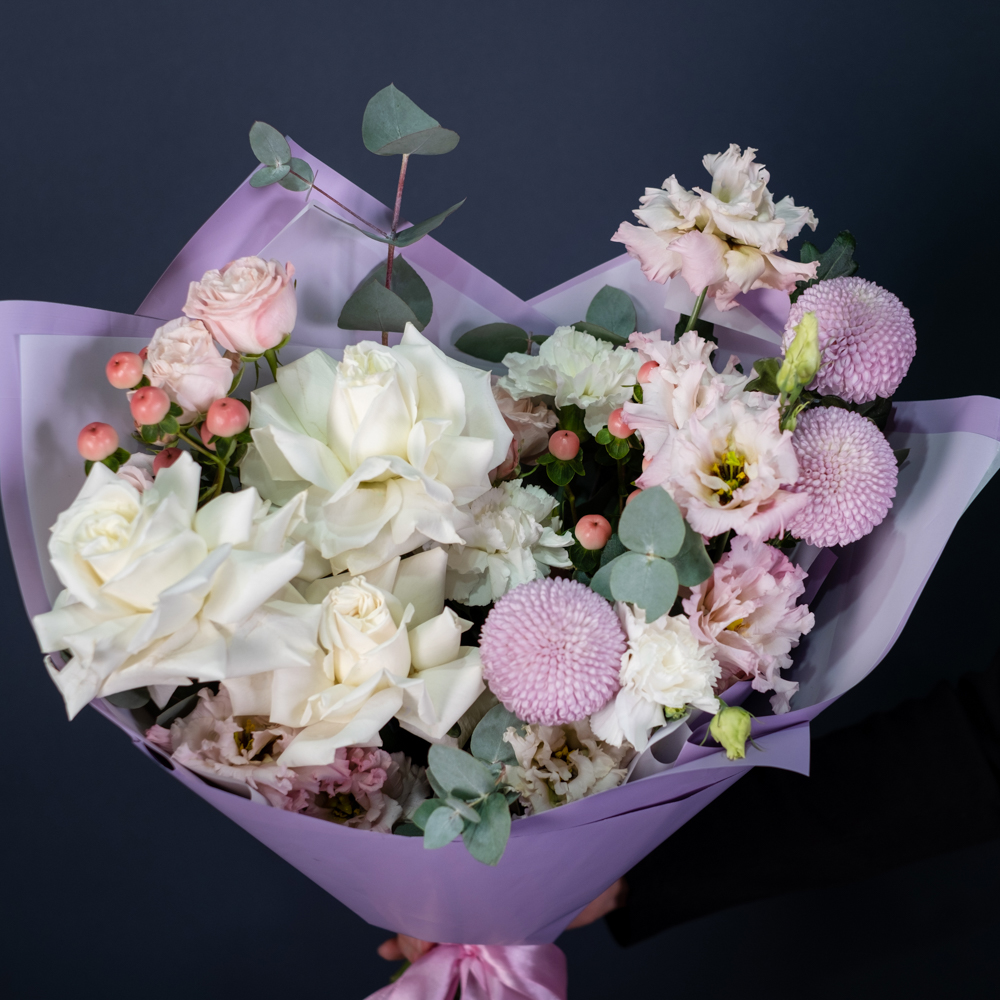 роза эквадор 50 см 3, роза кустовая мадам бомбастик 2, хризантема стандарт 3, гвоздика 3, гиперикум 2, эвкалипт 1, эустома 3, упаковка, лента