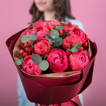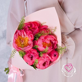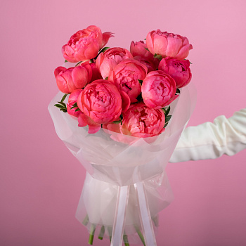 роза кустовая джульетта 3, пион премиум 8, лагурус 14, упаковка, лента