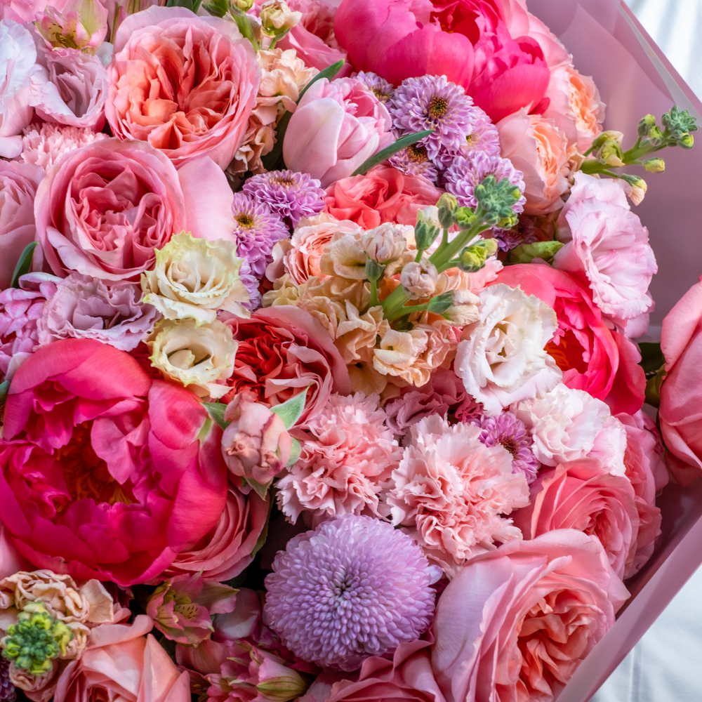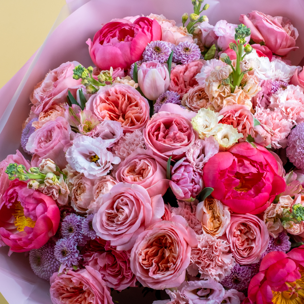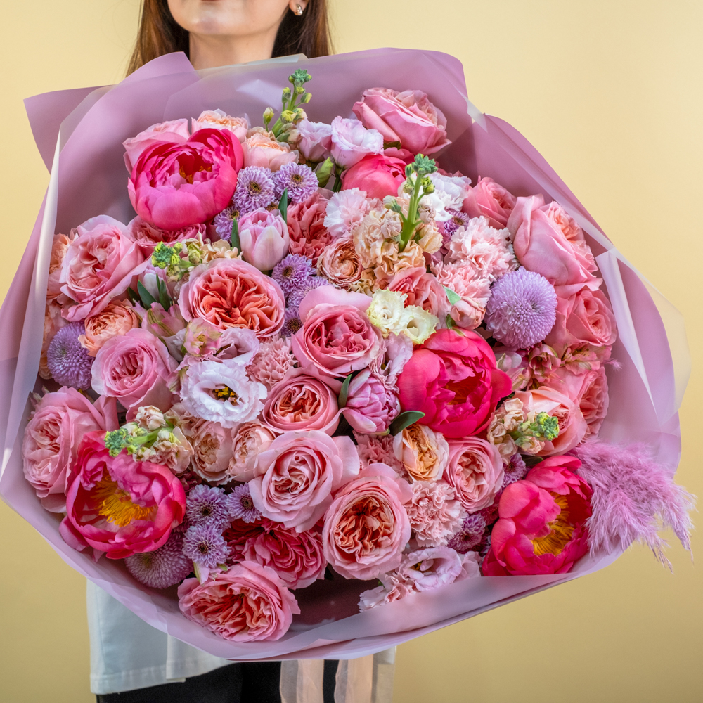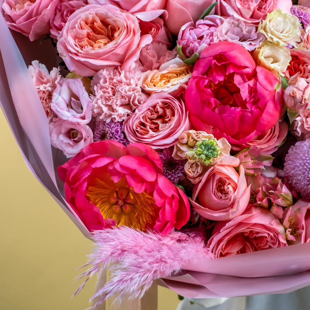 гвоздика стандарт 7, роза кустовая Джульетта 5, маттиола 5, альстромерия 5, пион 5, пистач 10, роза Эквадор 50 см 25, сухоцвет тростник 2, тюльпан 6, хризантема сантини 5, хризантема стандарт 3, эустома 5, упаковка, лента