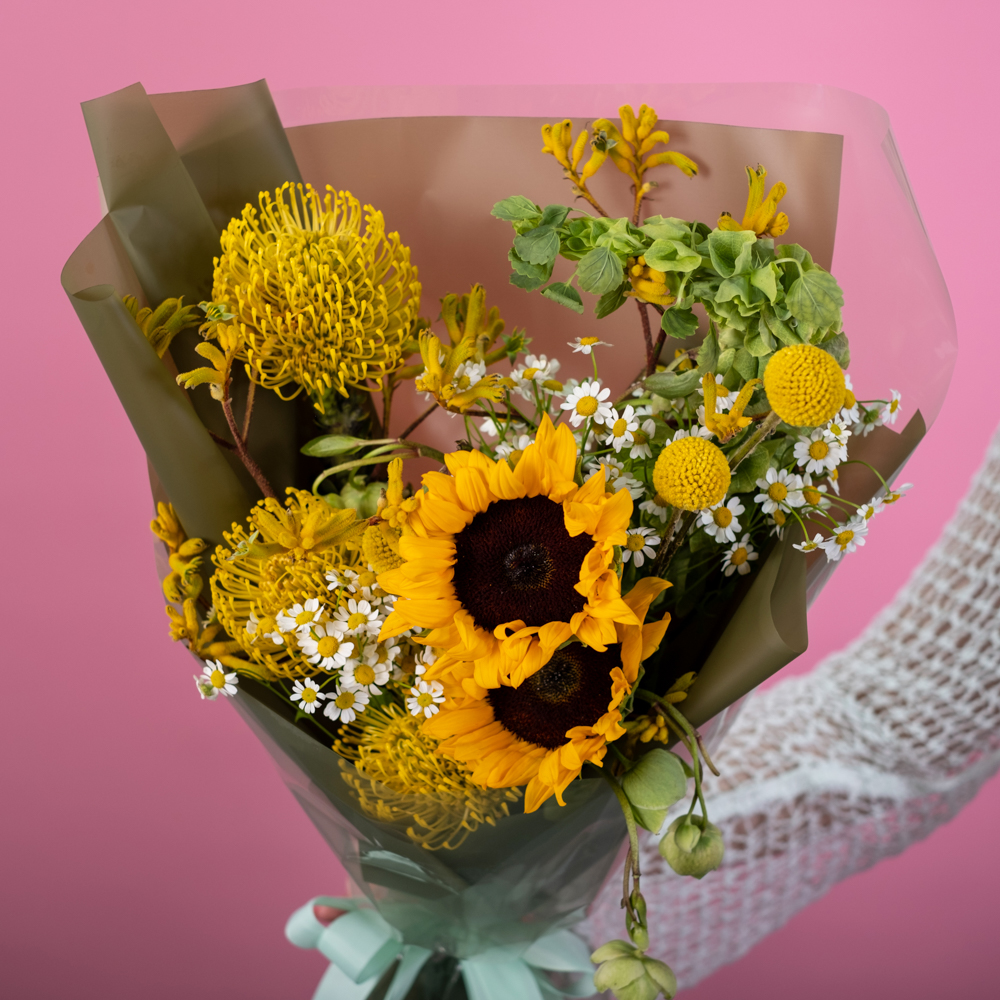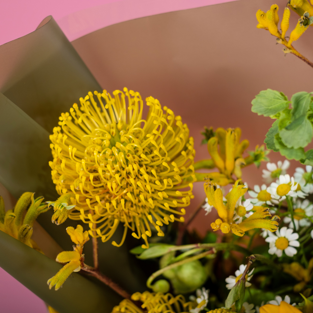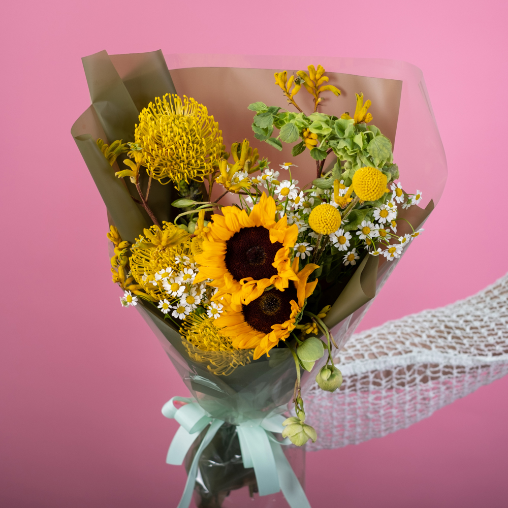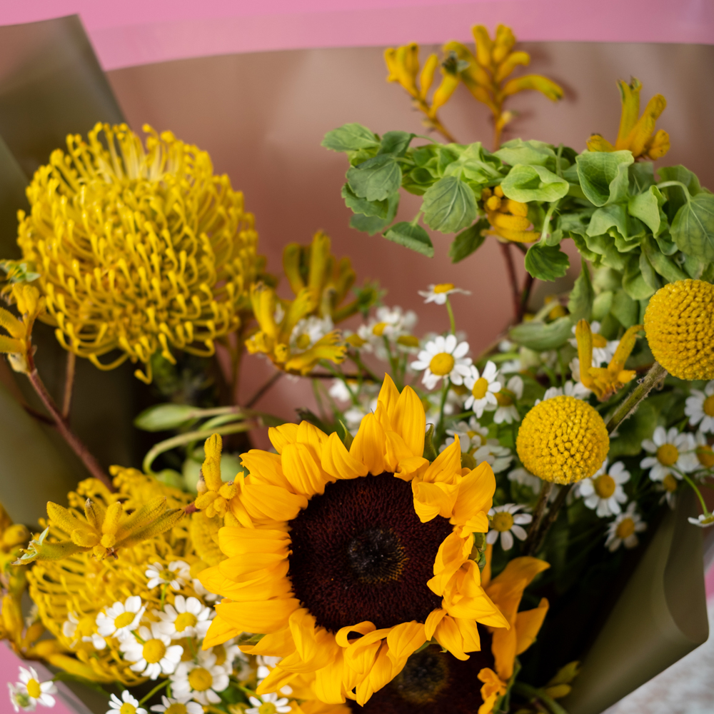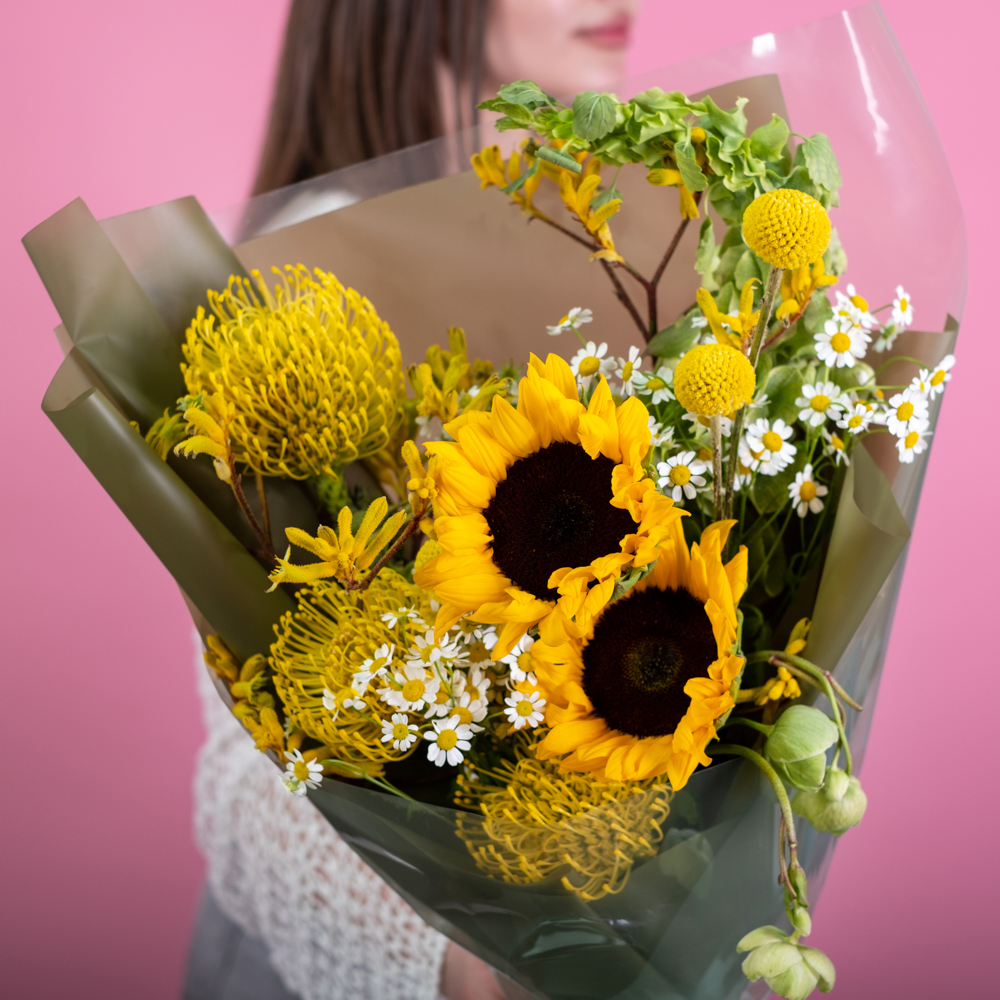 подсолнух 2, хелеборус 1, анигозантос 2, леукоспермум 3, матрикария 2, пистач 2, краспедия 3, молюцела 1, упаковка, лента