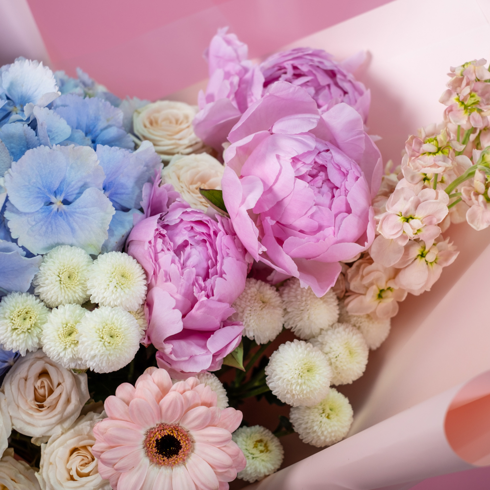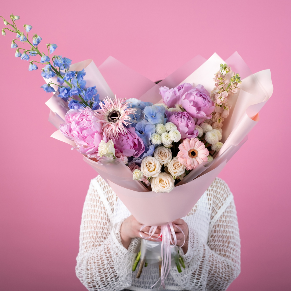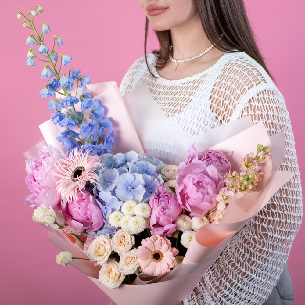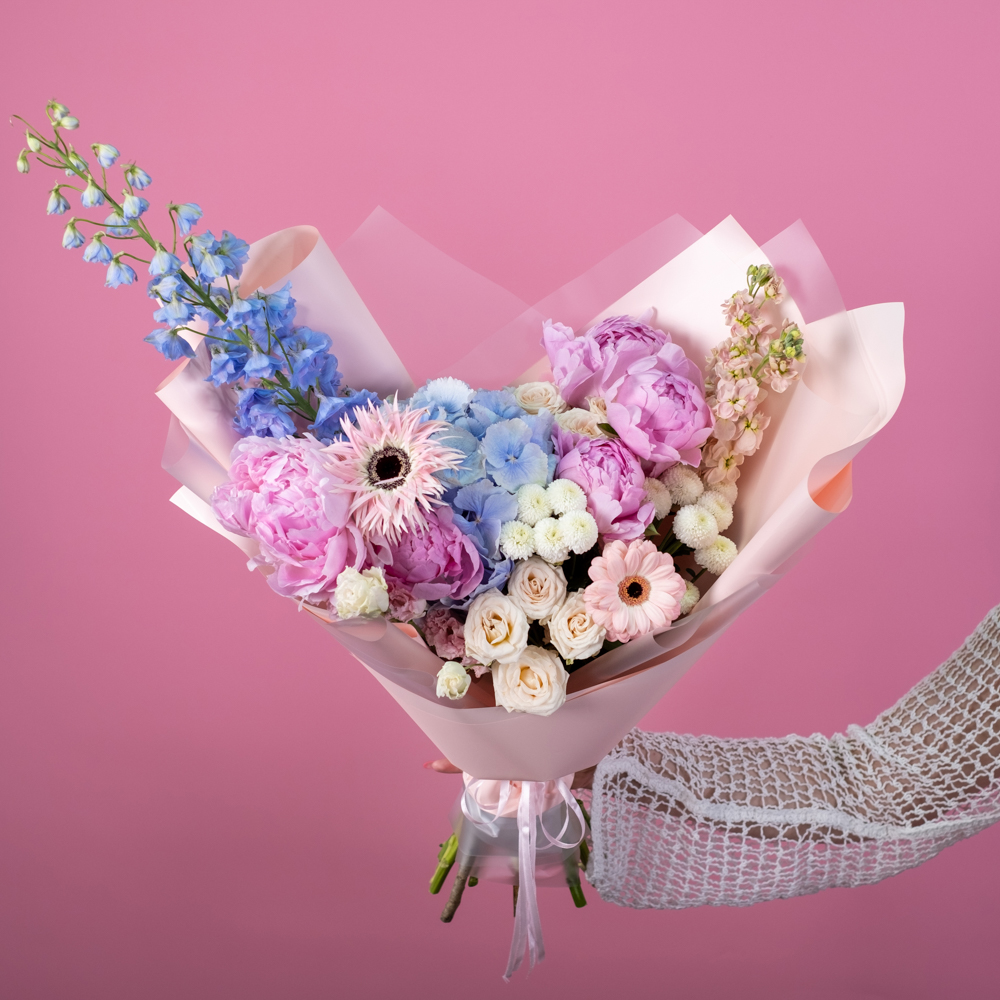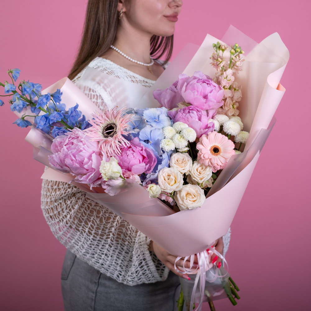 гортензия 1, пион 5, дельфиниум 1, маттиола 2, эустома 1, гербера 1, гербера мини 1, хризантема кустовая 1, пистач 1, кустовая роза морнинг стар 2, упаковка, лента