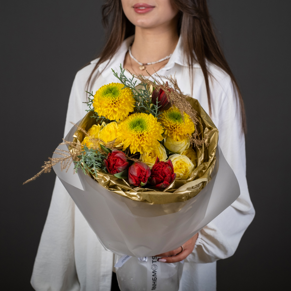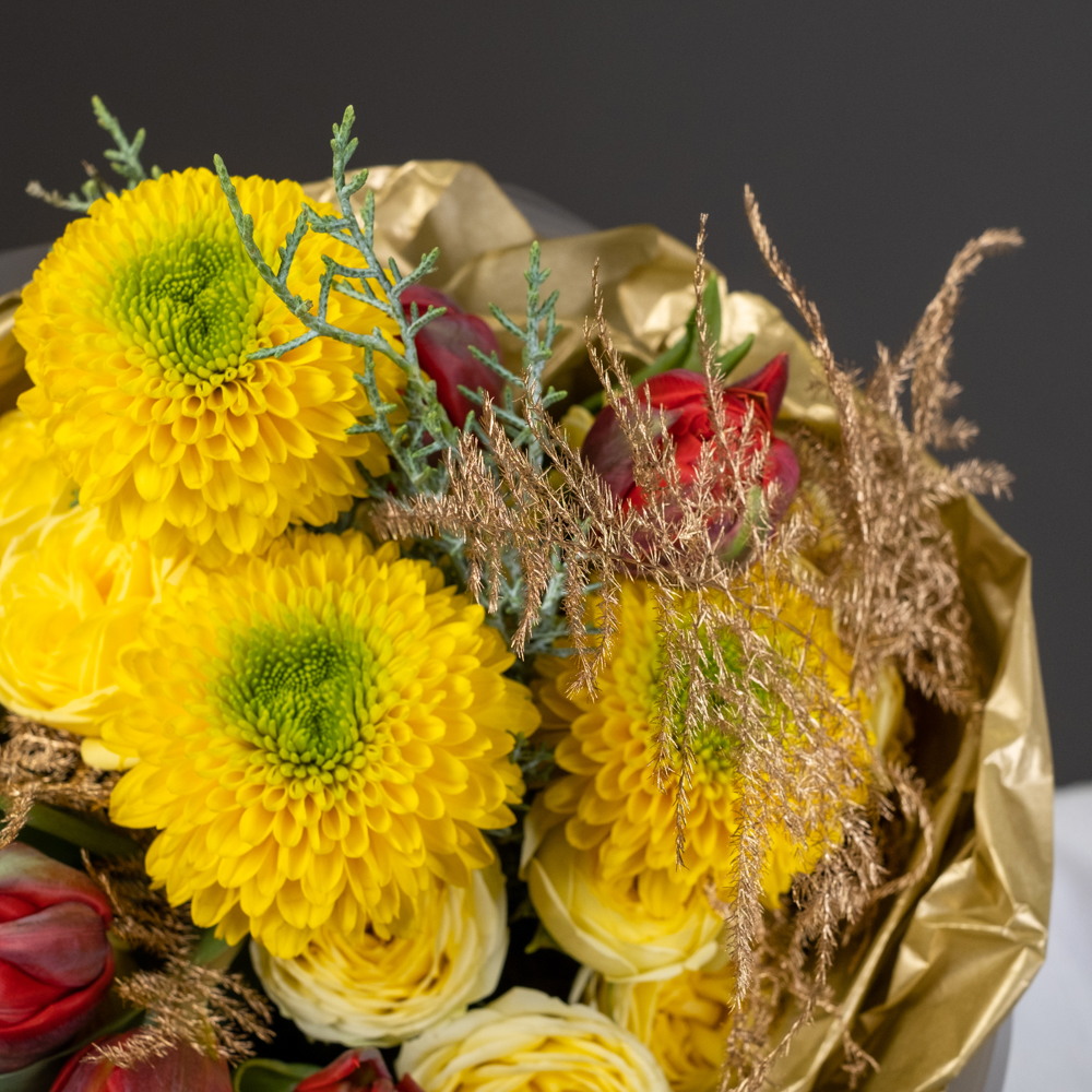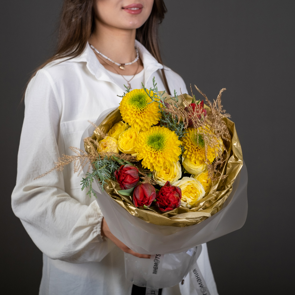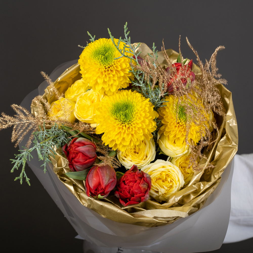 хризантема стандарт 3, тюльпан 5, кустовая роза 3, кипарис 1, аспарагус голд 2, упаковка, лента