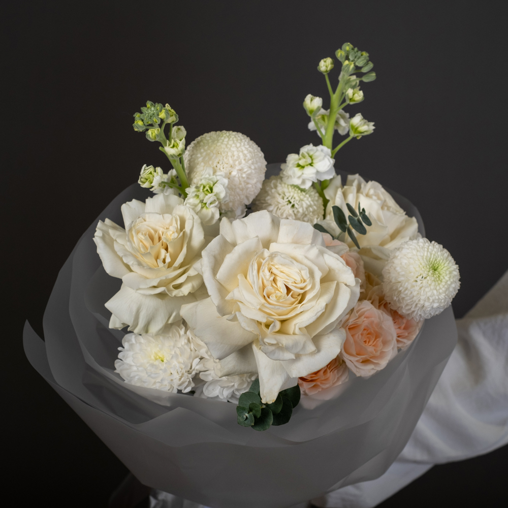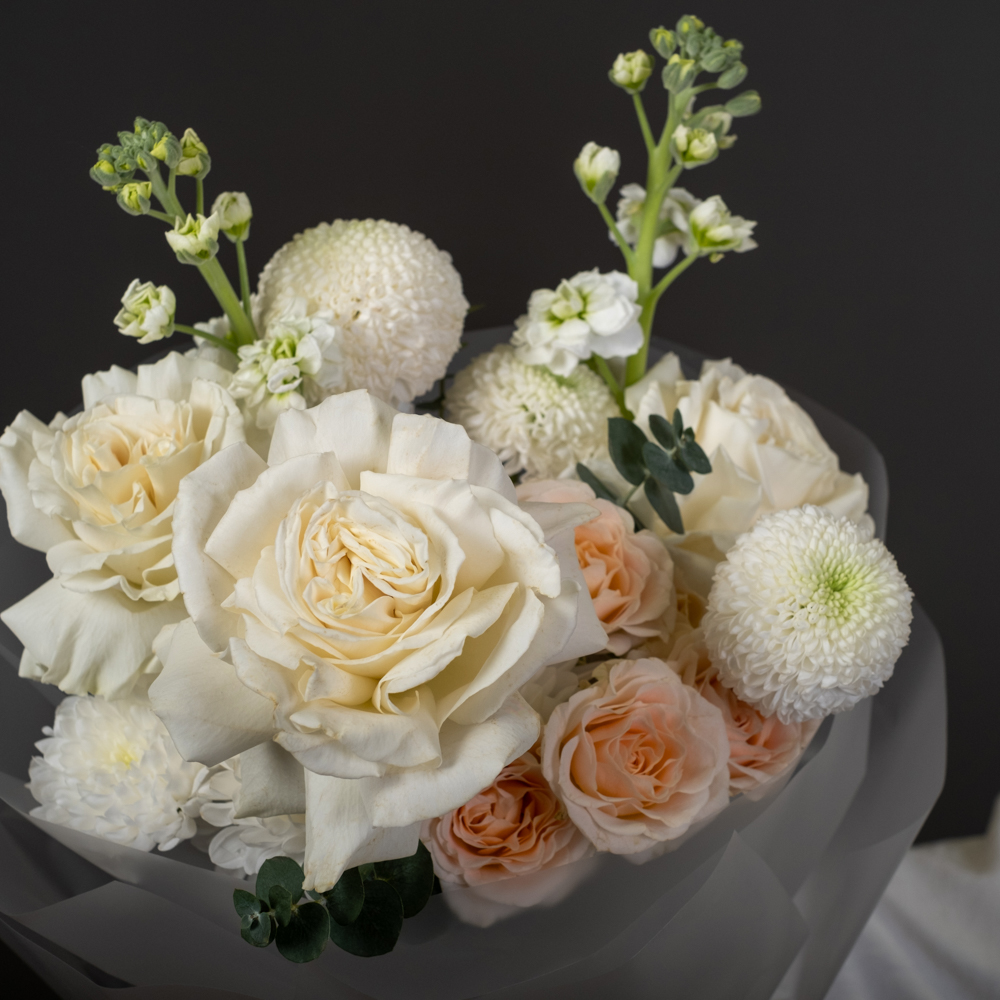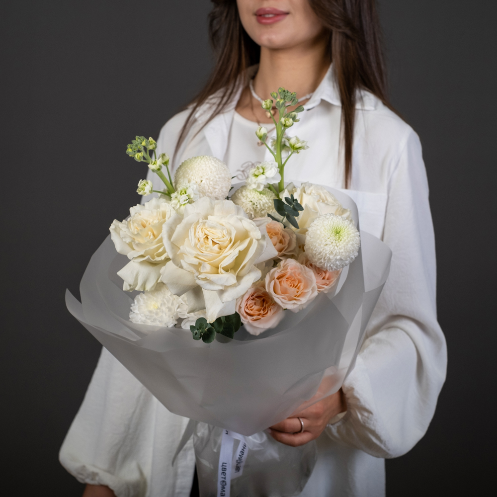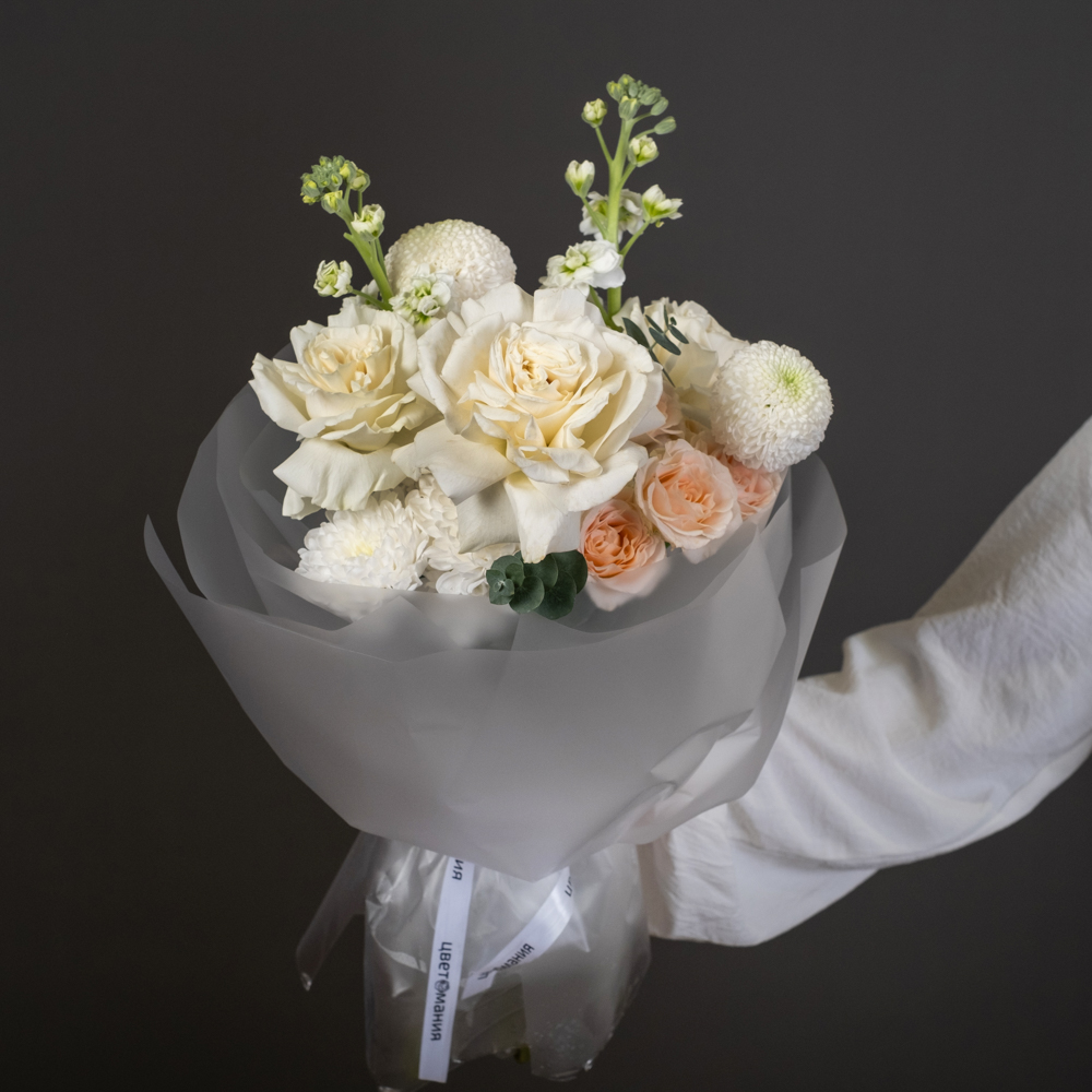 маттиола 2, французская роза 3, хризантема кустовая 1, хризантема стандарт 1, роза кустовая 2, эвкалипт 1, упаковка, лента