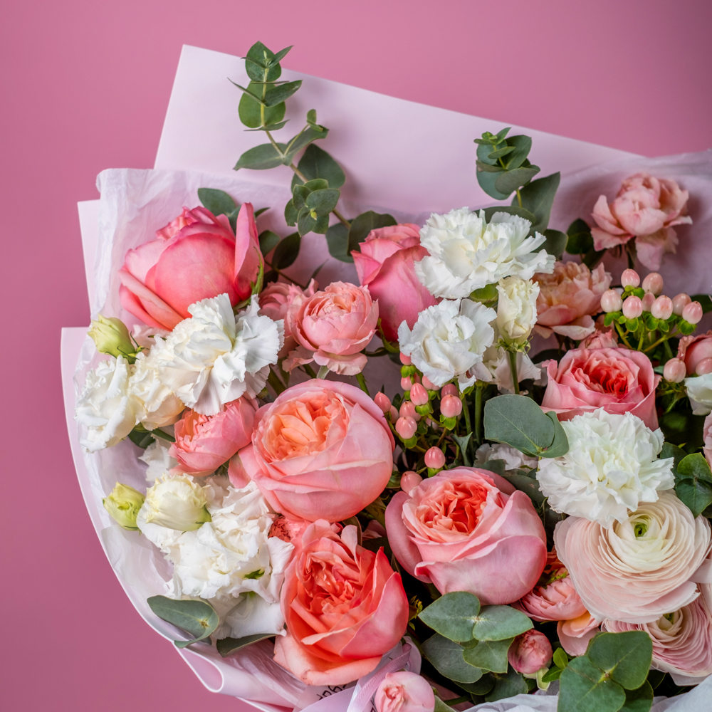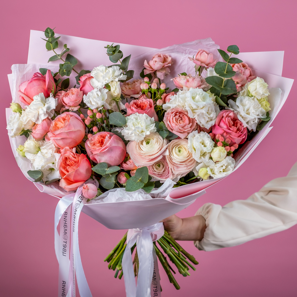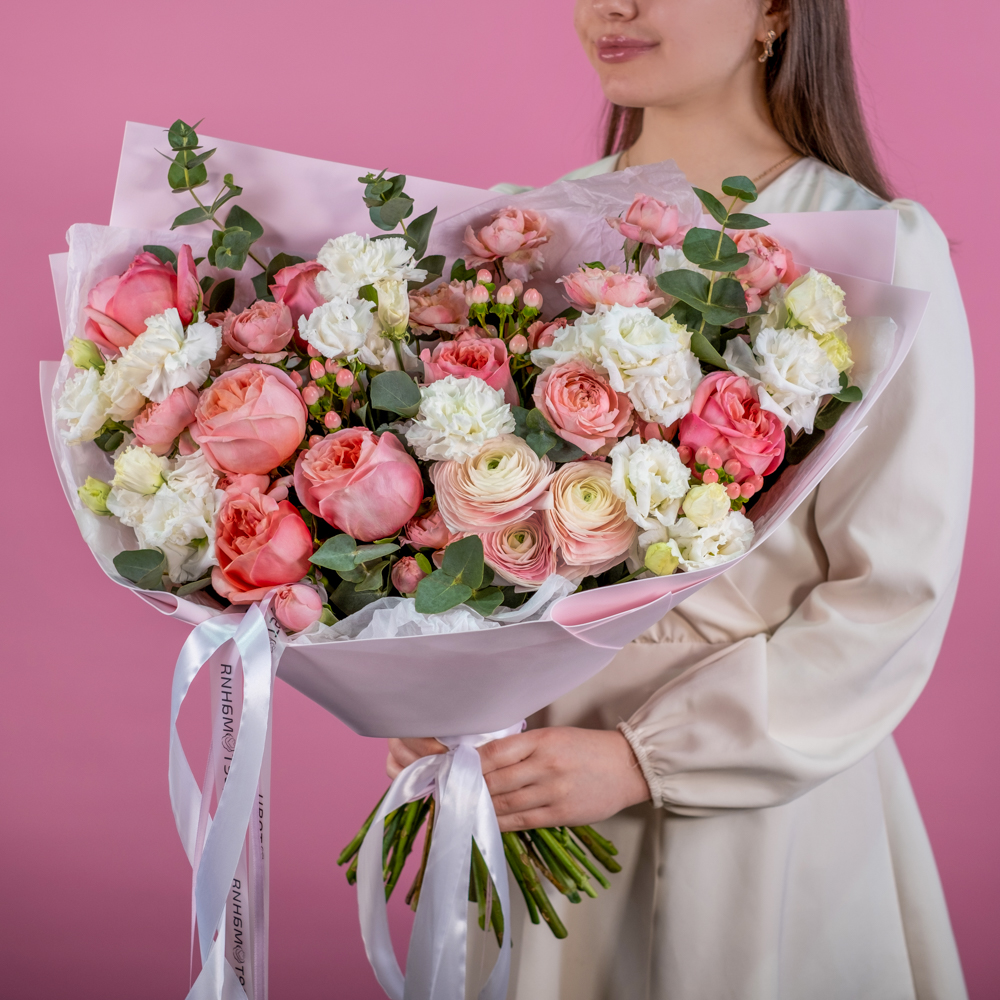 кустовая роза джульетта 5, эустома 7, цинерея эвкалипт 2, роза эквадор 70 см 7, гвоздика 4, пистач 10, ранункулюс 3 гиперикум 3, упаковка, лента