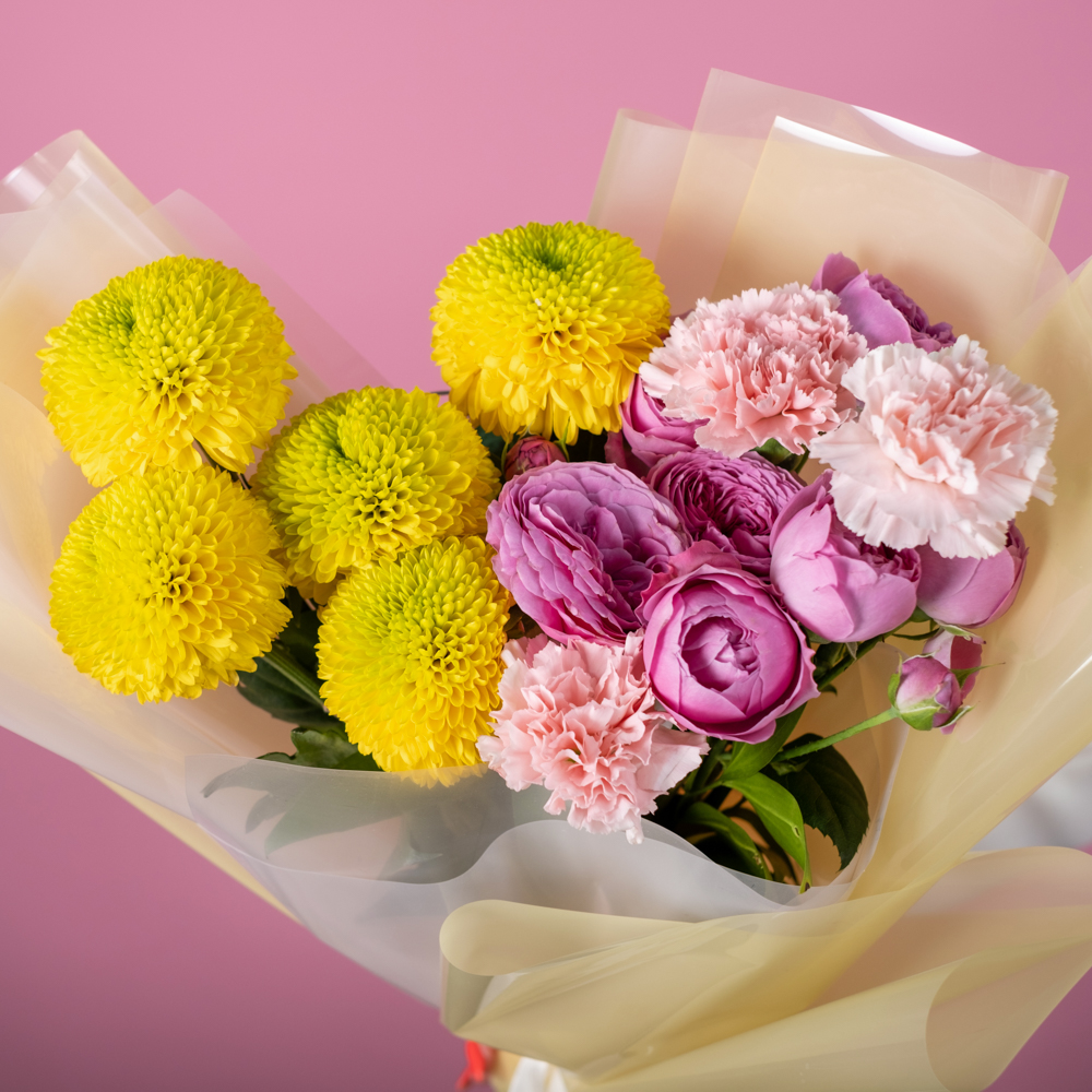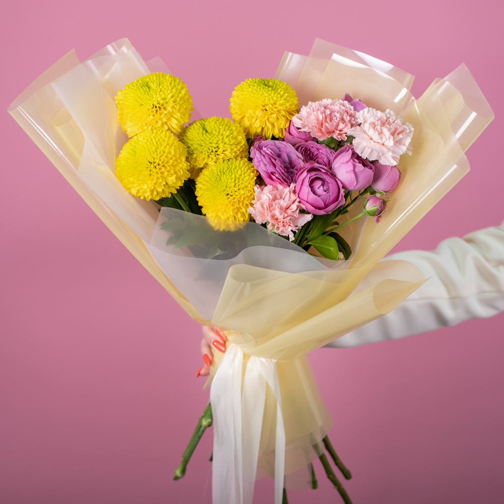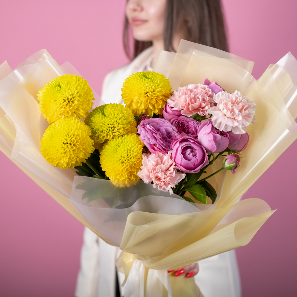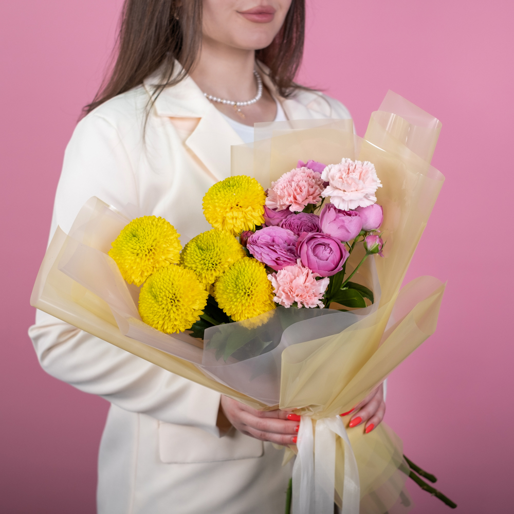 пионовидная роза мисти бабблс 2, гвоздика 3, хризантема стандарт 5, пистач 2, упаковка, лента