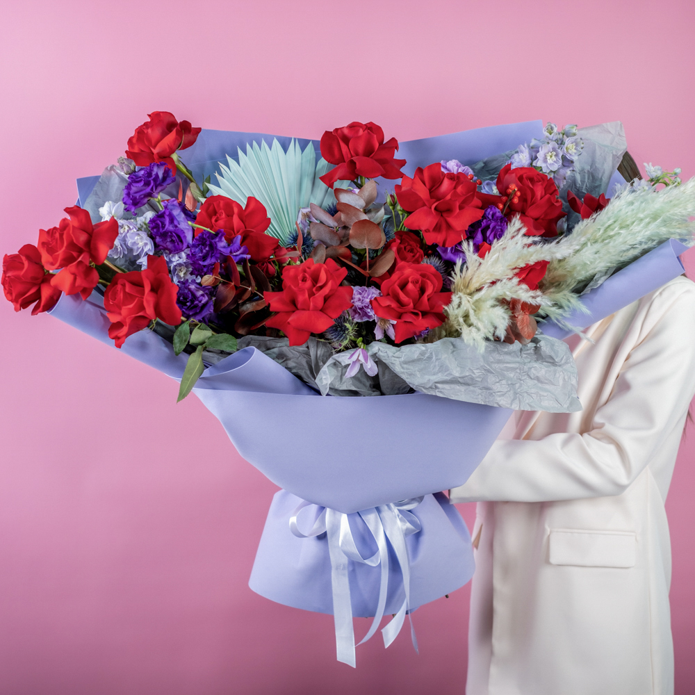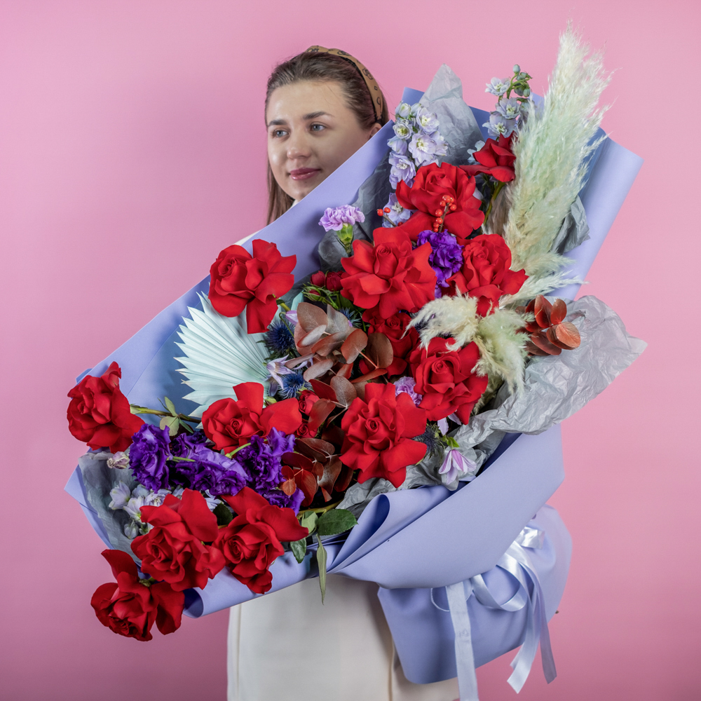 роза 70 см 13, дельфиниум 3, эвкалипт 1, эустома 3, клематис 2, гвоздика Голландия 5, пампас 1, краска, лист пальмы 1, эрингиум 2, пистач 7, упаковка, лента