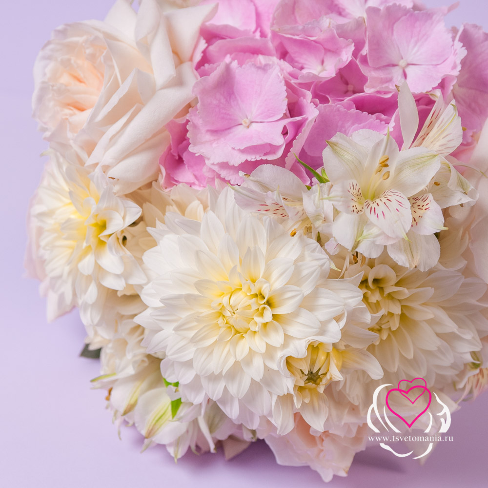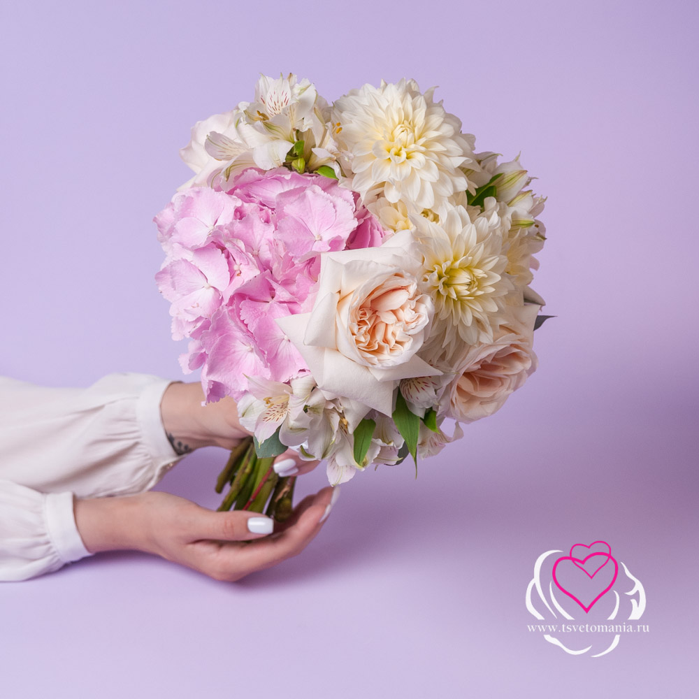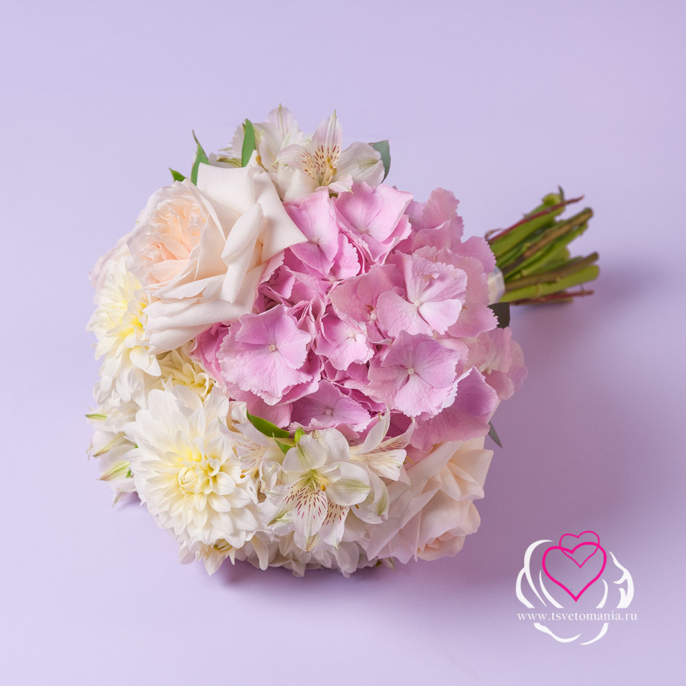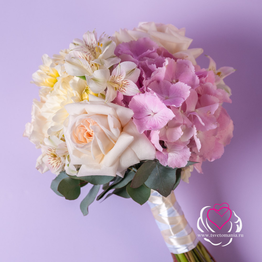 Состав букета: гортензия 1, альстромерия 5, георгин 7, роза эквадор 50 см 5, эвкалипт парвифолия 2, лента атласная