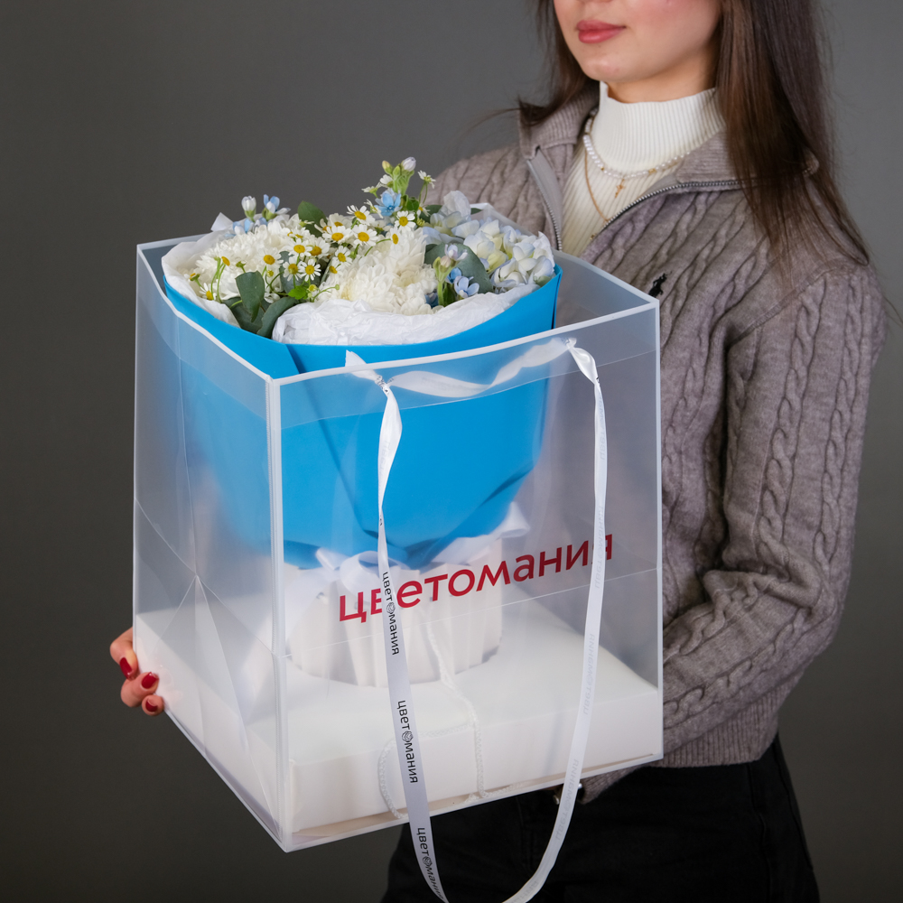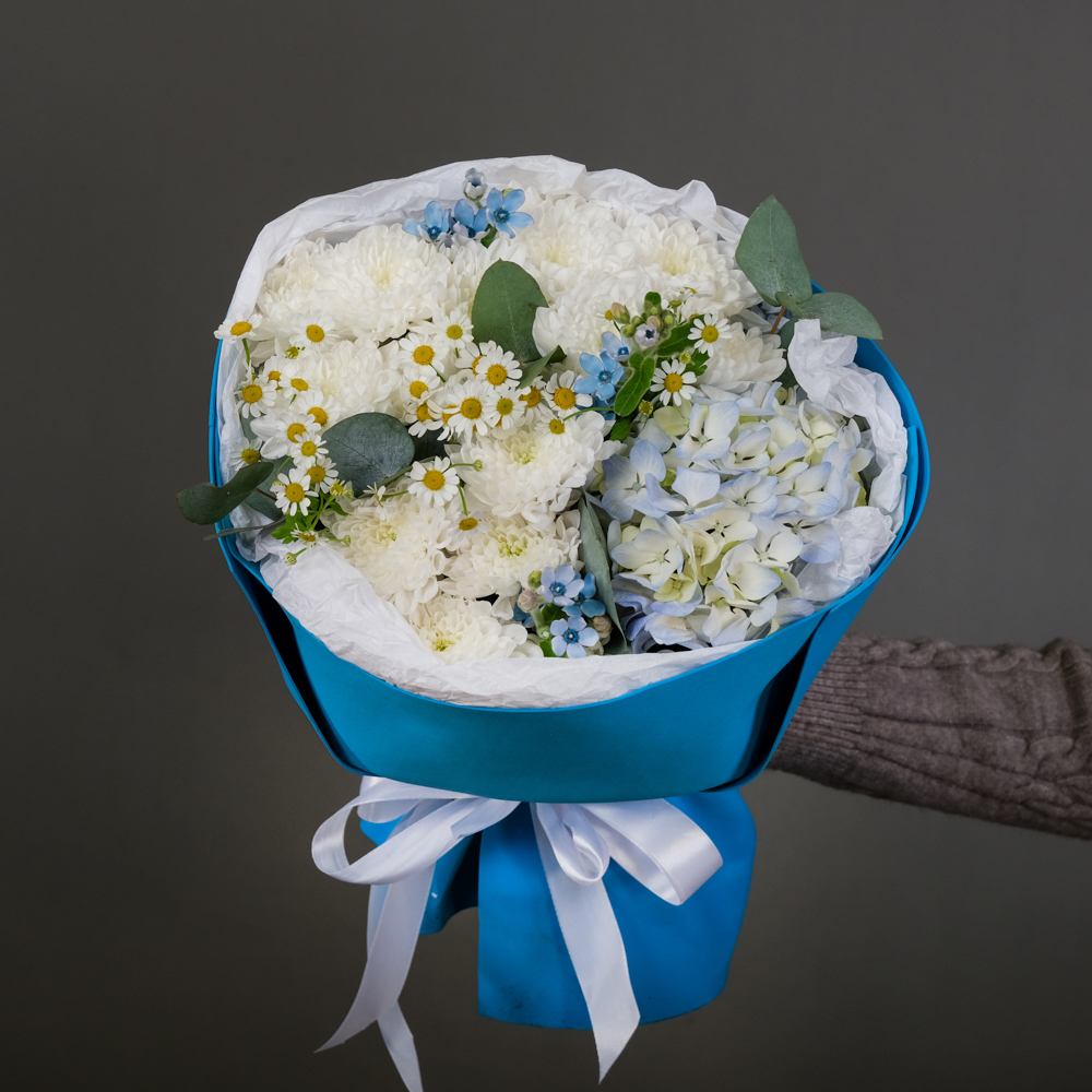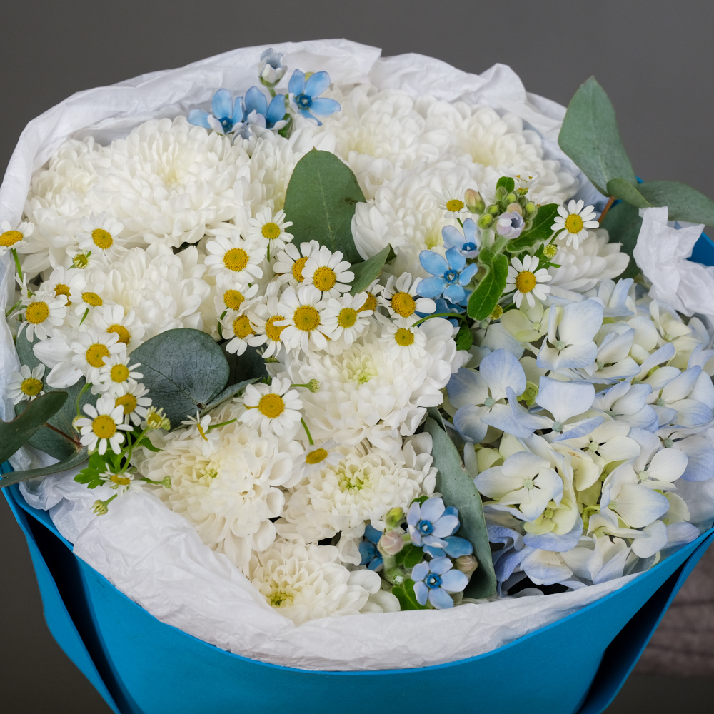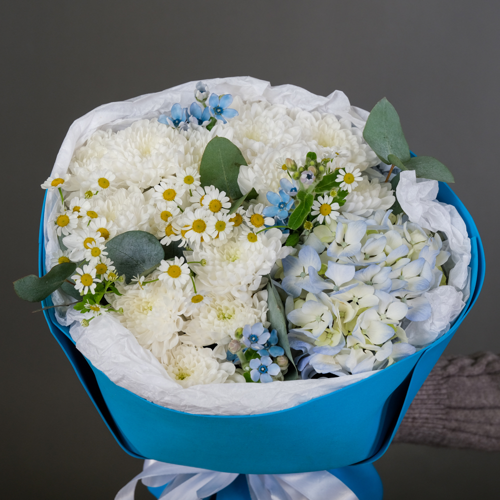 гортензия 1, хризантема кустовая 3, оксипиталум 3, матрикария 2, эвкалипт 0,5, упаковка, тишью, лента, аквабокс, сумочка