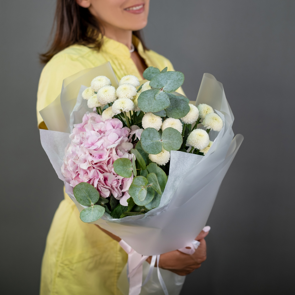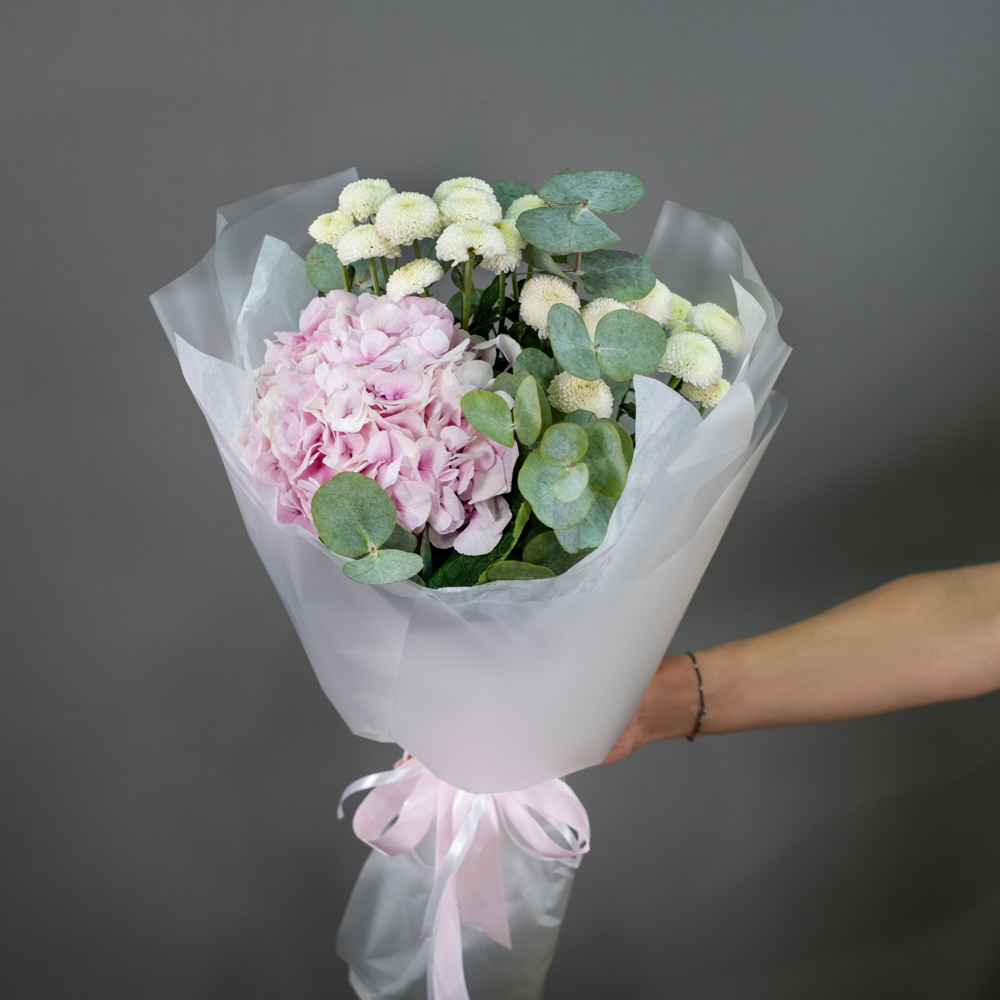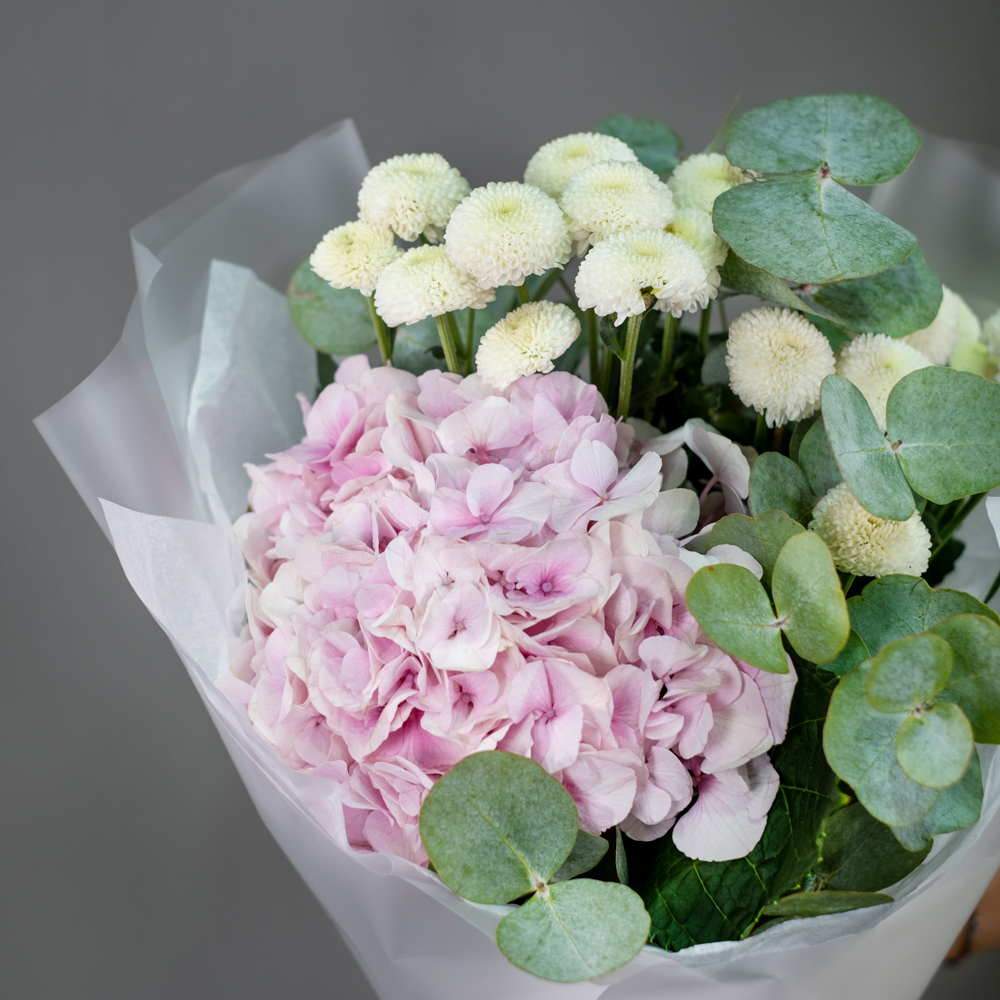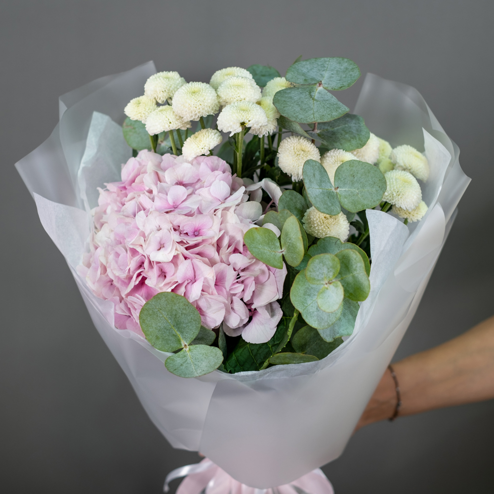 гортензия 1, хризантема кустовая 2, эвкалипт 1, упаковка , лента