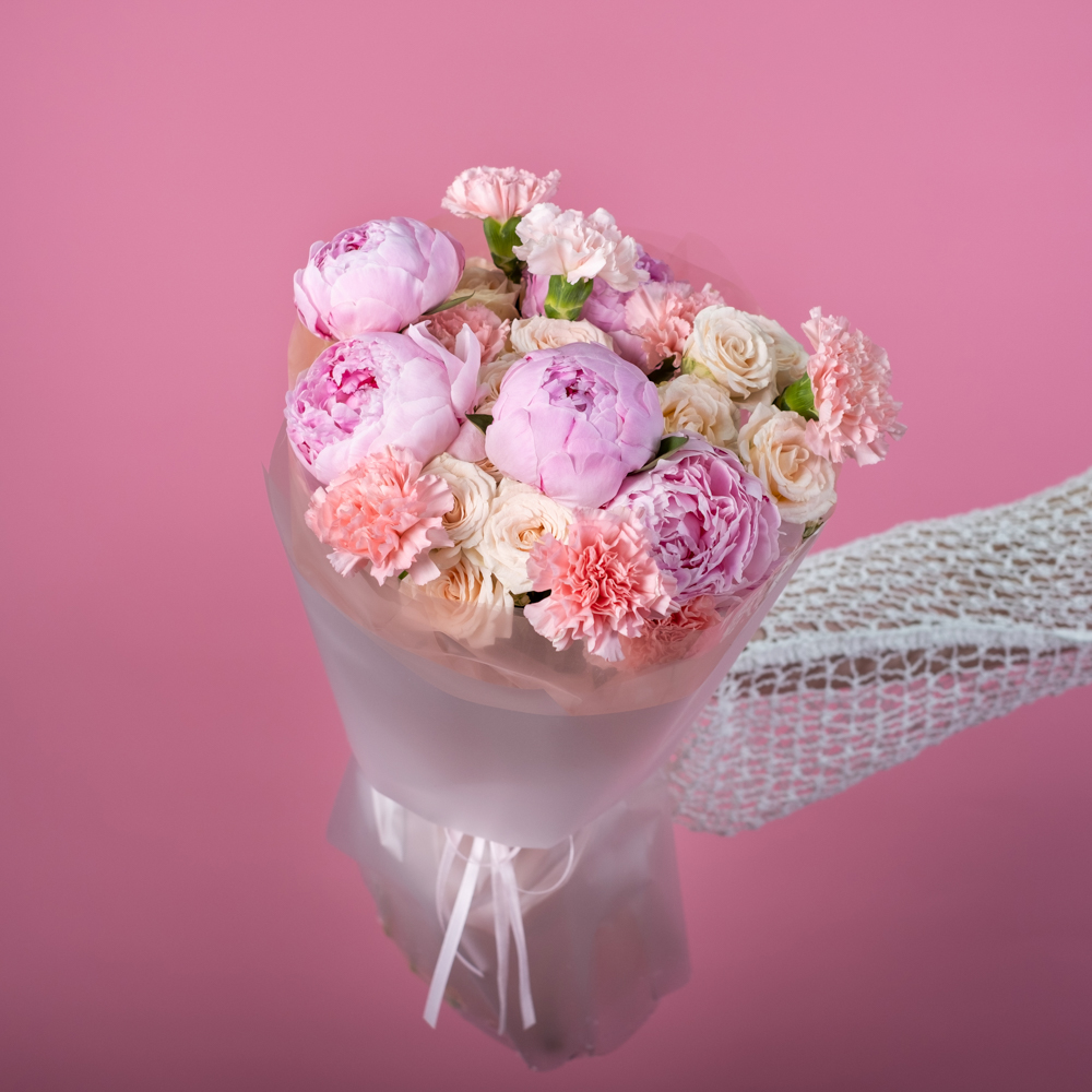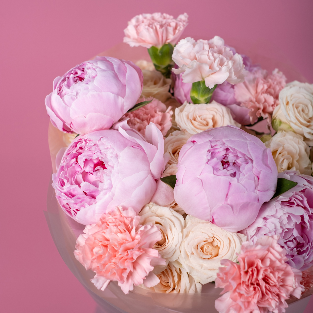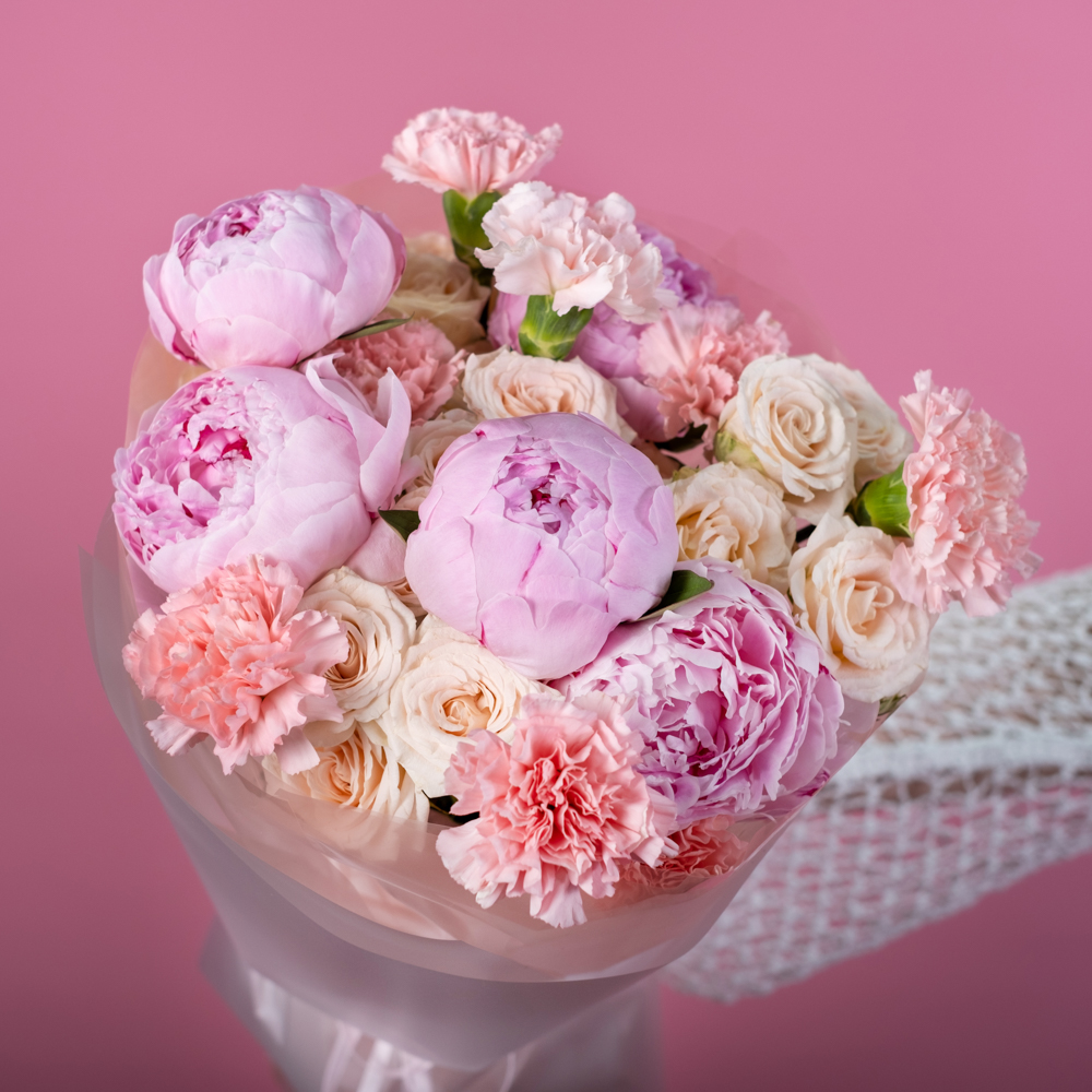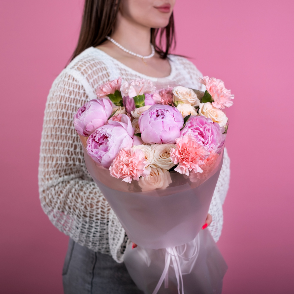 пион 5, гвоздика 9, кустовая роза 3, пистач 3, упаковка, лента