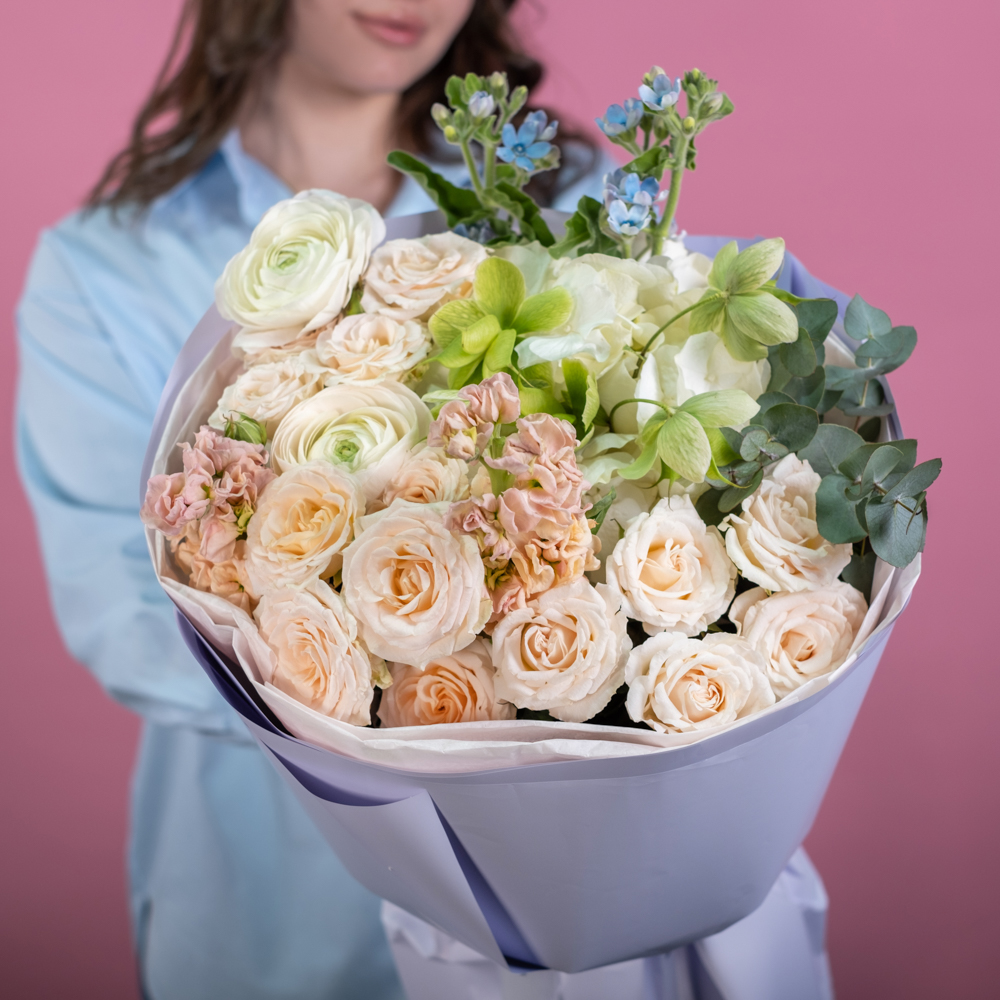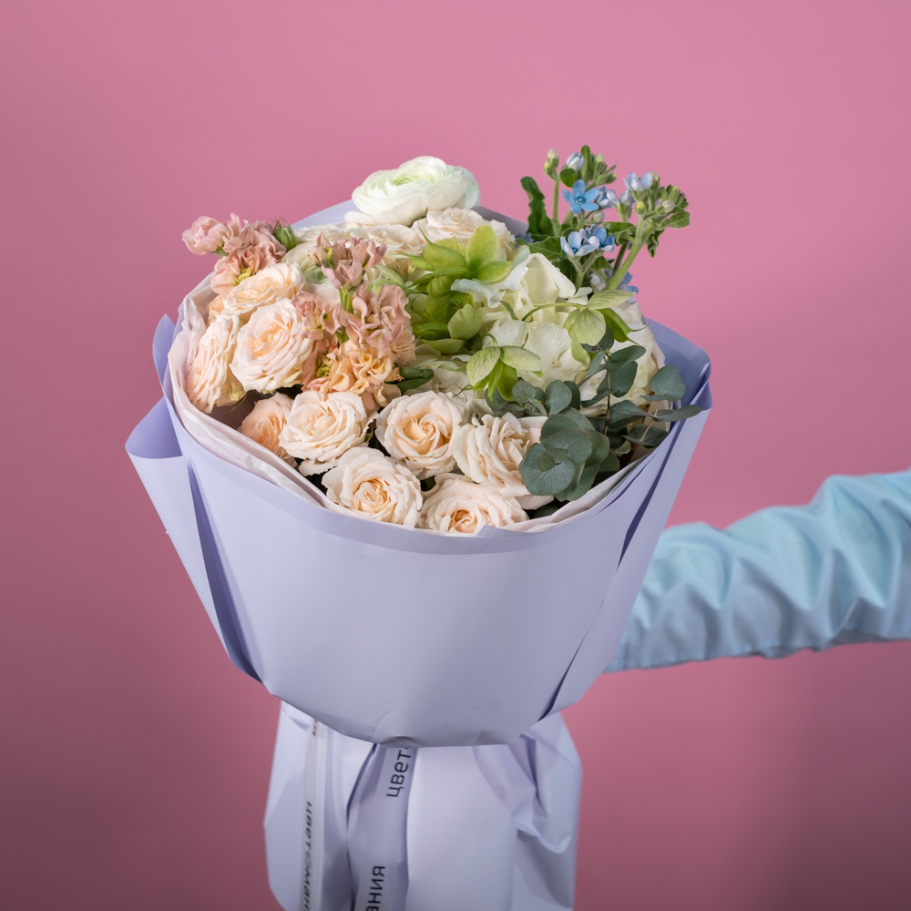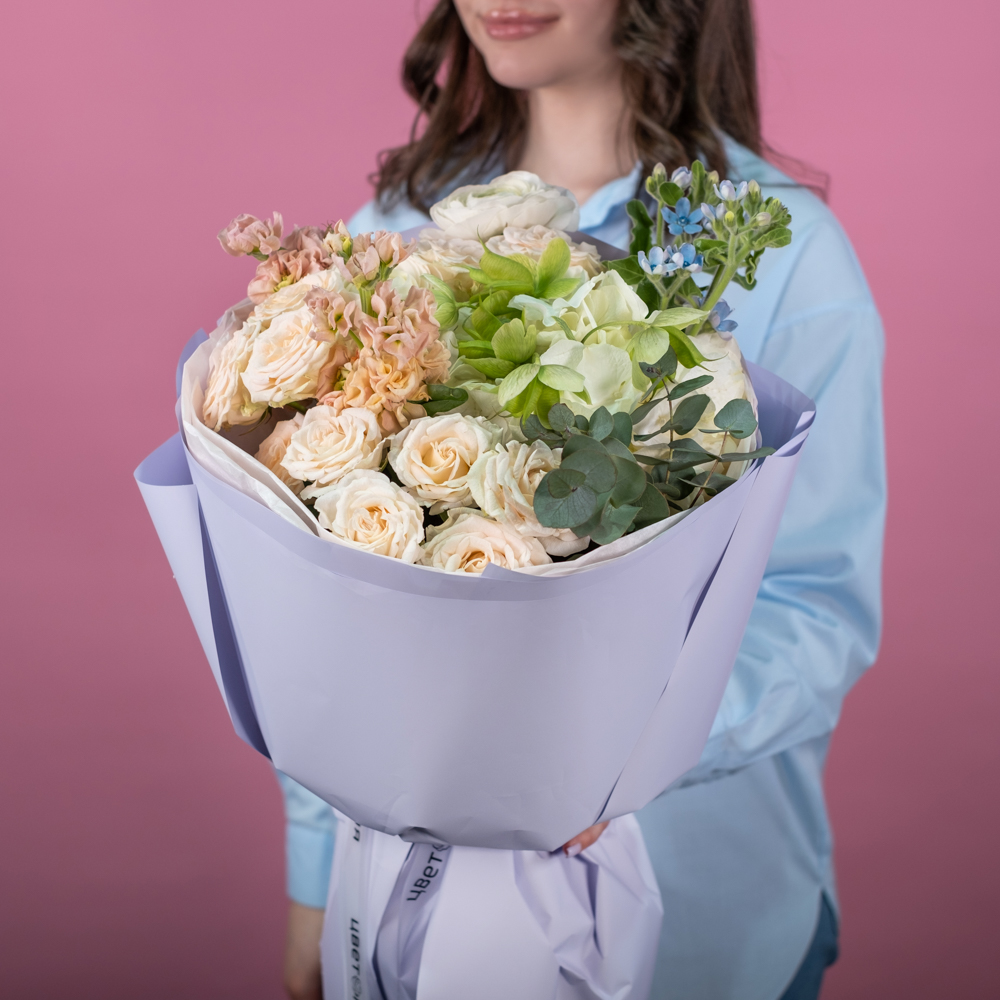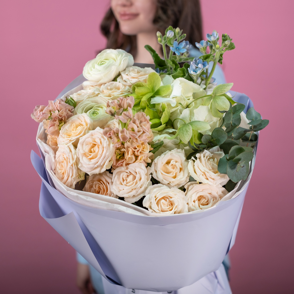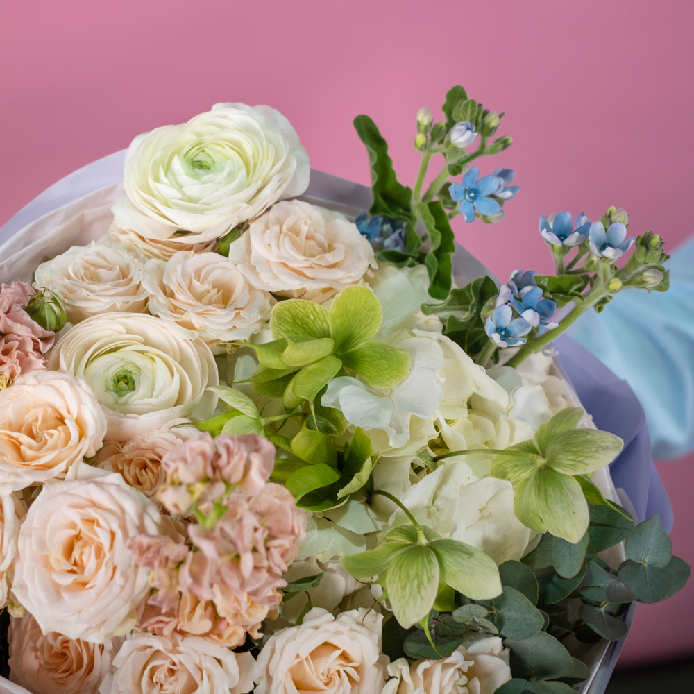роза кустовая 3, хелеборус 1, оксипеталум 2, эвкалипт 0,5, маттиола 2, ранункулюс 2, гортензия 1, упаковка, лента