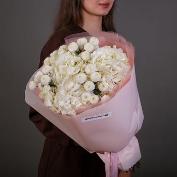 гортензия 2, хризантема кустовая 2, эвкалипт 1, упаковка, лента