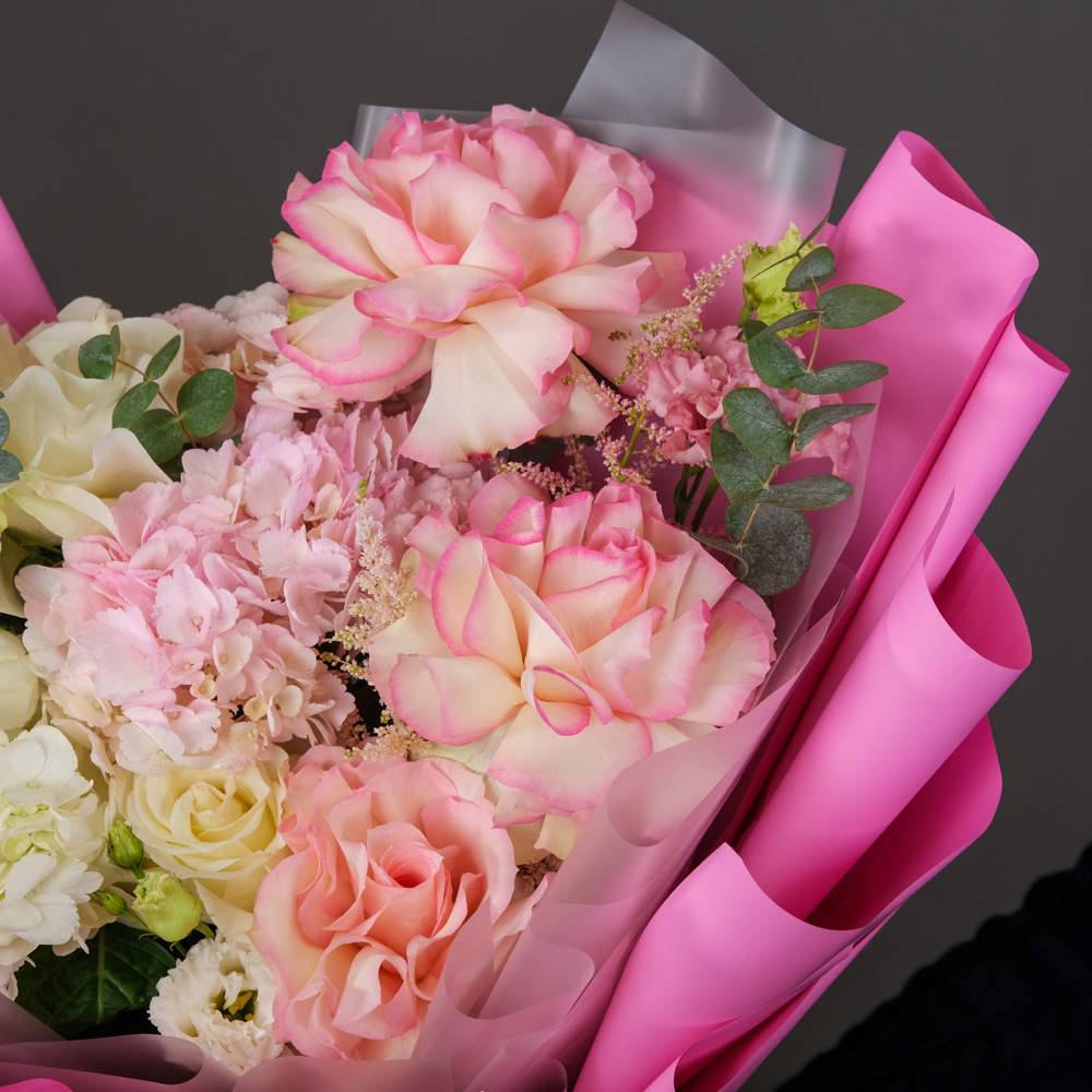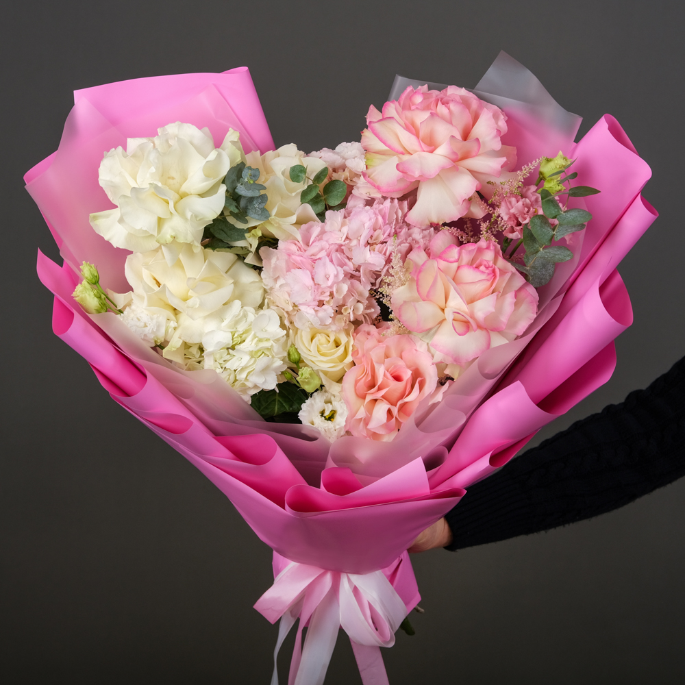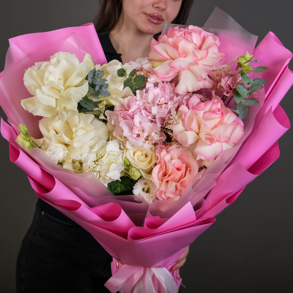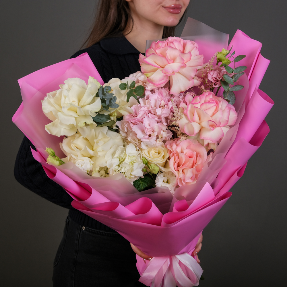 французская роза 7, астильба 2, гортензия 2, эустома 2, эвкалипт 2, упаковка, лента