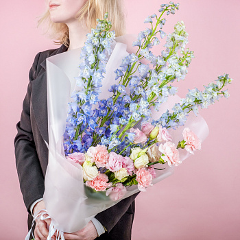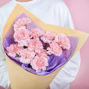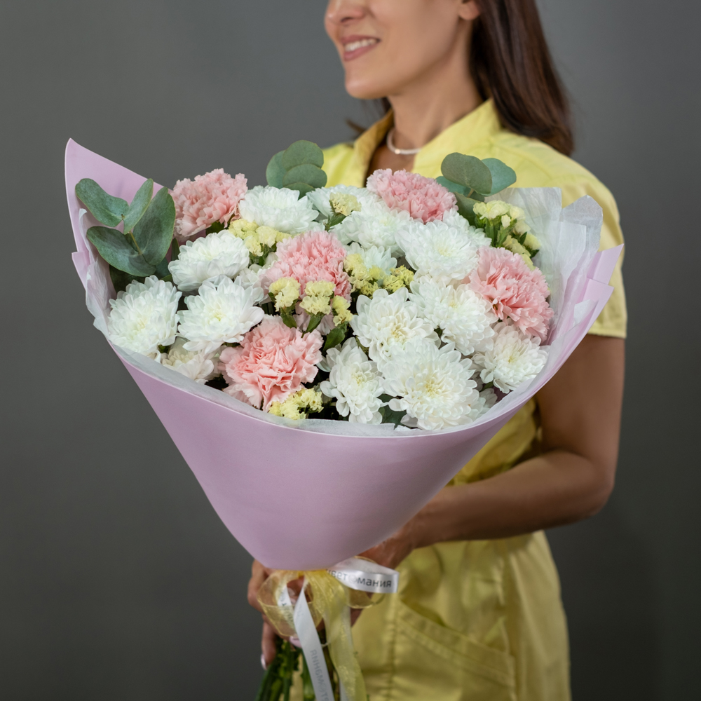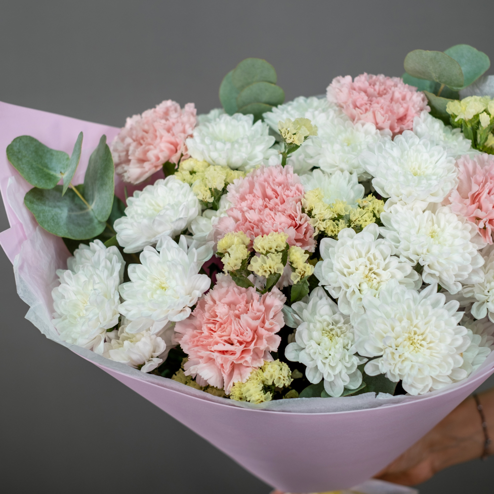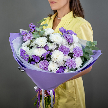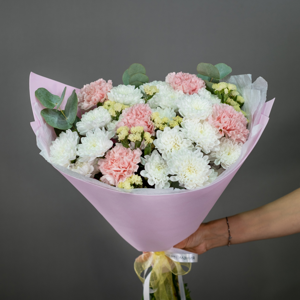 хризантема кустовая 3, гвоздика 5, статица 2, эвкалипт 1, упаковка, лента