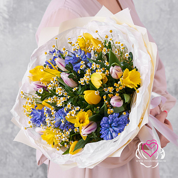 Лиловые гиацинты и розовая эустома, словно первые лучи солнца пробивающие ночное небесное полотно. Прекрасный и выразительный букет, способный наполнить все вокруг нежным ароматом и создать уютную атмосферу. Упаковка может незначительно отличаться.