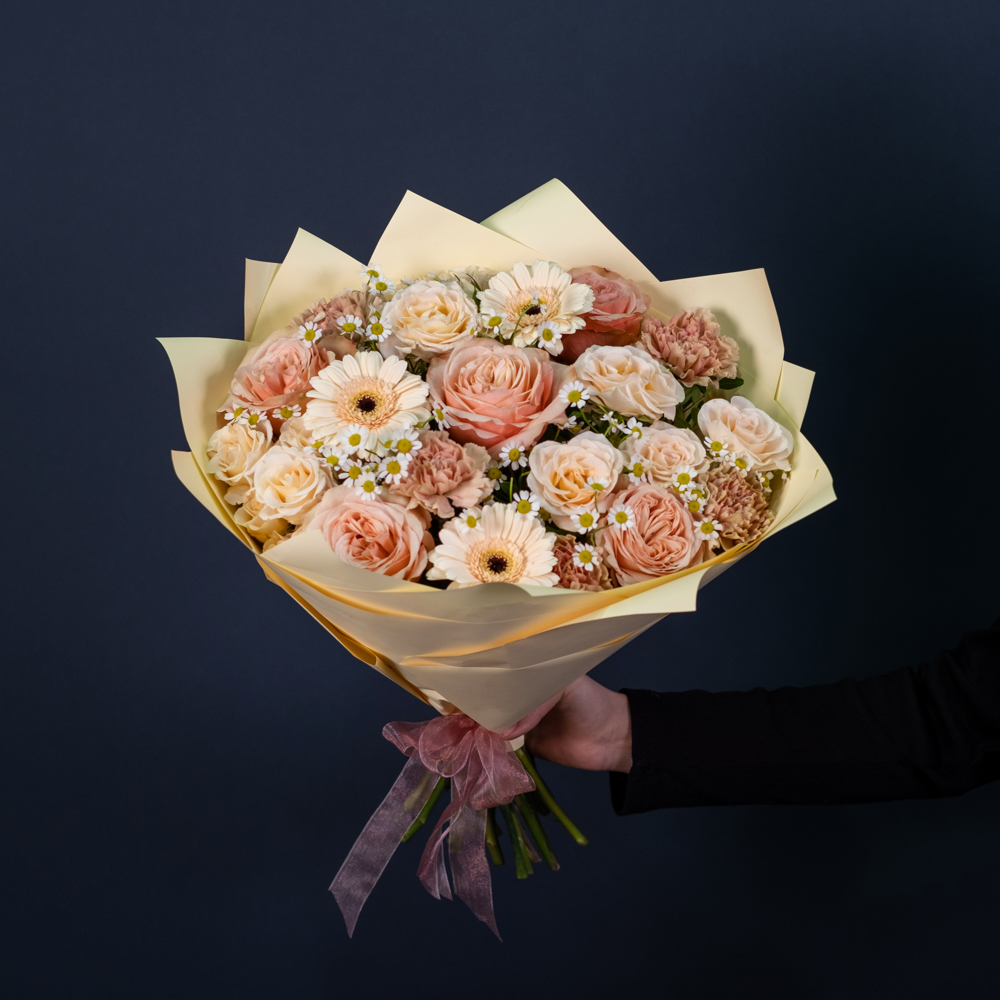 гвоздика 5, гербера мини 3, матрикария 4, роза кустовая морнинг стар 3, пистач 3, роза эквадор 50 см 5, упаковка, лента