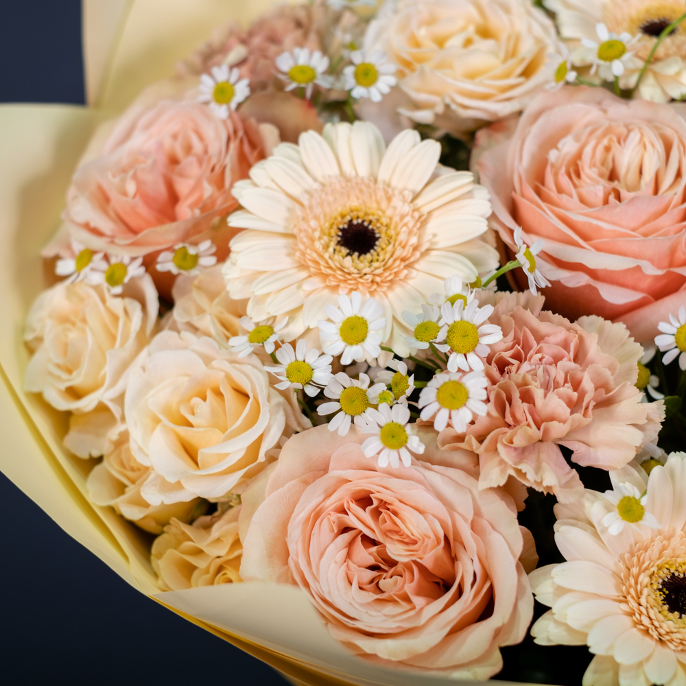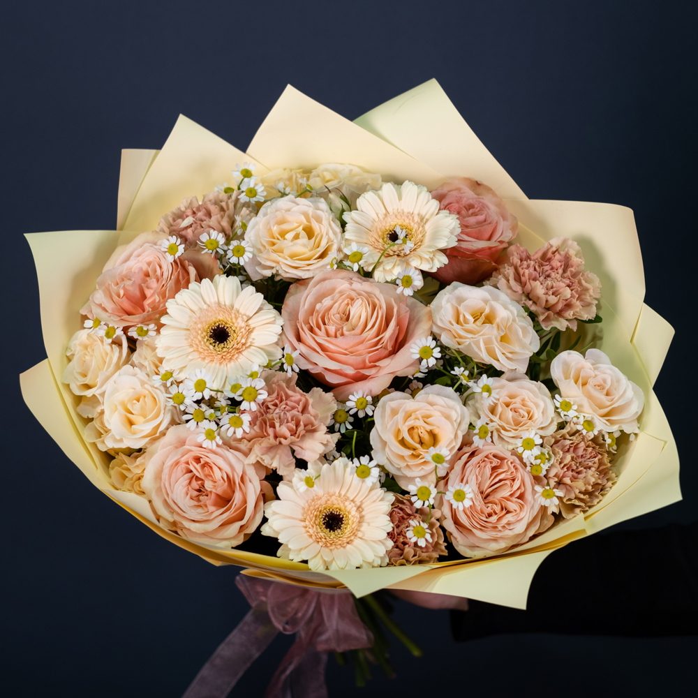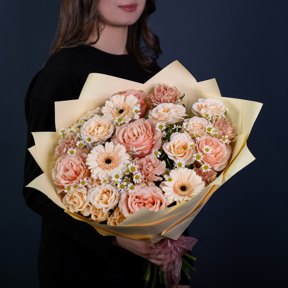 Пышный, яркий, ароматный букет который потрясает своим видом всех окружающих. Этак композиция сделает любое мероприятие красочнее и эмоциональнее, а также подарит множество теплых воспоминаний. Упаковка может незначительно отличаться.