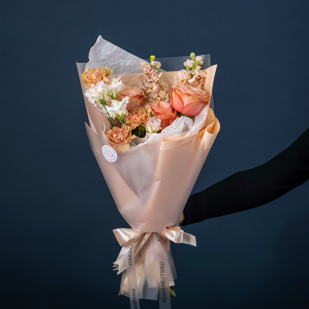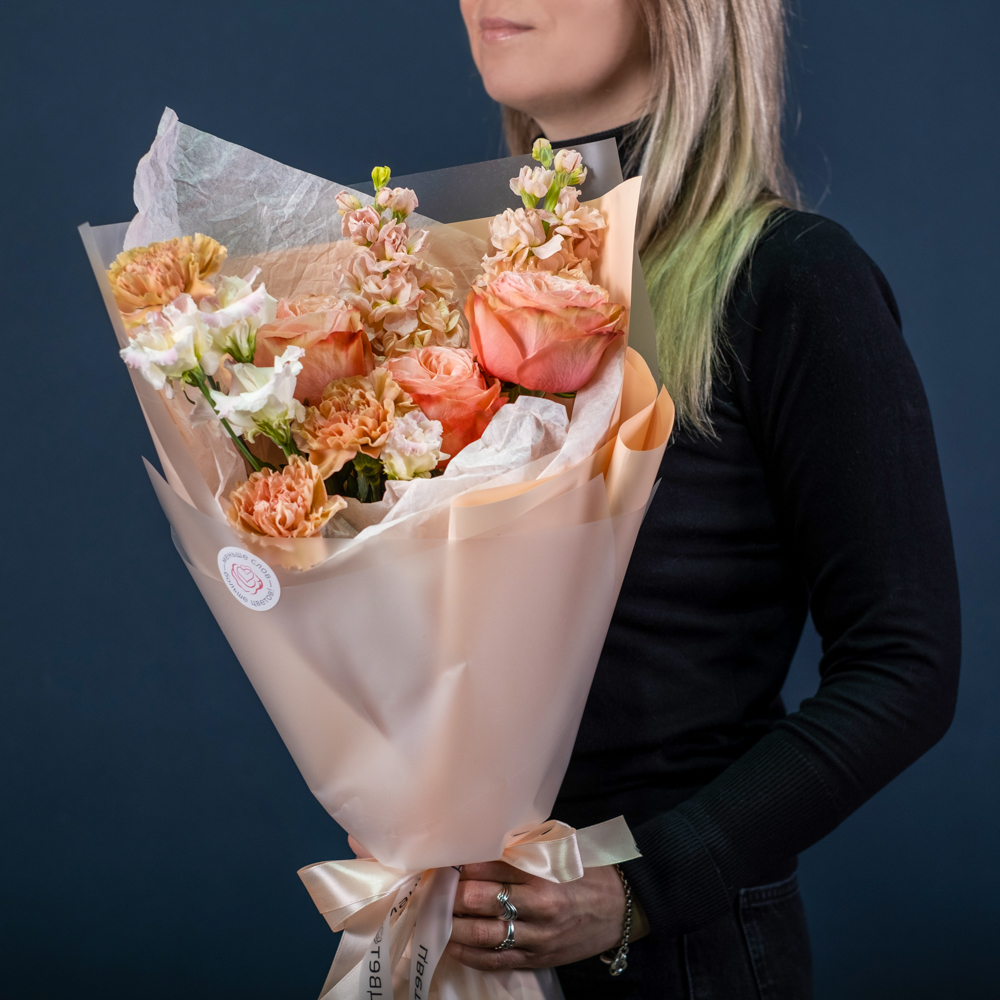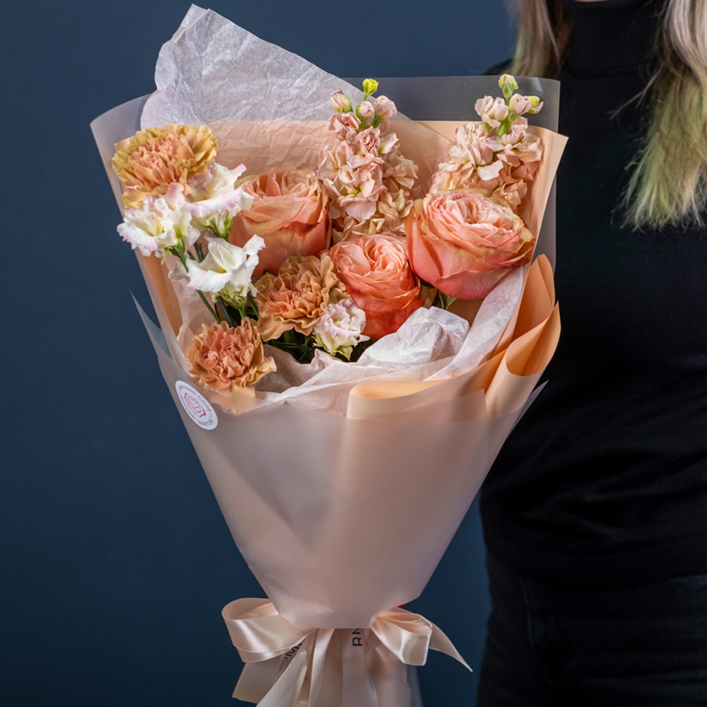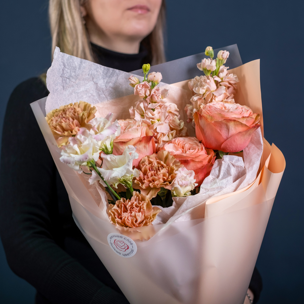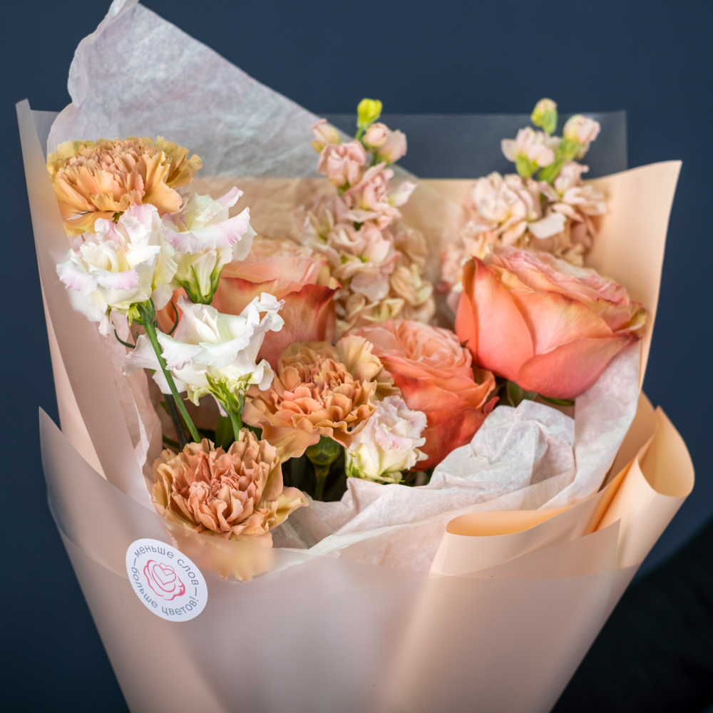 Тёплый и уютный, ароматный и нежный - всё это о букете «Персиковый джем», который вызовет у получателя только положительные эмоции. Тонкий аромат маттиолы в составе делает этот букет незабываемым. Он обязательно останется в памяти надолго вместе с замечательным впечатлением от подарка! Упаковка может незначительно отличаться.