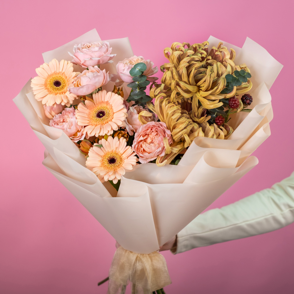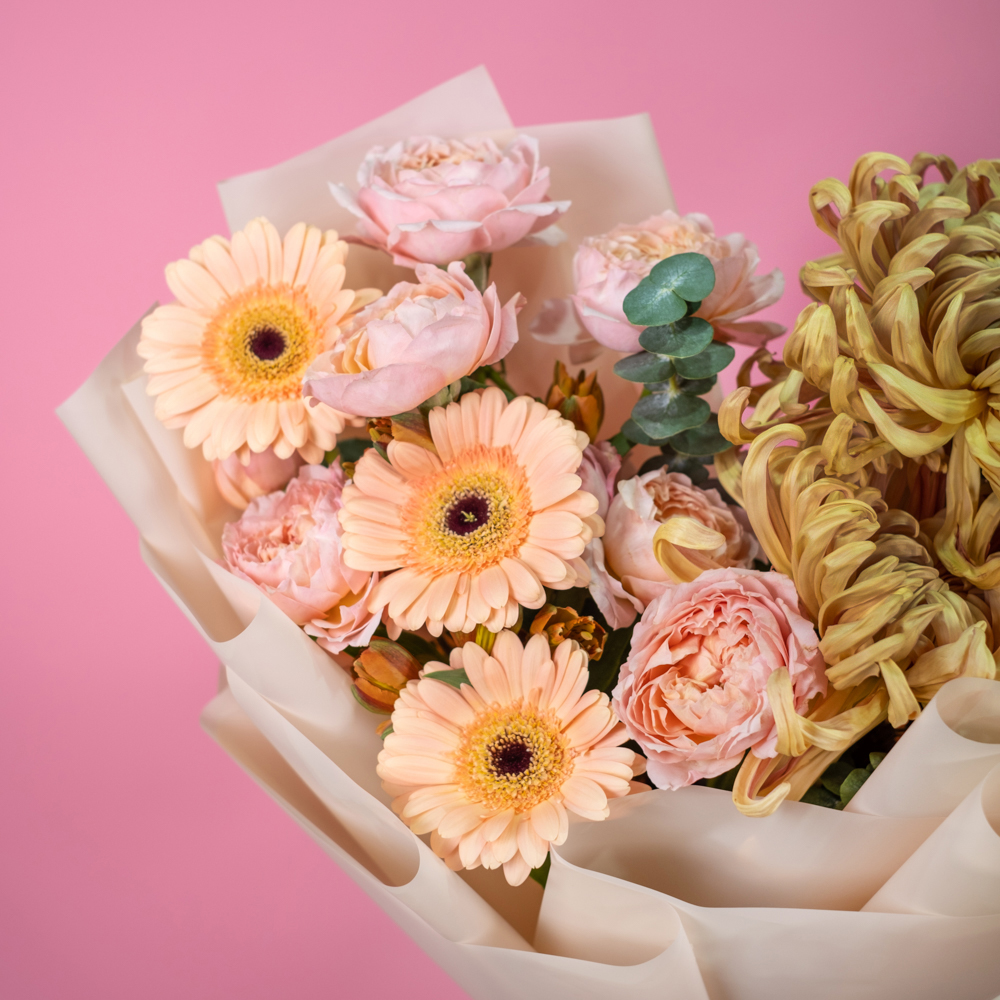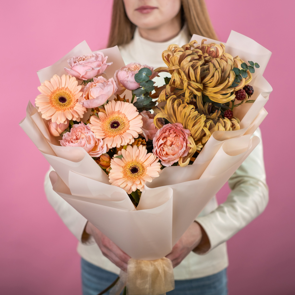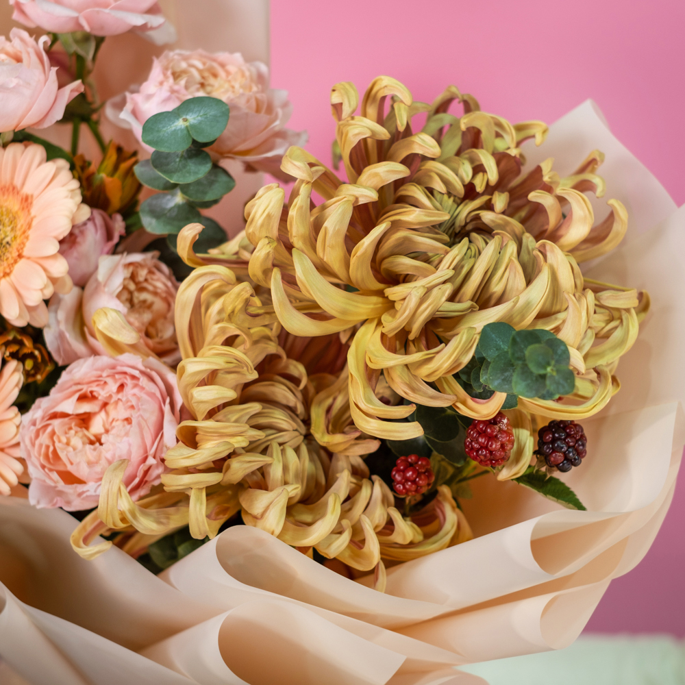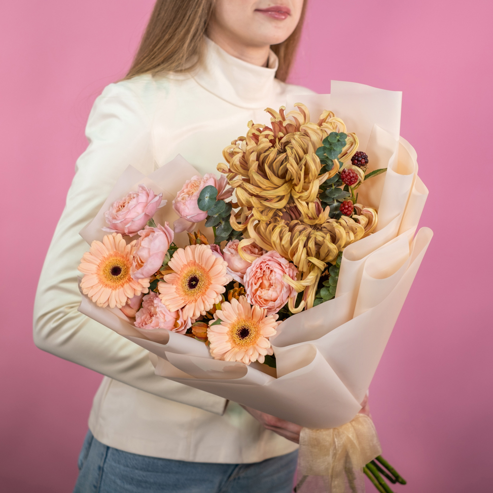роза кустовая джульетта 2, хризантема виена 2, рубус 1, гербера мини 3, альстромерия 2, эвкалипт 1, упаковка, лента