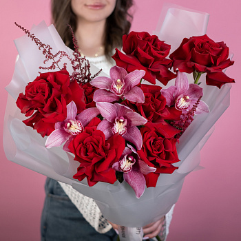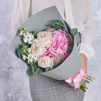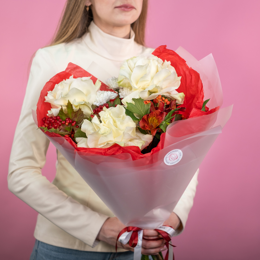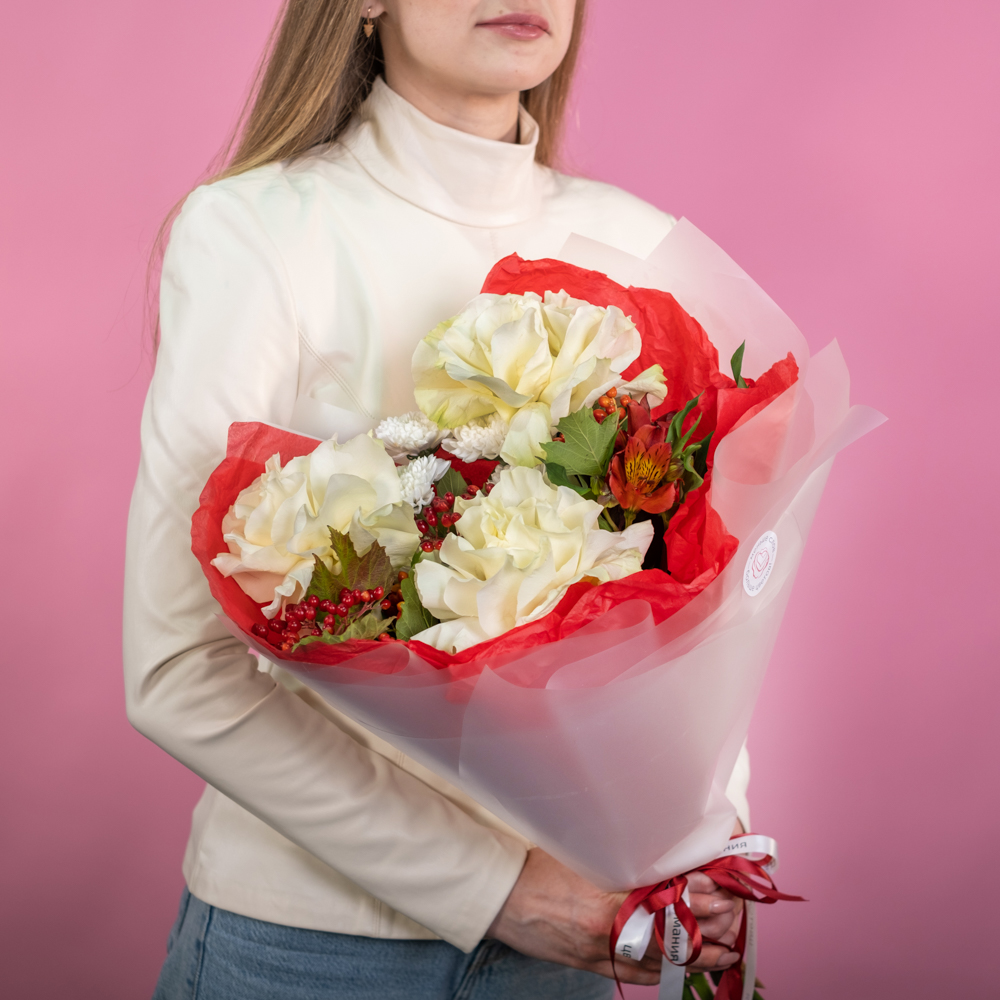альстромерия 1, французская роза 3, хризантема кустовая 1, вибурнум компактум 2, пистач 1, упаковка