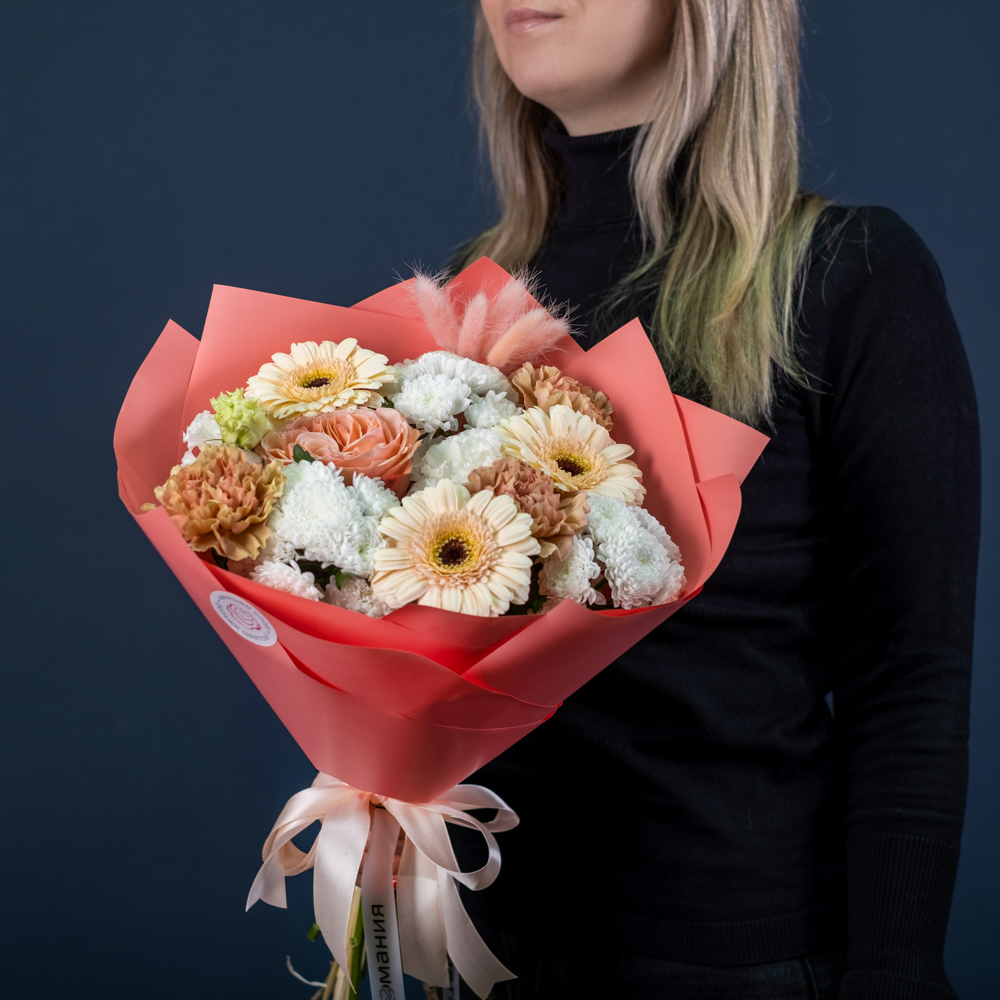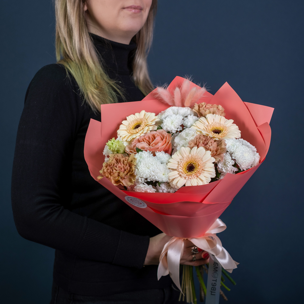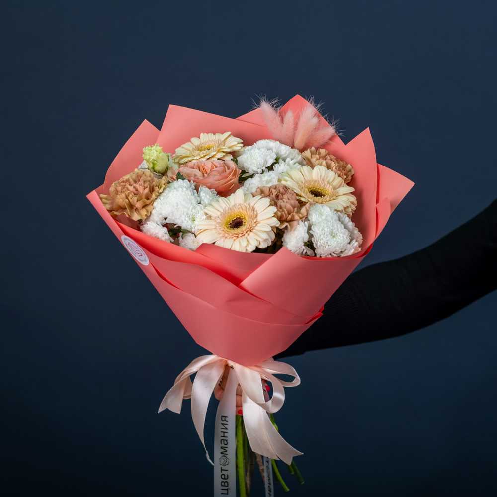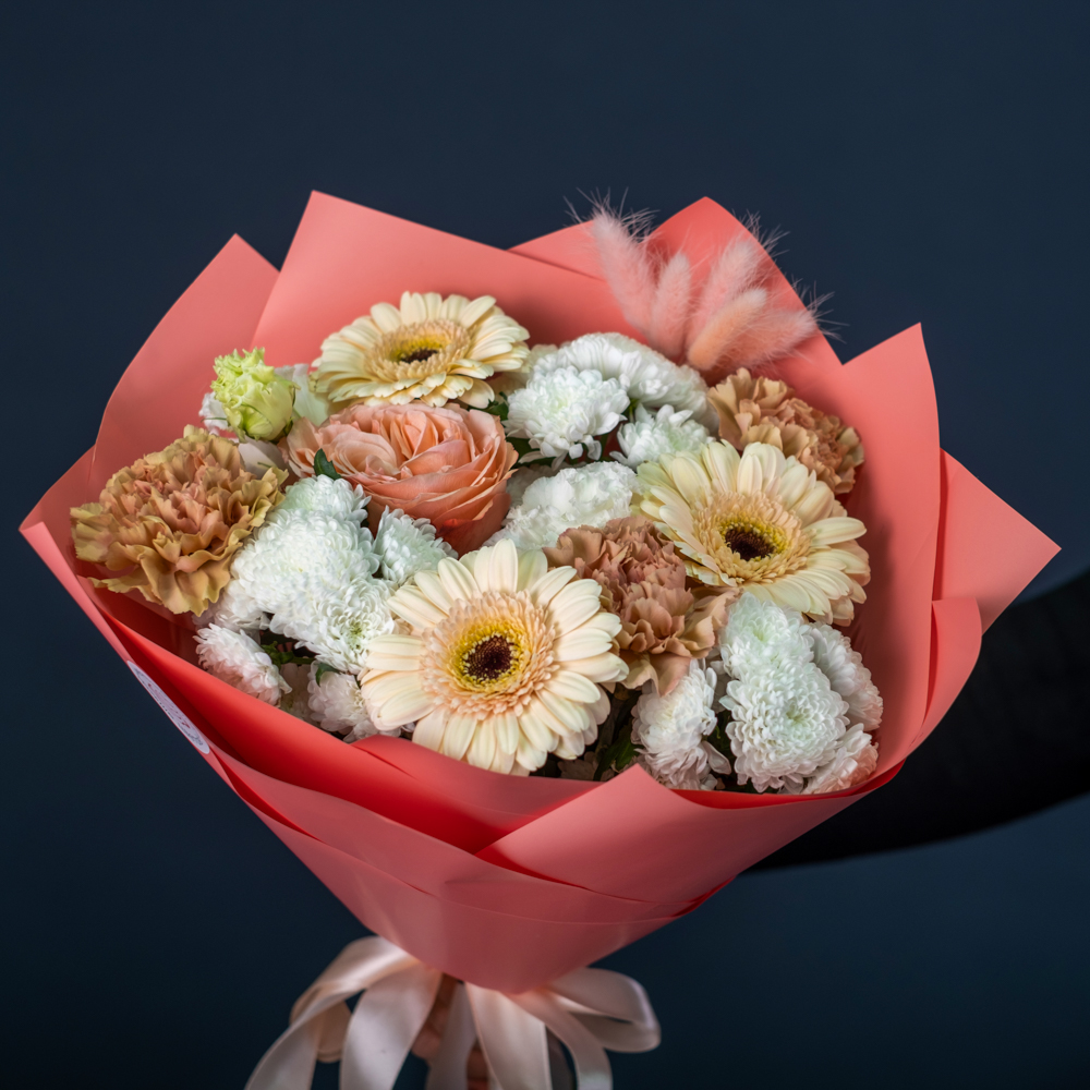 гербера мини 3, роза эквадор 50 см 1, хризантема сантини 3, эустома 2, лагурус 5, гвоздика голландия 3, пистач 2, упаковка , лента