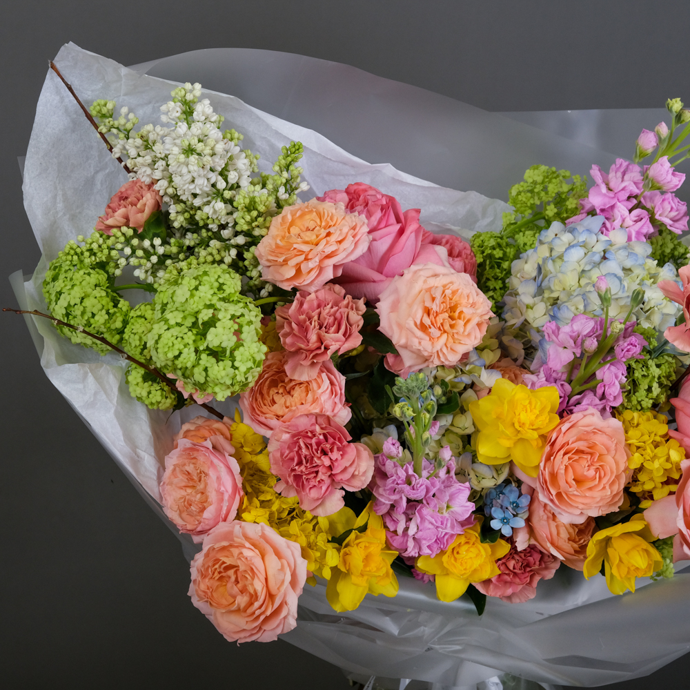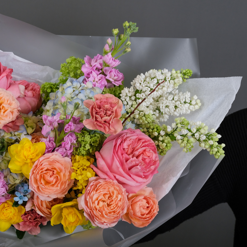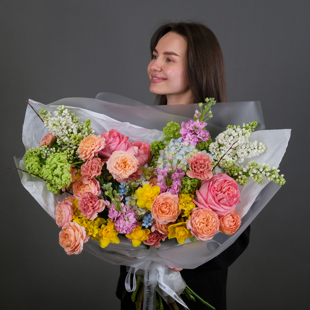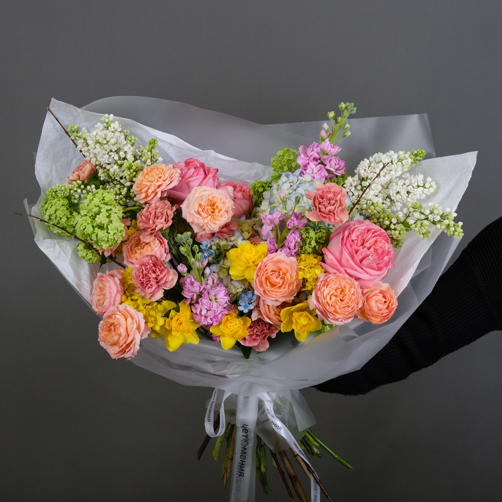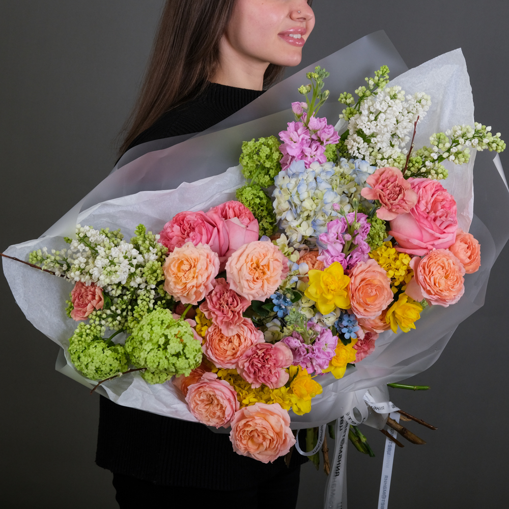 гортензия 2, мадам бомбастик 4, нарцисс 5, верба 3, маттиола 3, сирень 2, гвоздика 7, вибурнум розеум 2, сухоцвет гортензия 0,5, роза 50 см премиум 3, оксипиталум 4, упаковка, тишью, лента