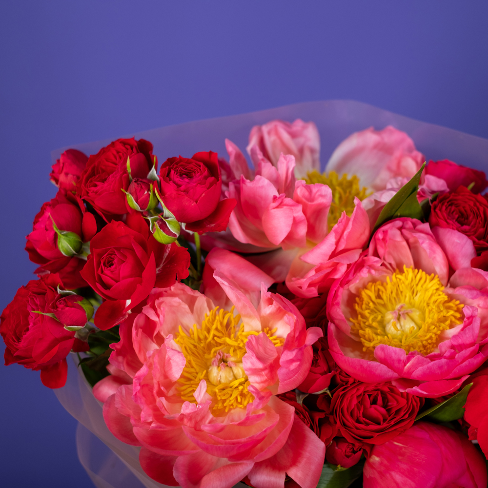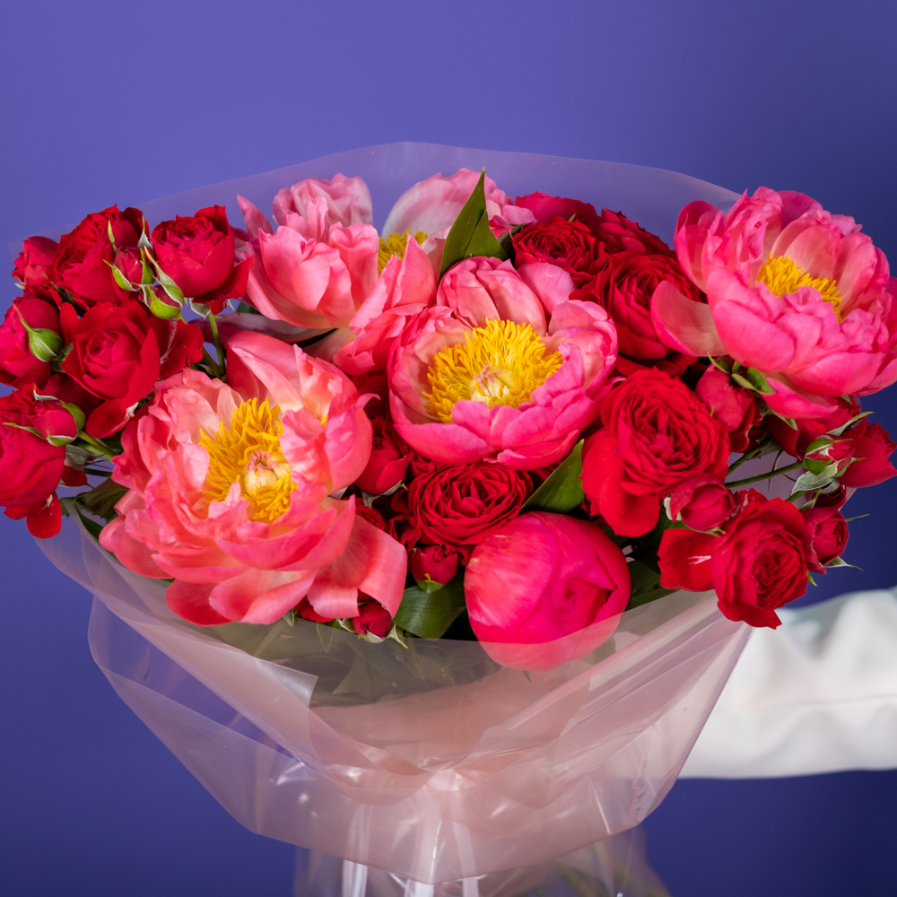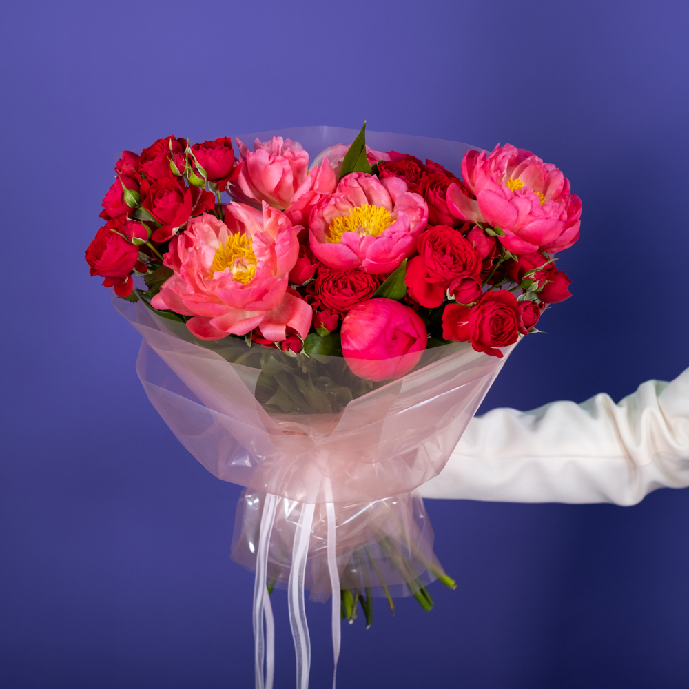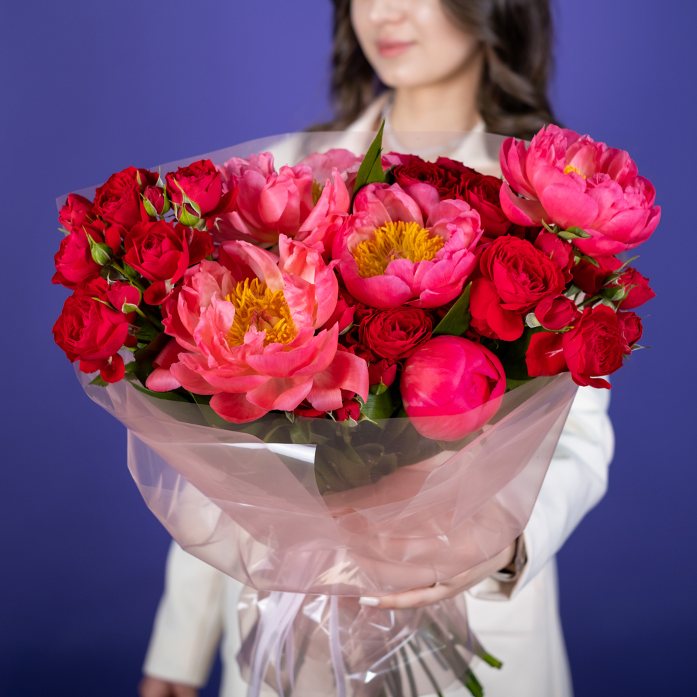 Упаковка может незначительно отличаться. Пионы быстро раскрываются в тепле. На свежесть указывают плотные и упругие лепестки, зеленые листья и стебли. Коралловые пионы меняют цвет по мере распускания цветка. Вначале лепестки яркого кораллового оттенка, в дальнейшем приобретают более светлый персиковый оттенок. Через 1-2 дня в вазе становятся кремового цвета.