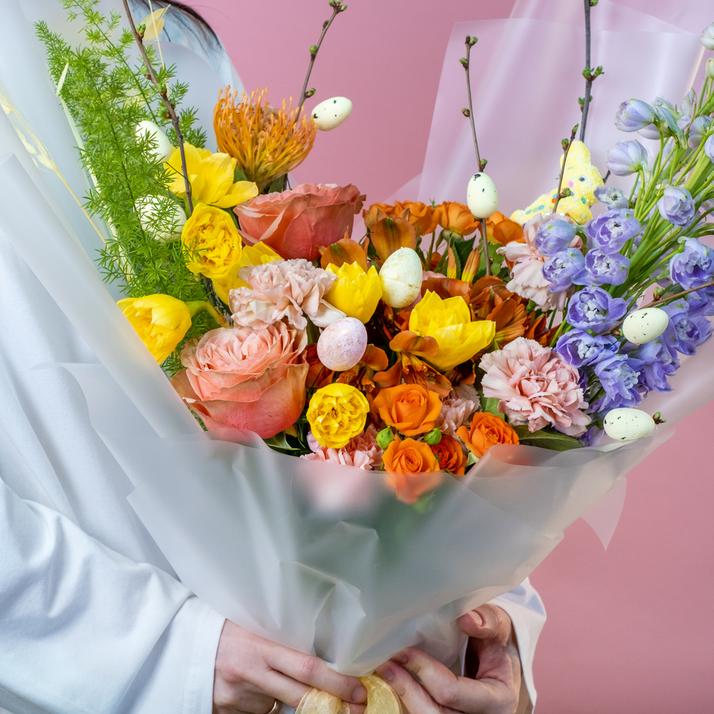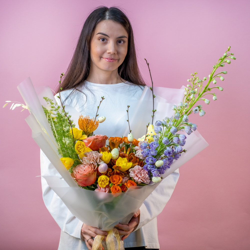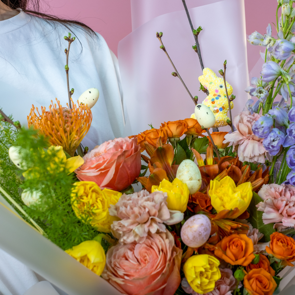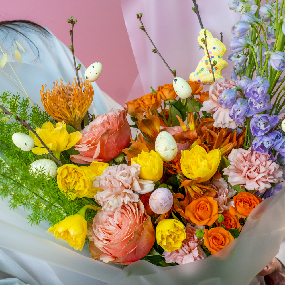 Состав букета: аспарагус - 3, роза кустовая бейби - 3, леукоспермум - 1, Хасмантиум - 3, альстромерия - 3, гвоздика - 5, дельфиниум - 2, нарцисс - 7, роза Эквадор 50 - 3, ветка персика - 1, подвеска кролик - 1, Яйцо набор 12шт - 3, Яйцо набор 36шт - 5, лента, упаковка.