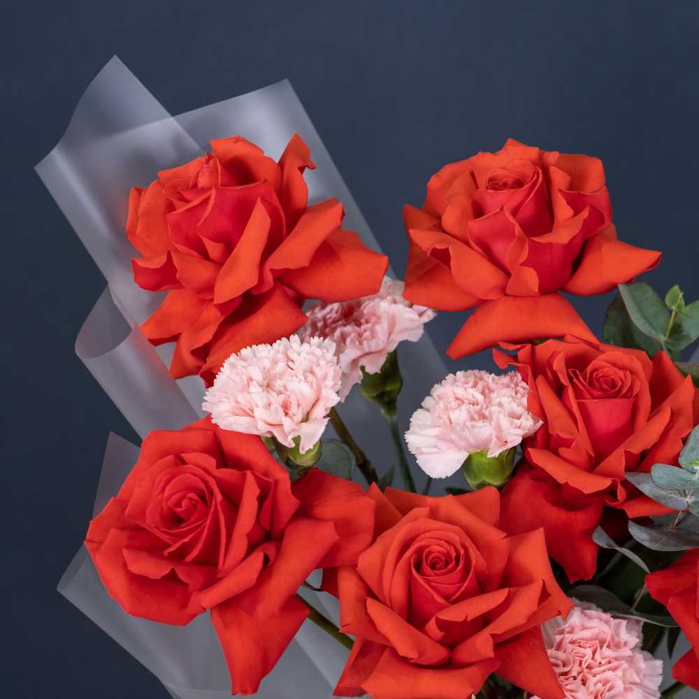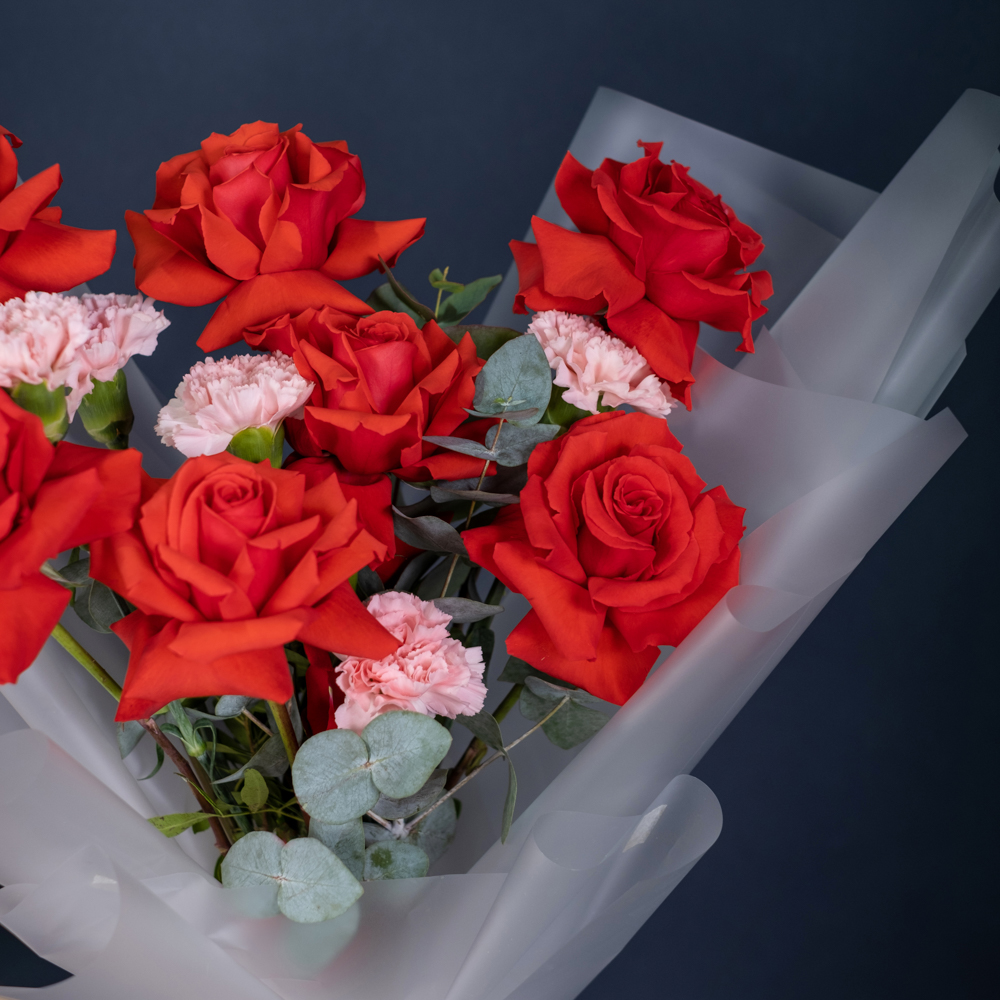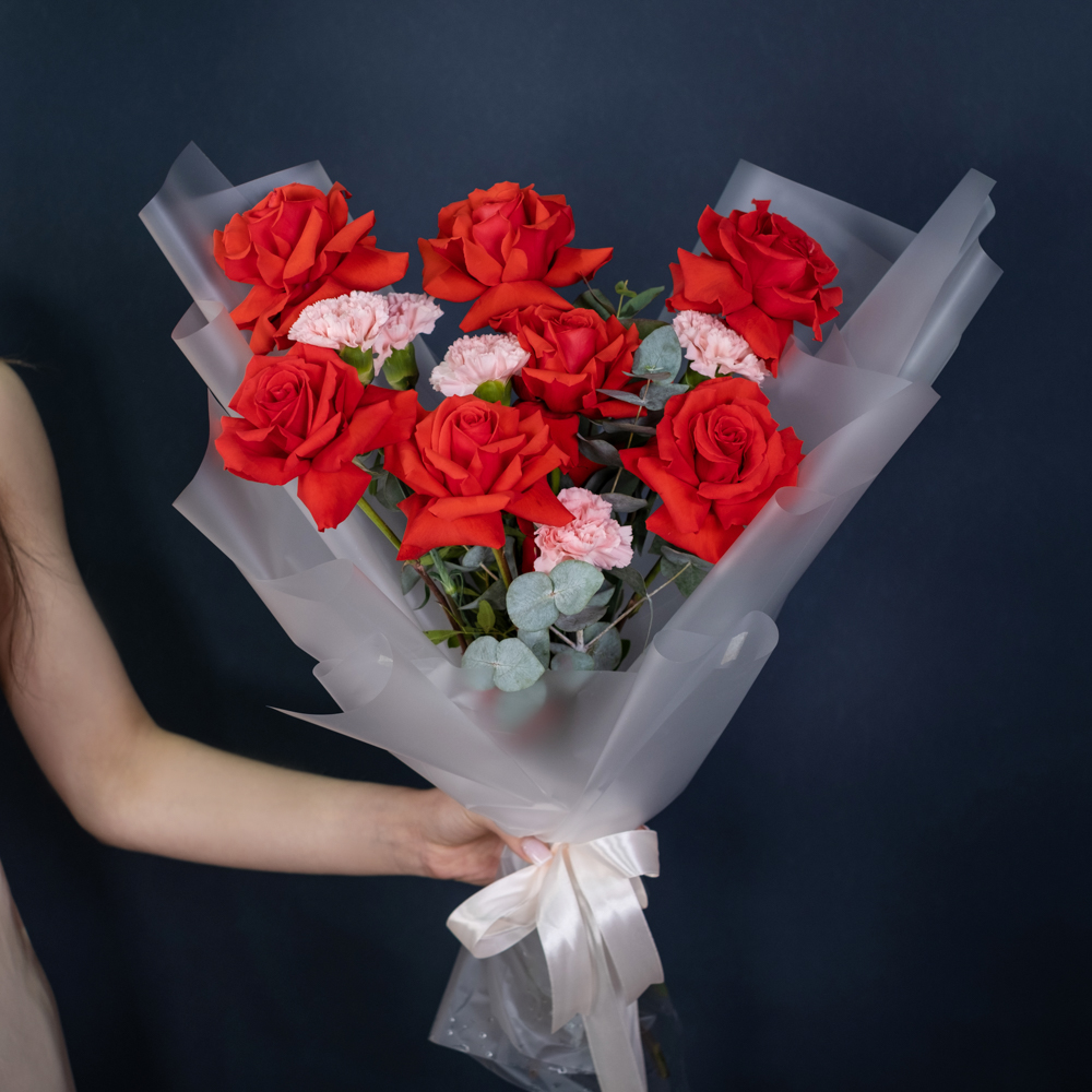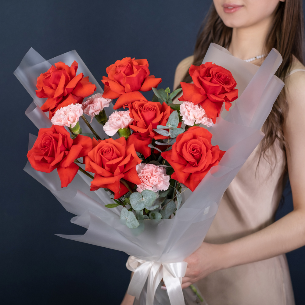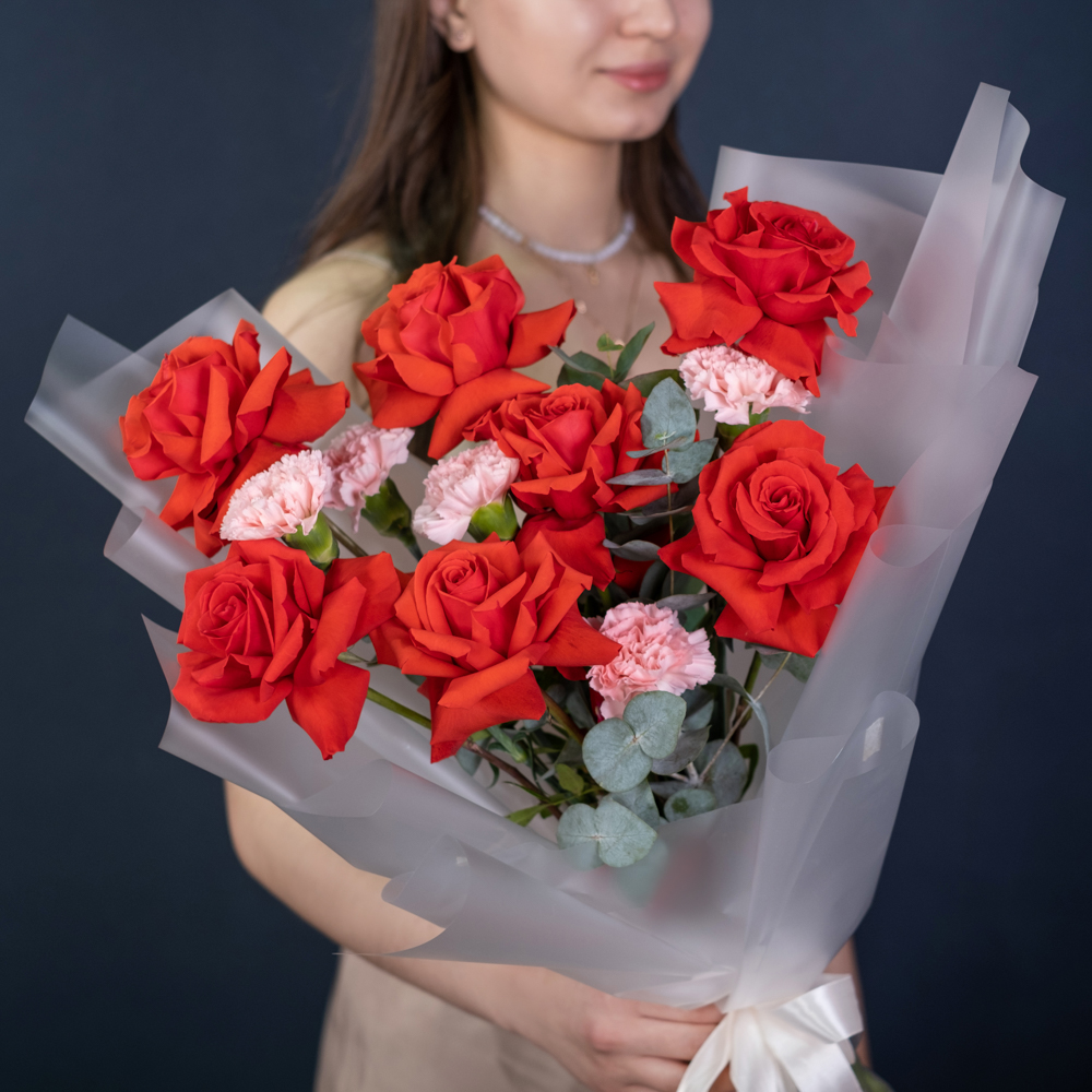 французская роза 7, гвоздика 5, эвкалипт 1, упаковка, лента
