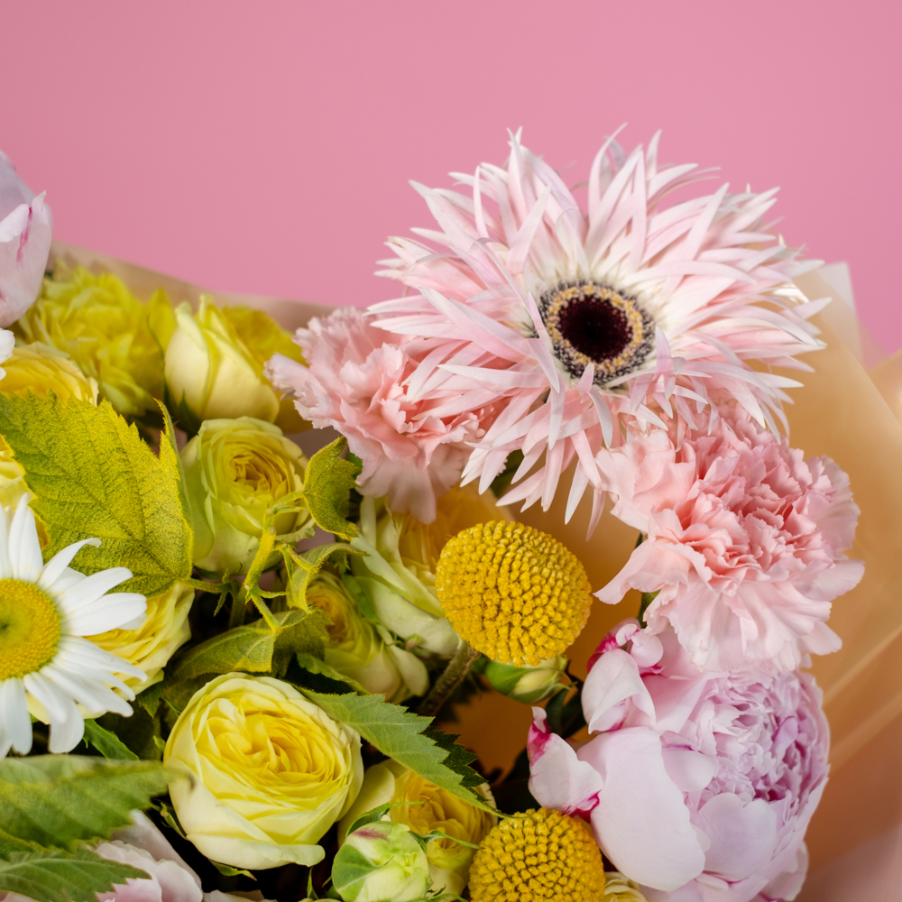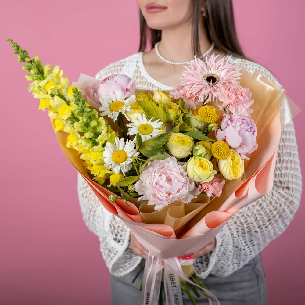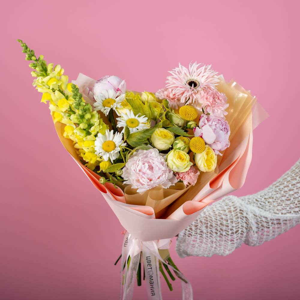 малина 1, роза кустовая 2, гербера 1, леуконтемум 3, антирринум 2, пион 3, гвоздика 3, краспедия 2, краска 0,2, упаковка, лента