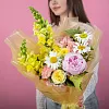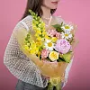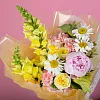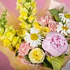 антирринум 2, леуконтемум 3, пион 1, гвоздика 3, роза кустовая 1, малина 2, пистач 1, упаковка, лентаКомплектация: