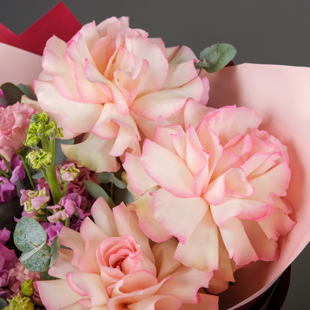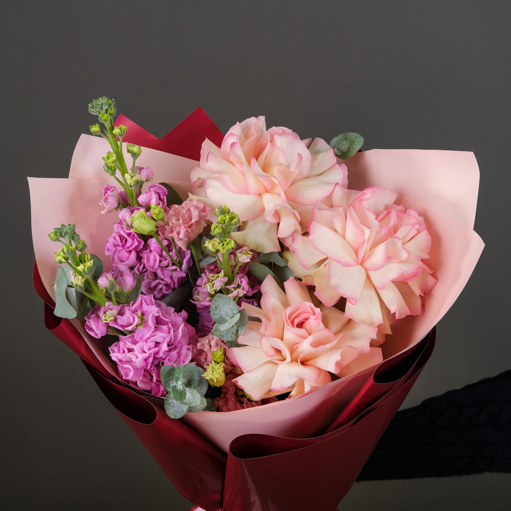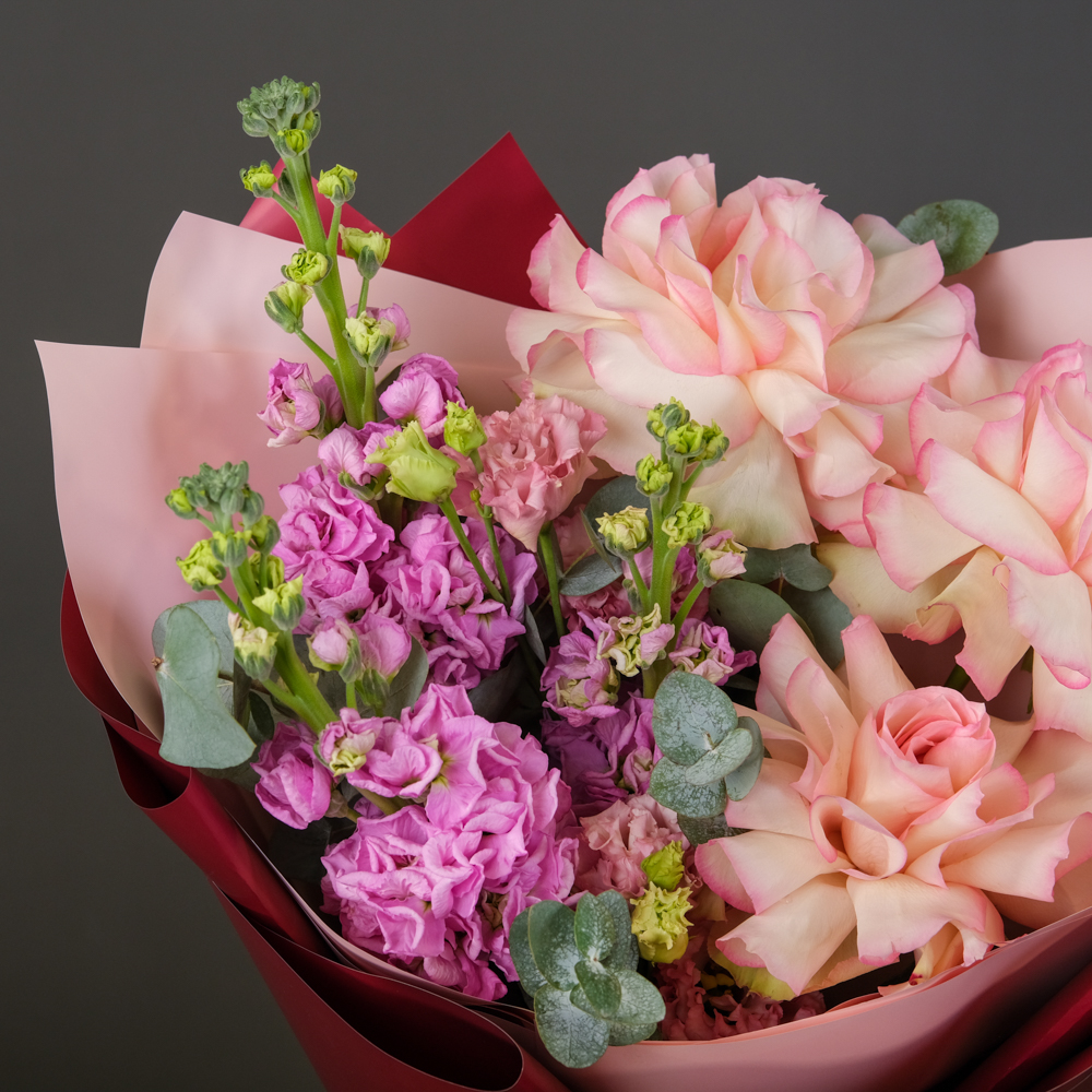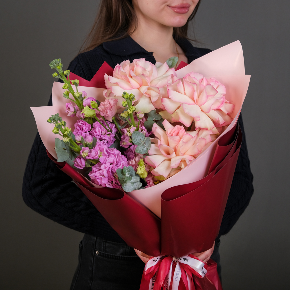 маттиола 4, французская роза 3, эустома 1, эвкалипт 1, упаковка, лента