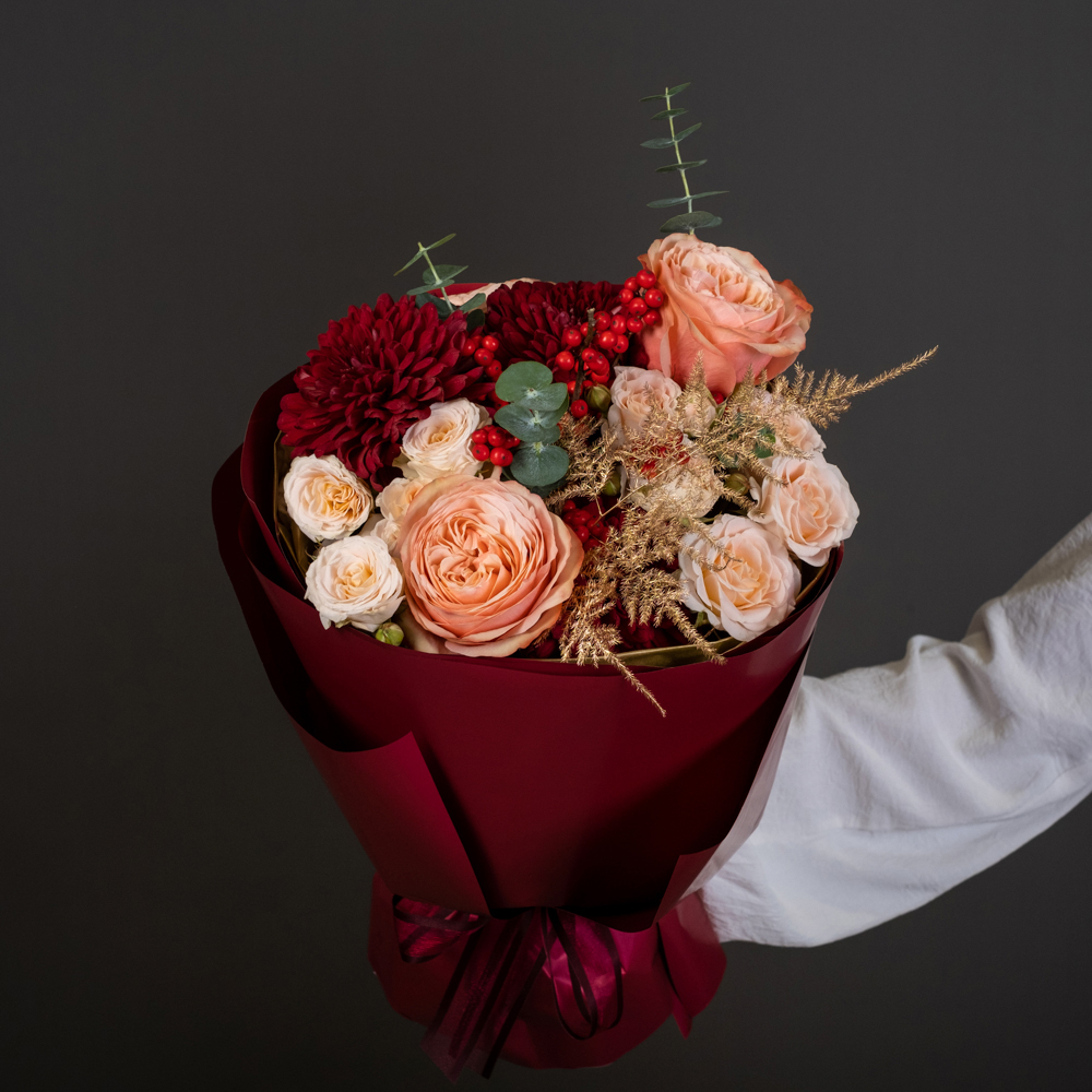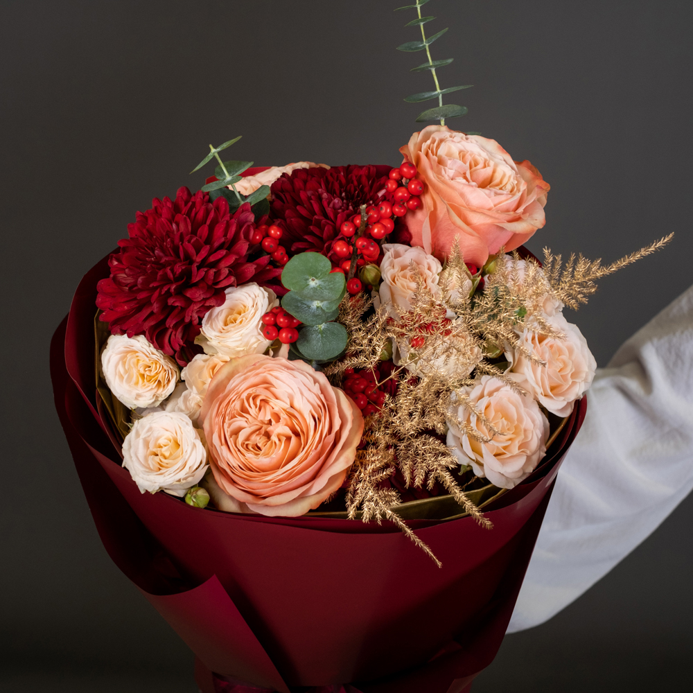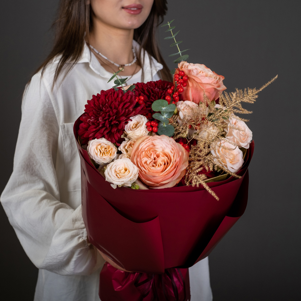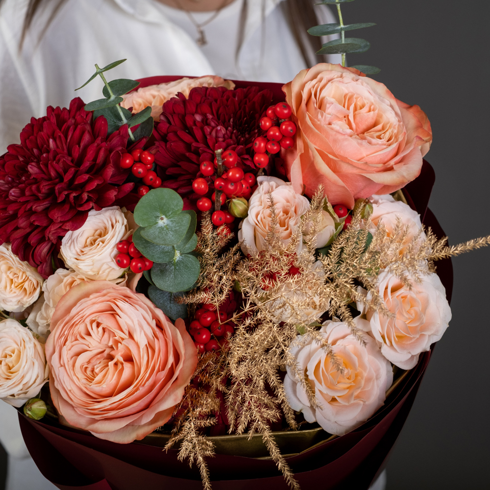 хризантема стандарт 2, роза эквадор 50 см 3, роза кустовая 2, илекс 1, аспарагус 2, эвкалипт 0,5, упаковка, лента