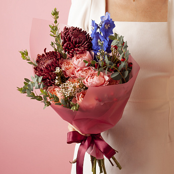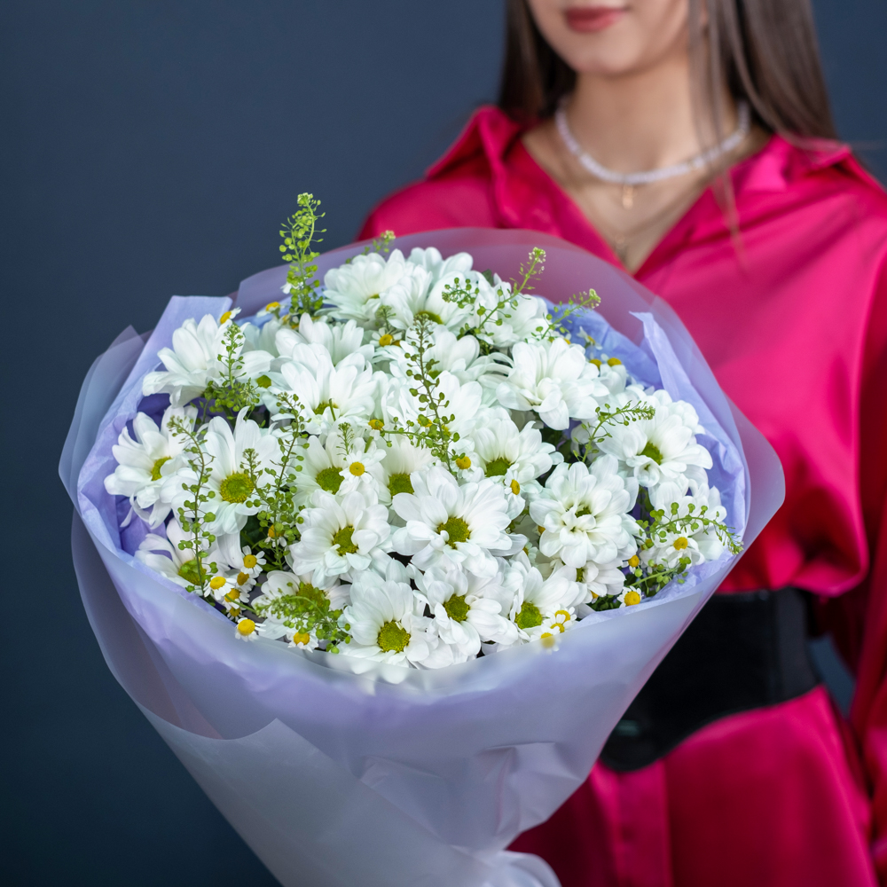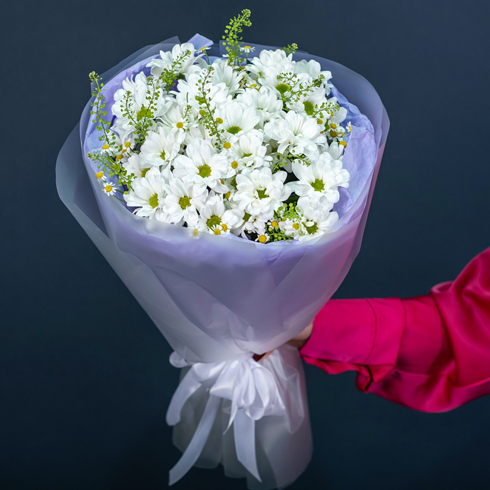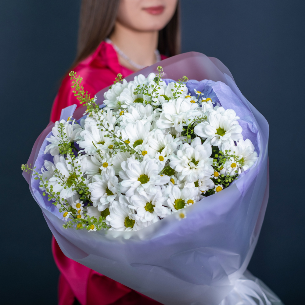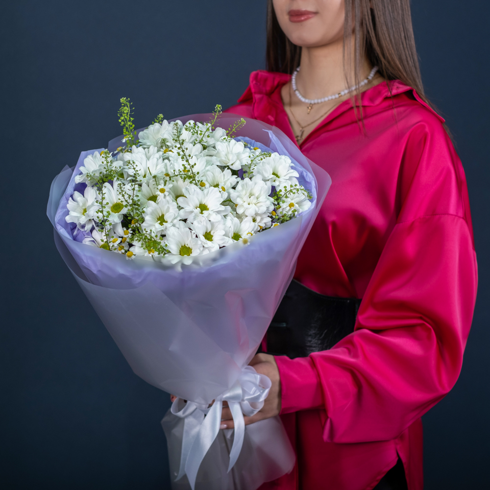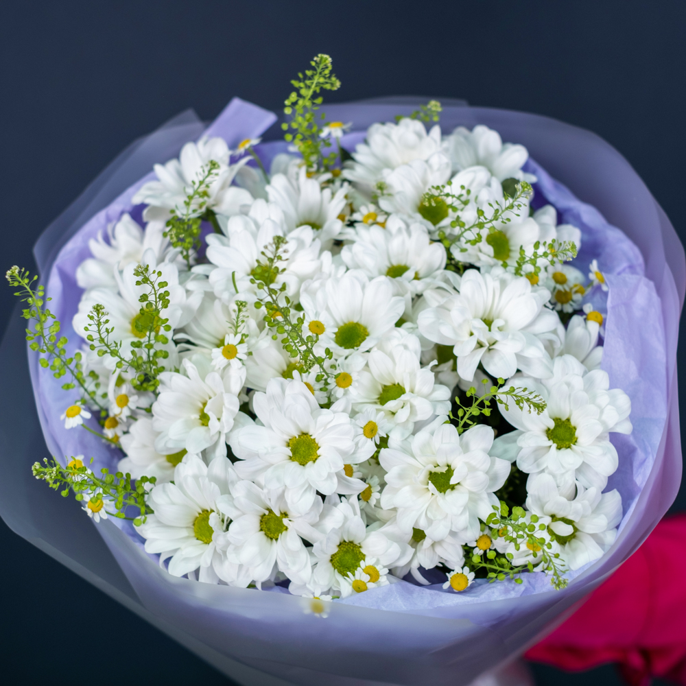 хризантема кустовая 5, матрикария 4, тиласпия 2, упаковка, лента