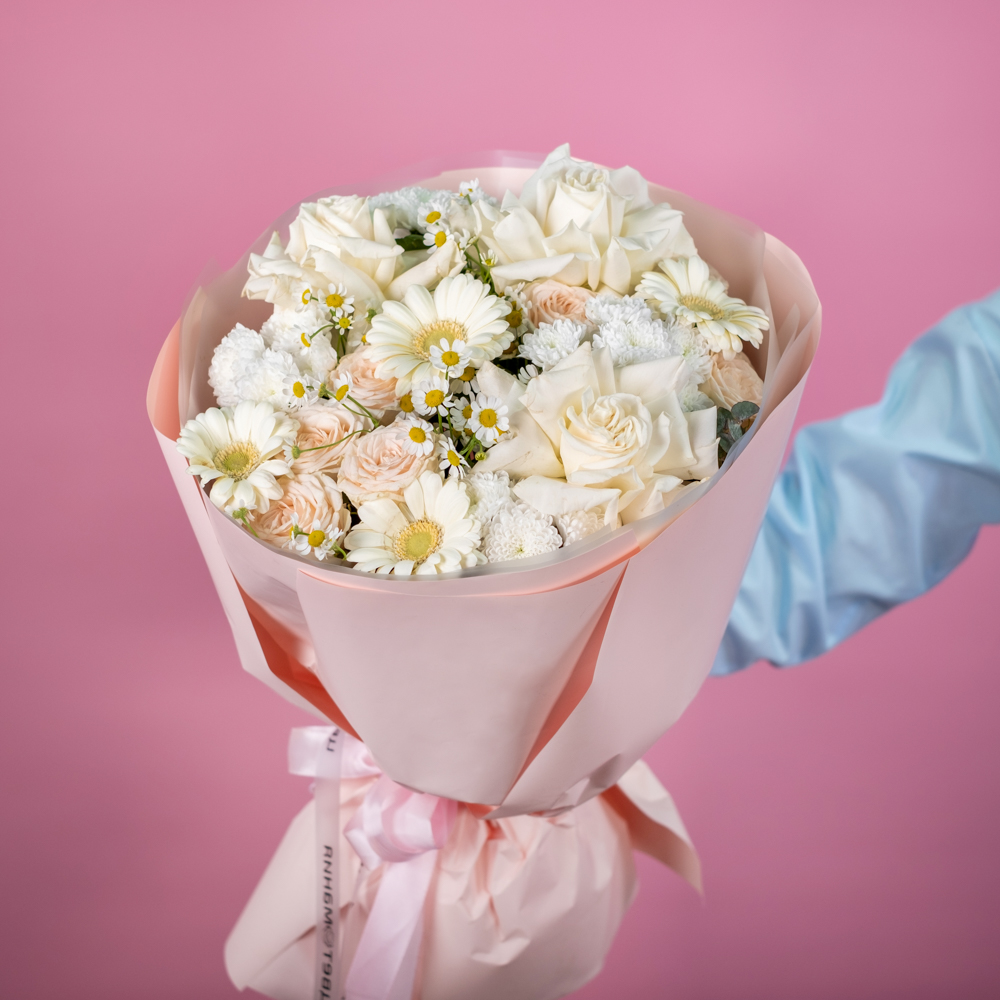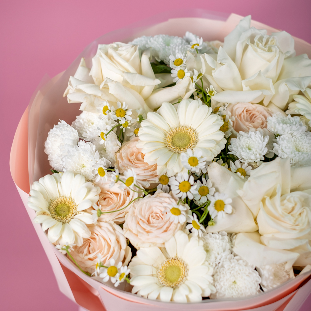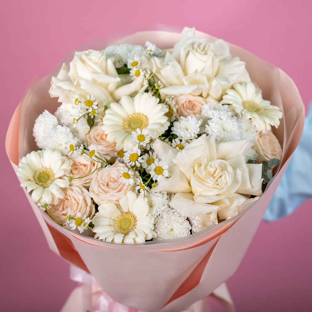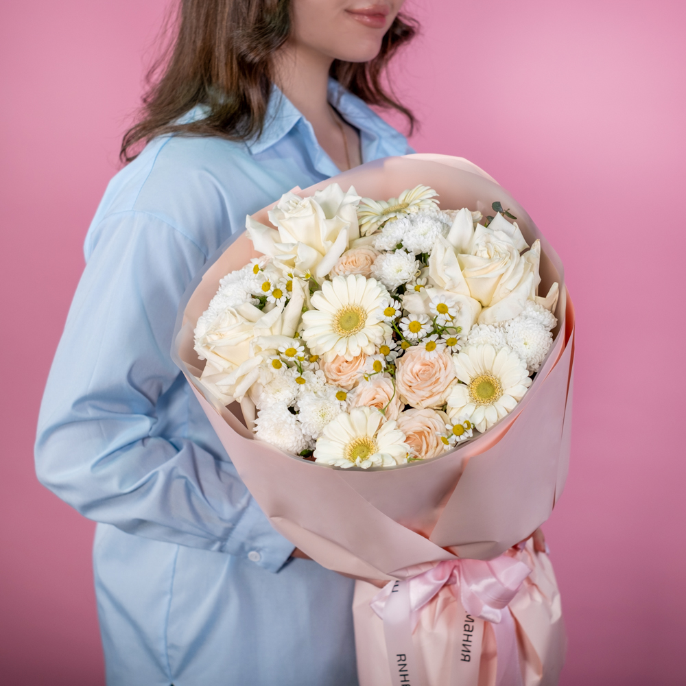 гербера мини 4, французская роза 3, пистач 3, хризантема сантини 4, роза кустовая софи 2, матрикария 2, упаковка, лента