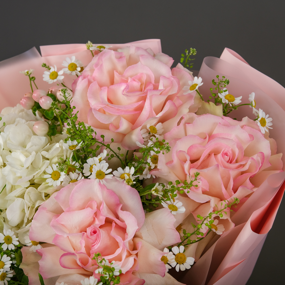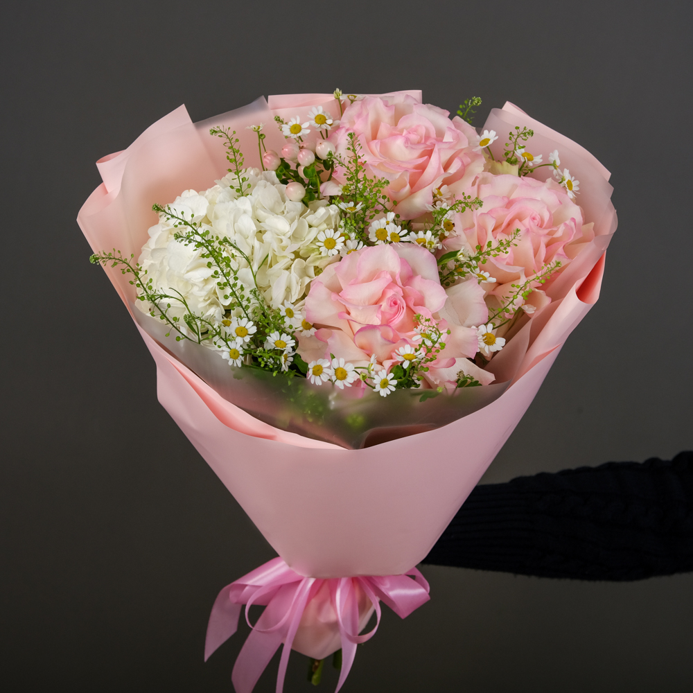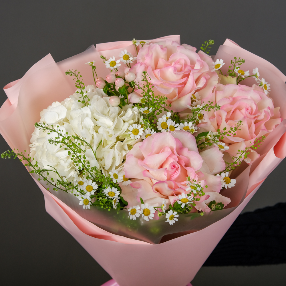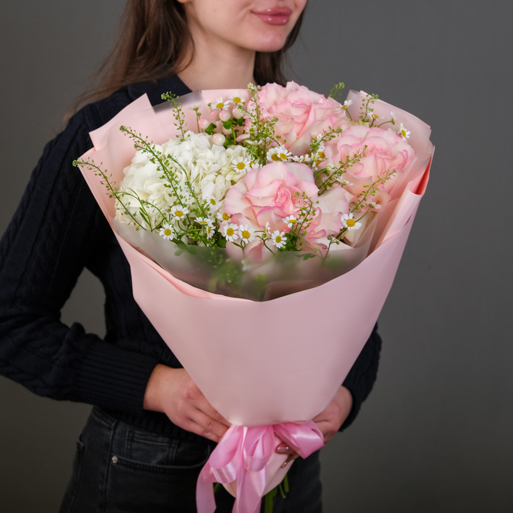 гортензия 1, французская роза 3, матрикария 3, гиперикум 1, тиласпия 1, пистач 1, упаковка, лента