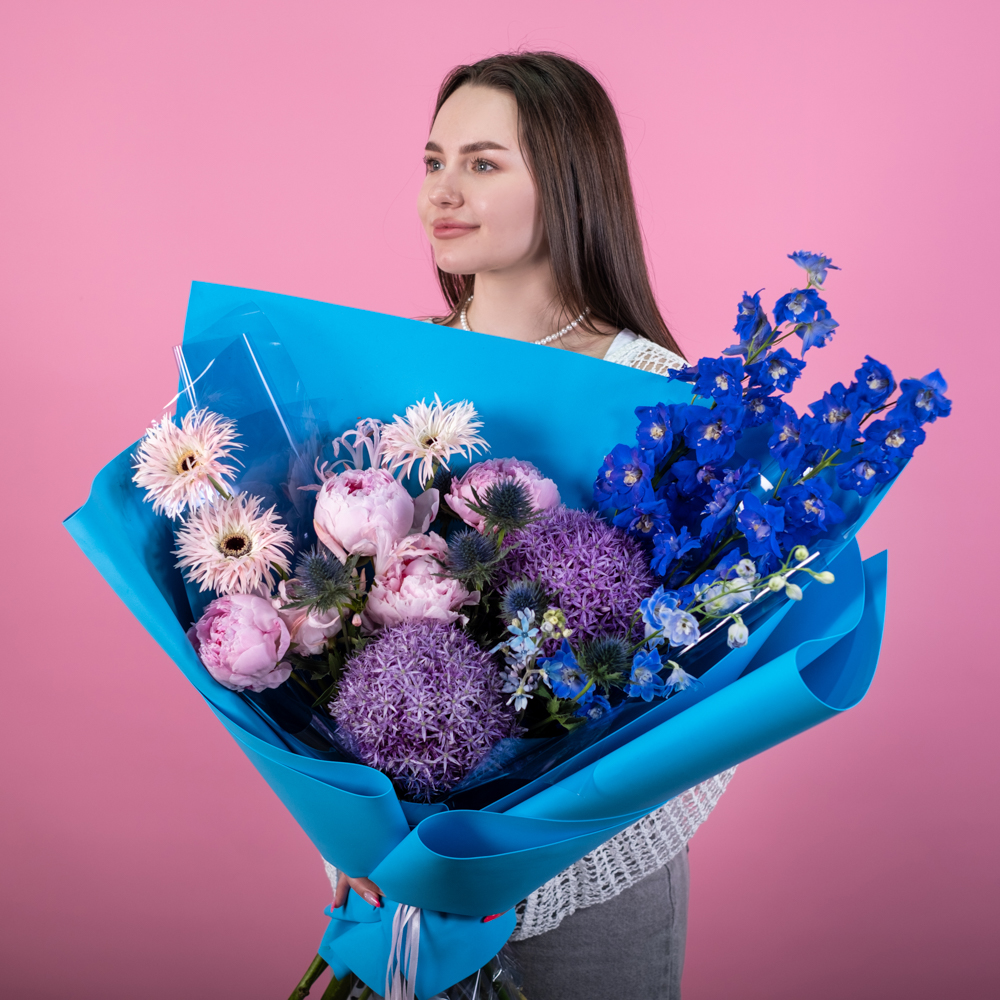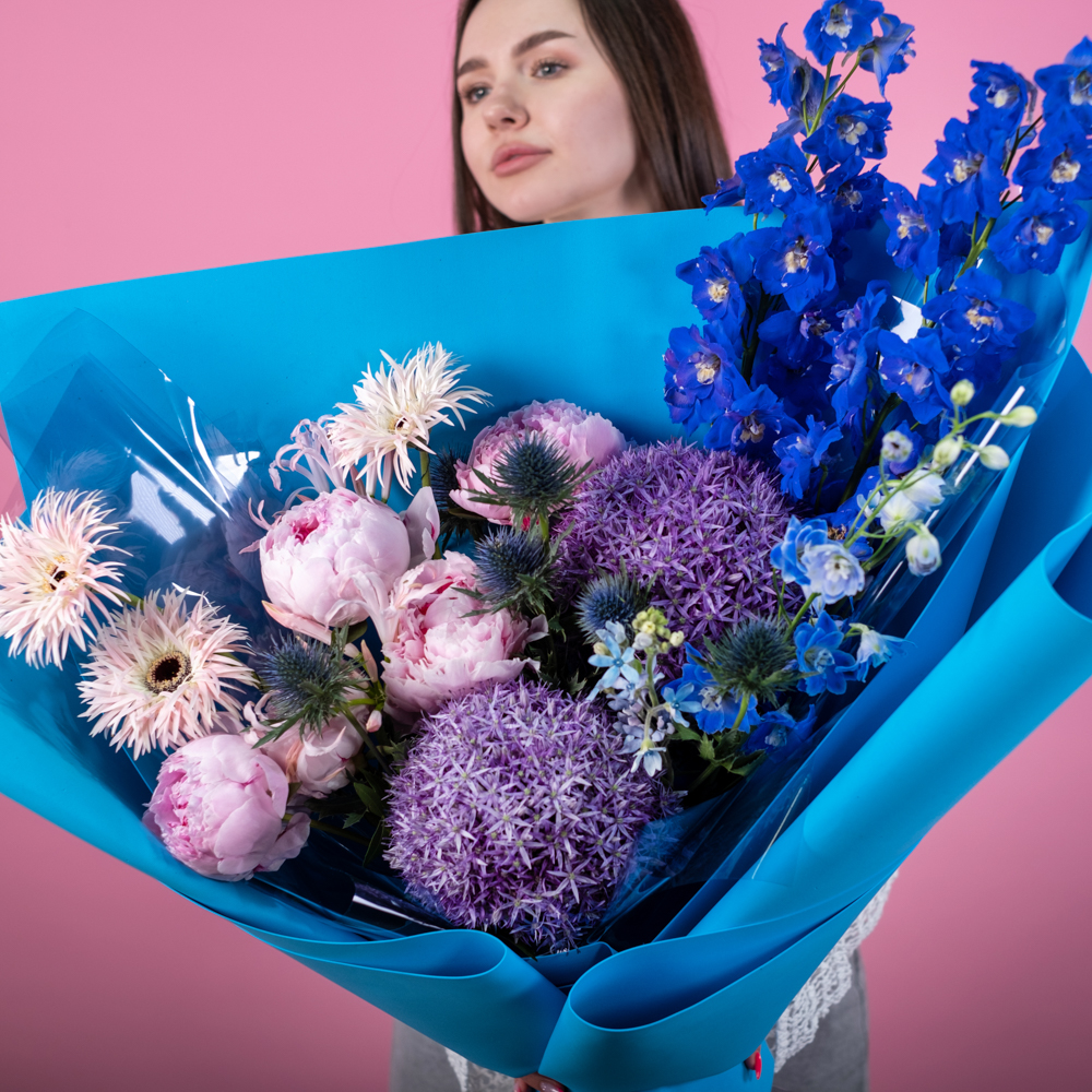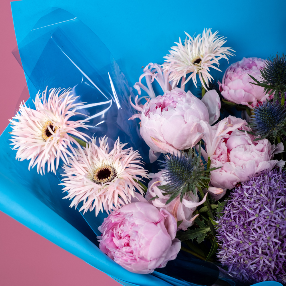 дельфиниум 3, пион 5, гербера 3, нерине 2, алиум 2, оксипиталум 2, эрингиум 3, пистач 3, упаковка, лента