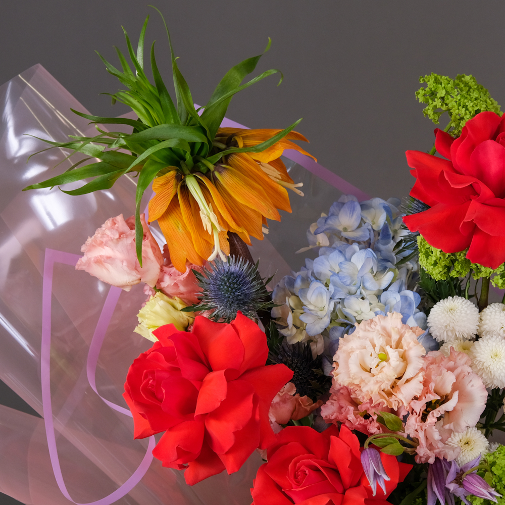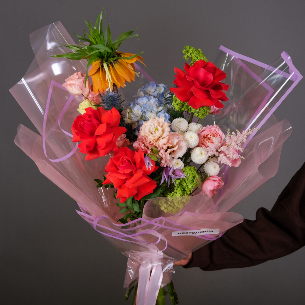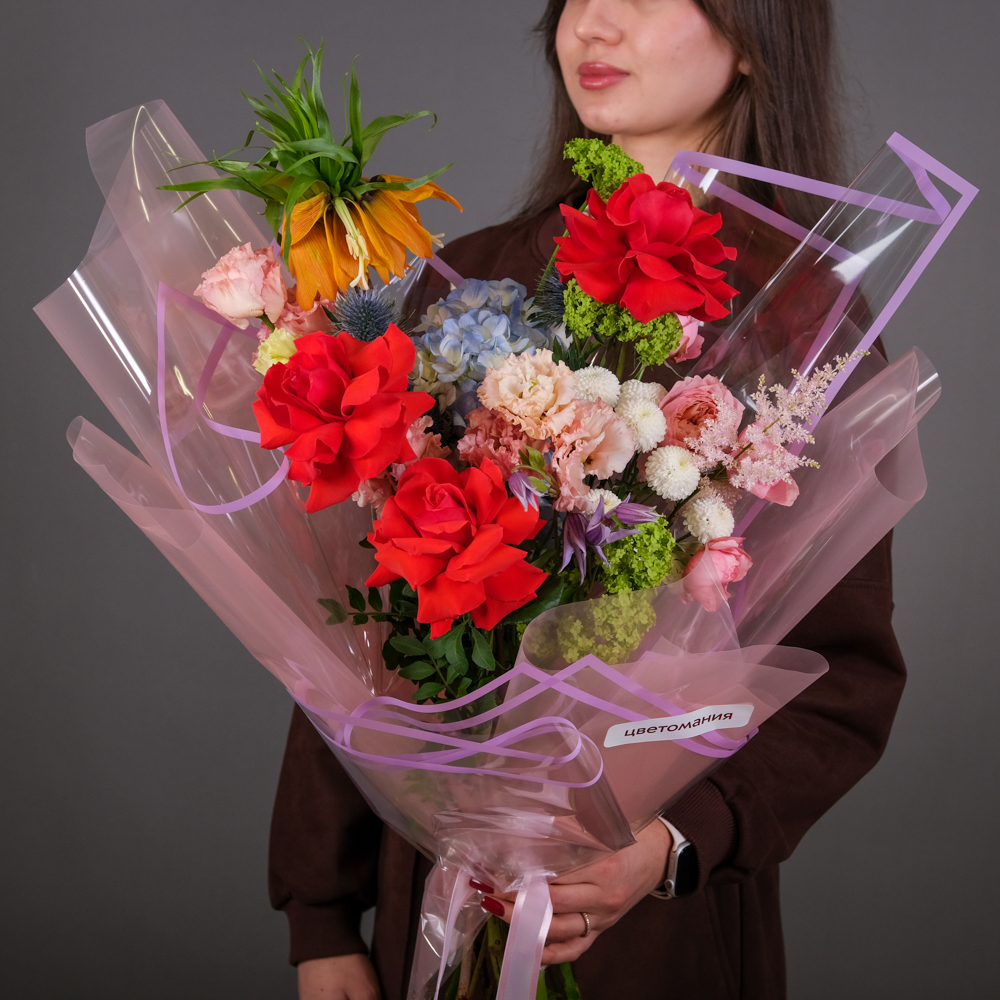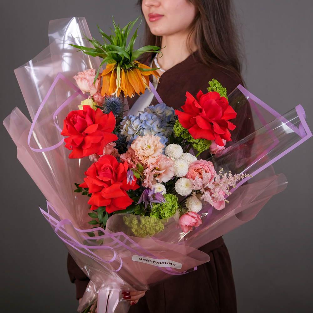 гортензия 1, фритиллярия 1, вибурнум розуем 1, эрингиум 1, эустома 2, астильба 1, хризантема кустовая 1, кустовая роза 1, роза французская 3, клематис 1, пистач 3, упаковка, лента