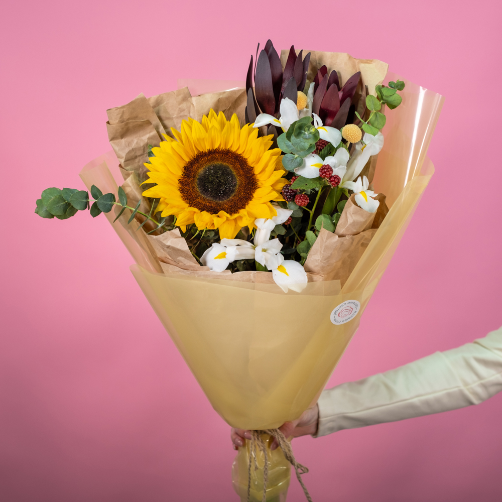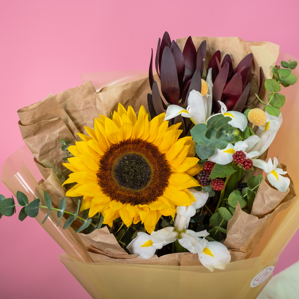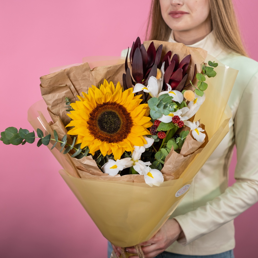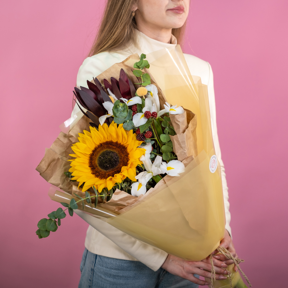 подсолнух 1, ирис 3, рубус 1, сафари 2, краспедия 3, эвкалипт 1, упаковка, лента