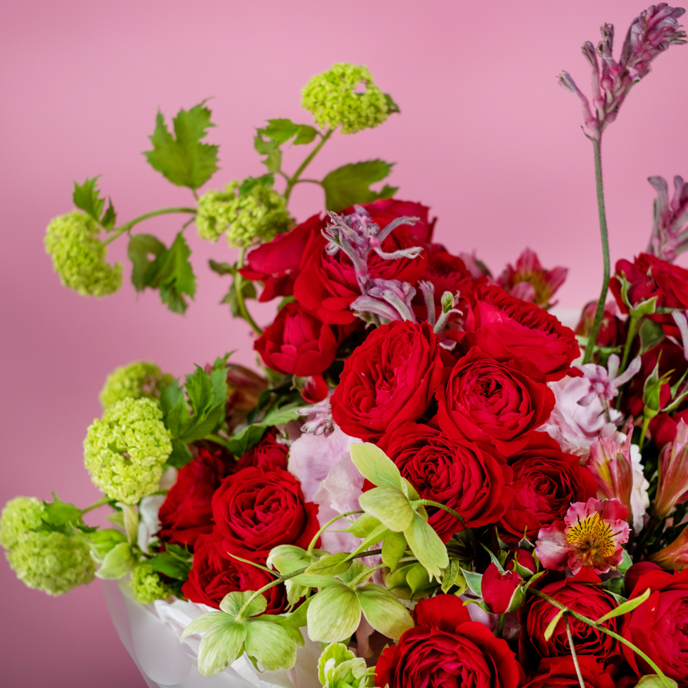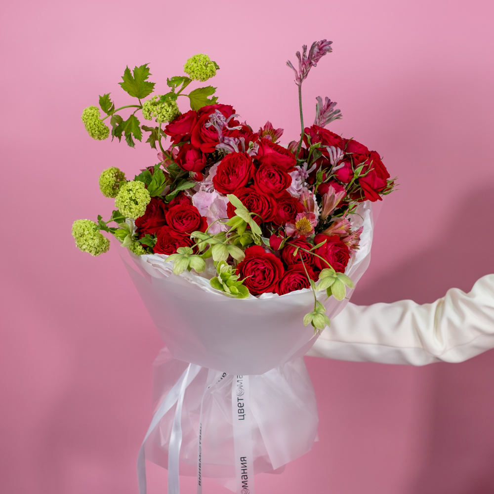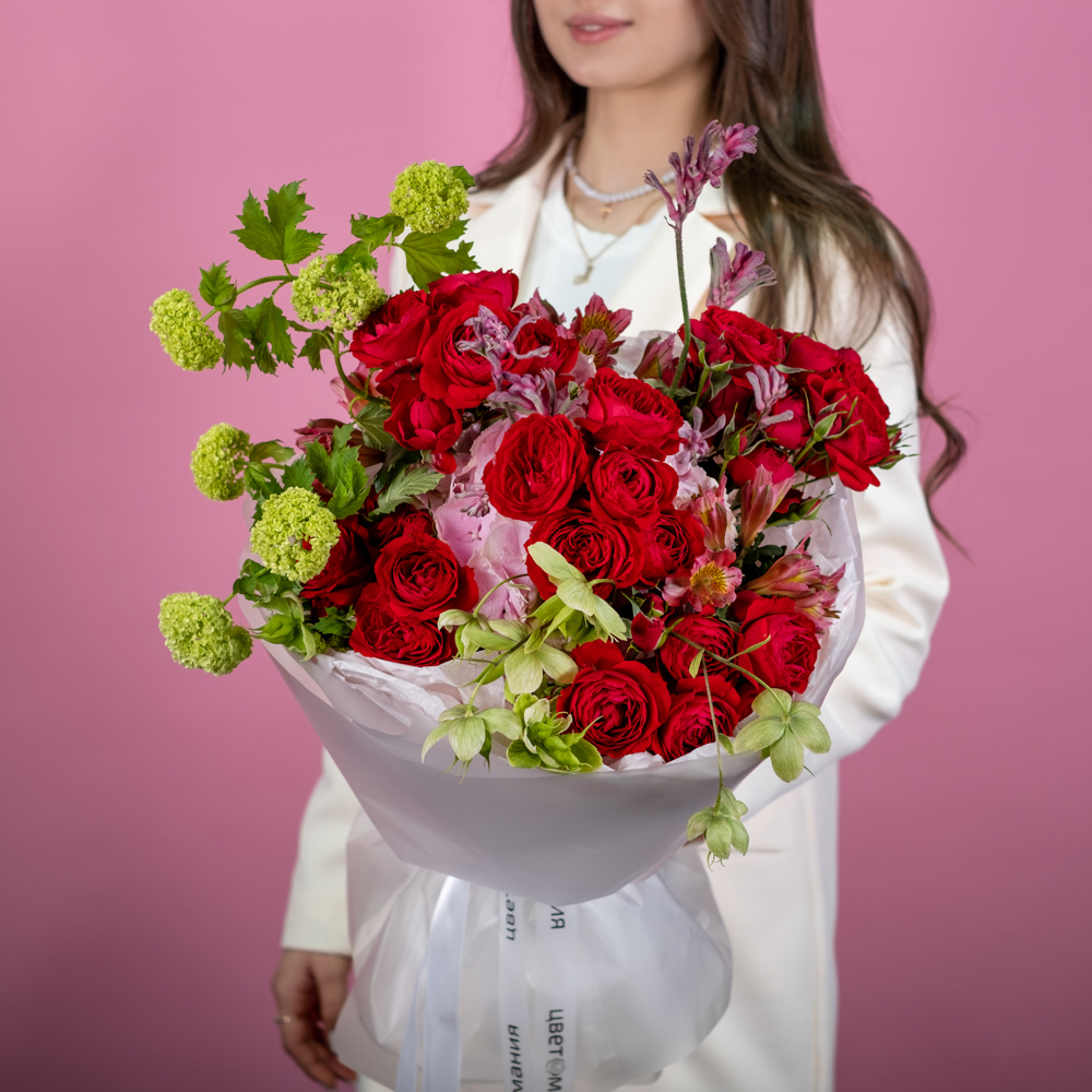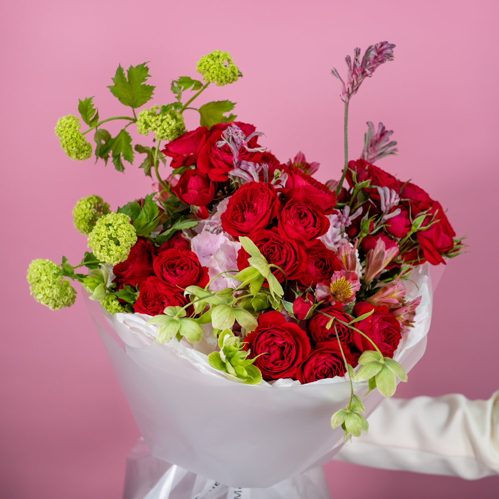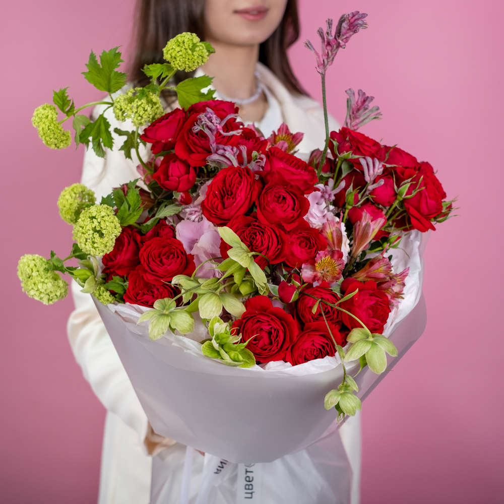 кустовая роза скарлетт 5, гортензия 1, альстромерия 3, анигозантус 2, вибурнум розеум 2, хелеборус 1, упаковка лента